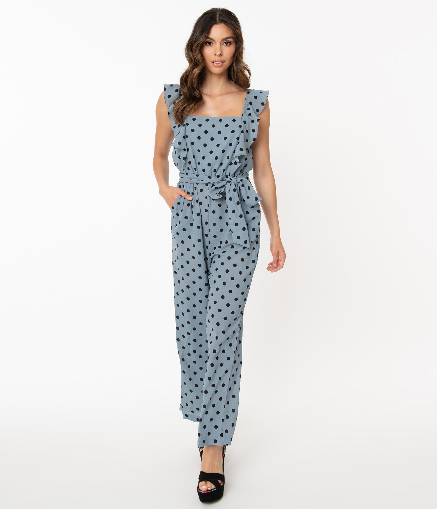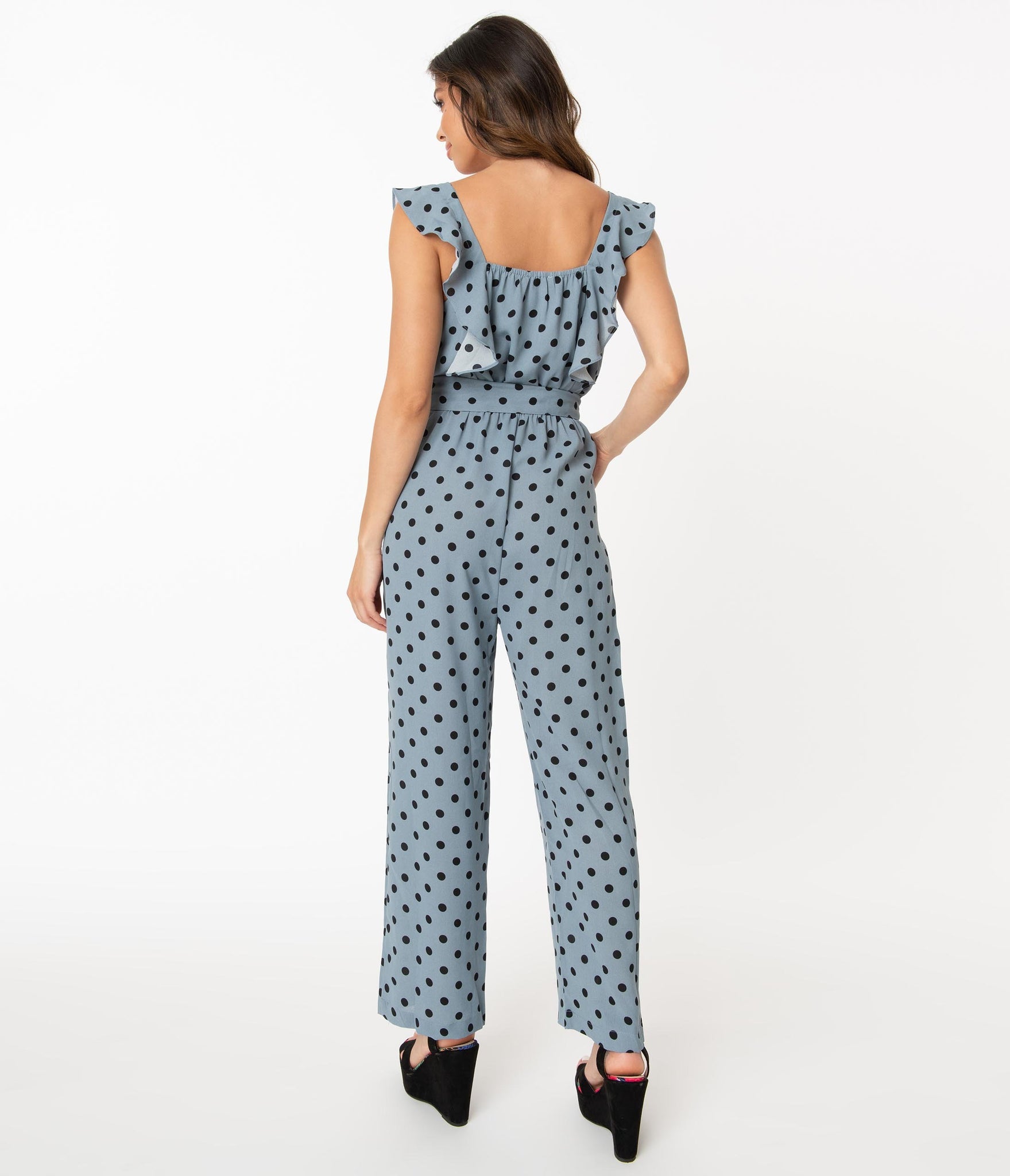 Posing perfection! A radiant retro silhouette, this sweet jumpsuit is crafted in a lightweight woven fabric, hypnotizing with black polka dots throughout a dusty blue background. The sultry sleeveless bodice is flirtatious with ruffled straps while the elastic waist is embellished with a matching sash. The sweeping legs drop to your ankles, outfitted with side pockets for modern function!