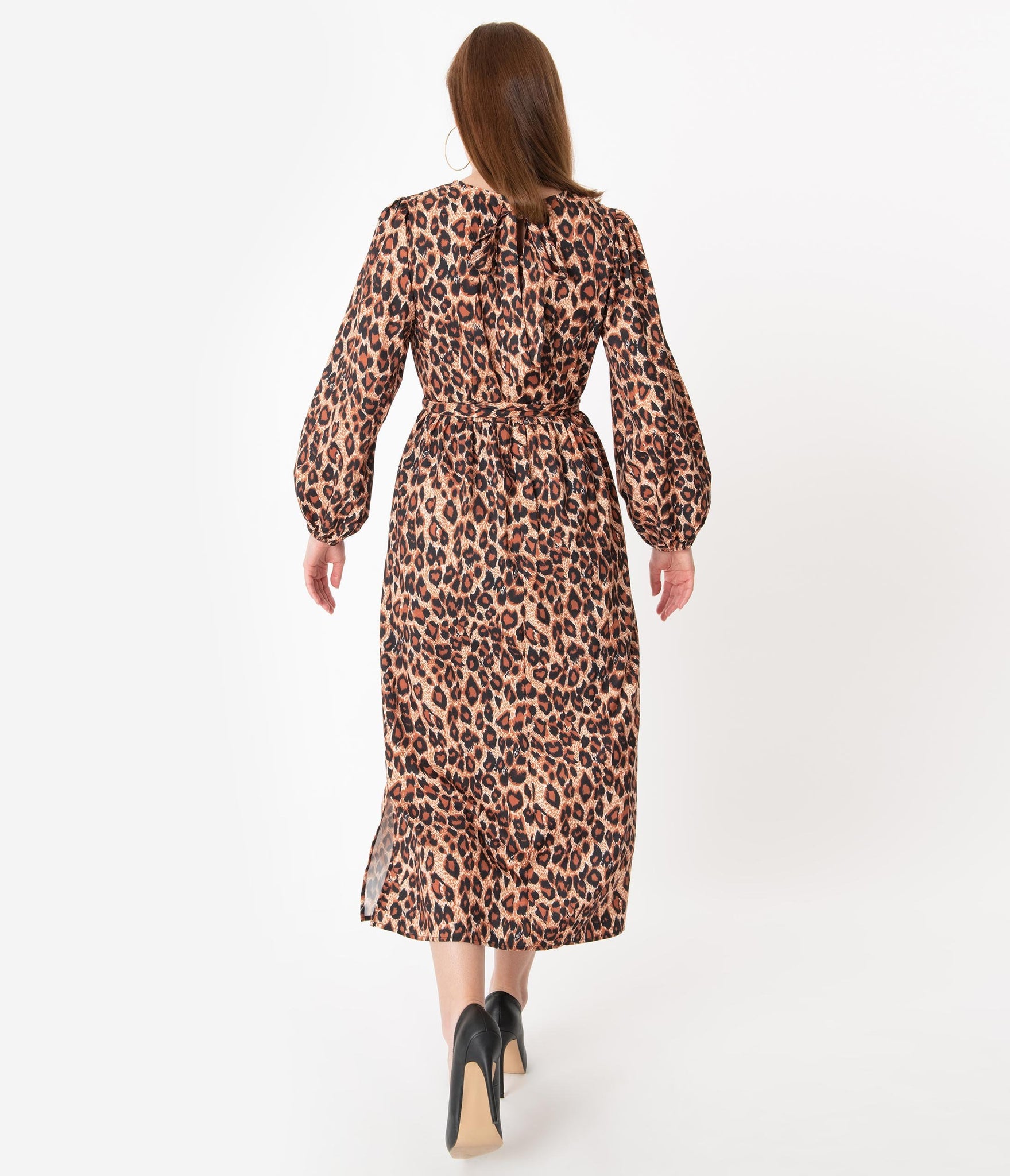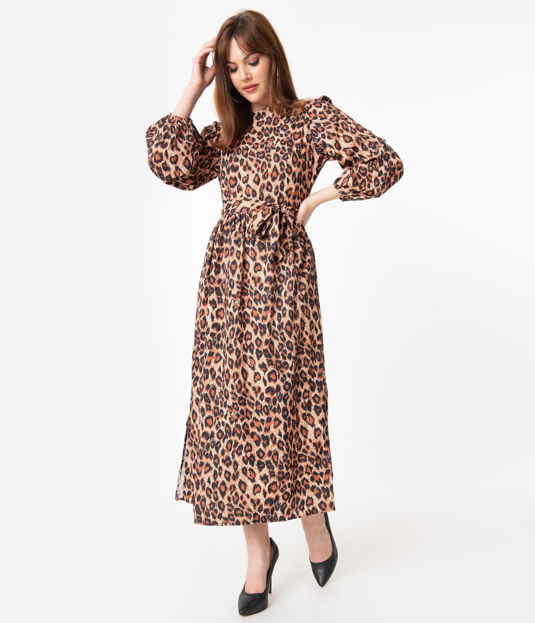 You don't need to tell us twice, dear! A ravishing retro-inspired long dress, this stunning silhouette radiates a wild leopard print throughout the lightweight woven fabric. The modest darted bodice is framed by billowing three-quarter length sleeves that drop into an elastic cuff while the crew neckline is secured with a self tie bow keyhole in the back. The seamed waist is nipped in with a matching sash while the sweeping long skirt gathers at your waist and drops to a straight hem just about your ankles with side vents for stealthy movement. Outfitted with a back zipper, make a run for this one!