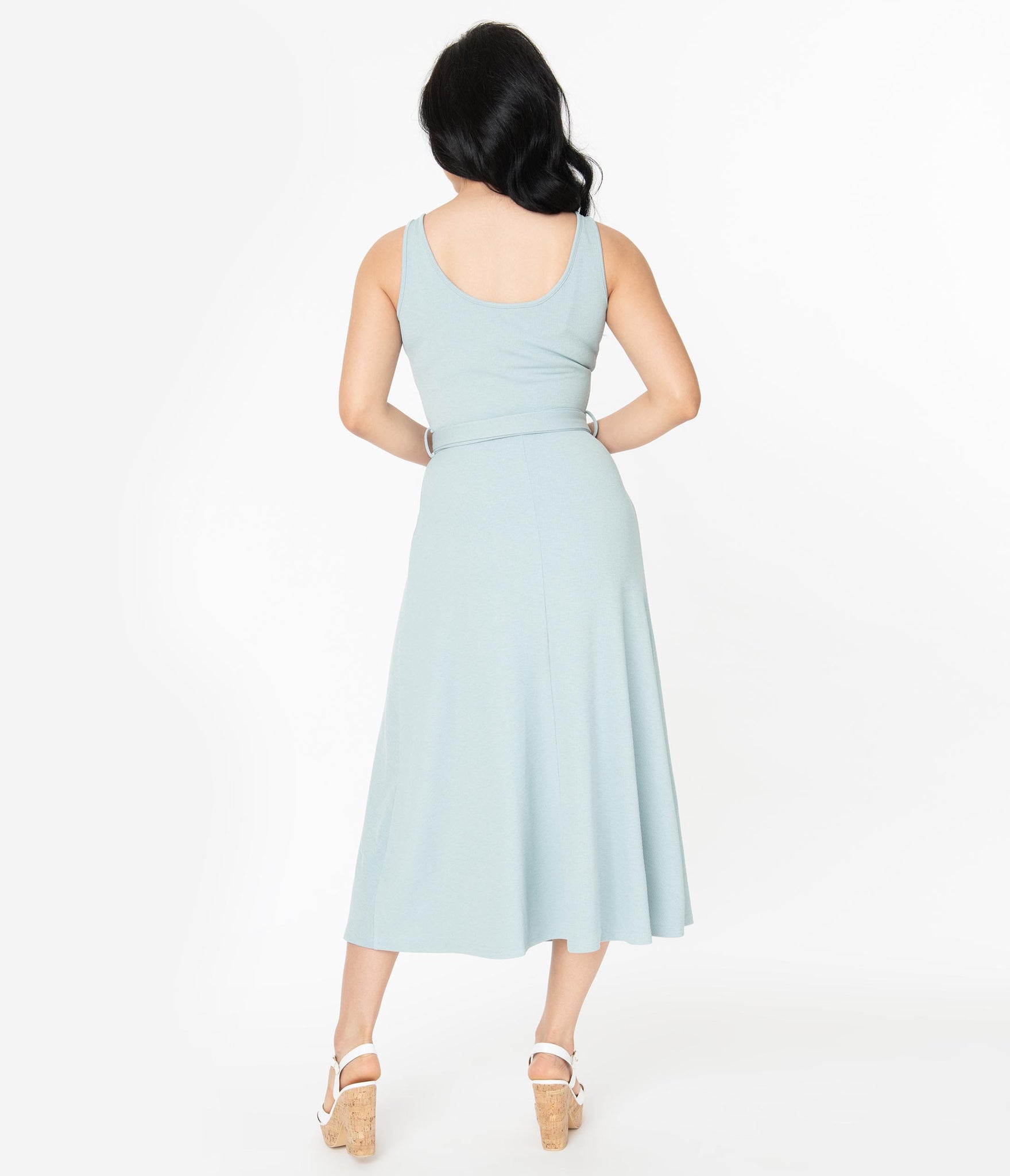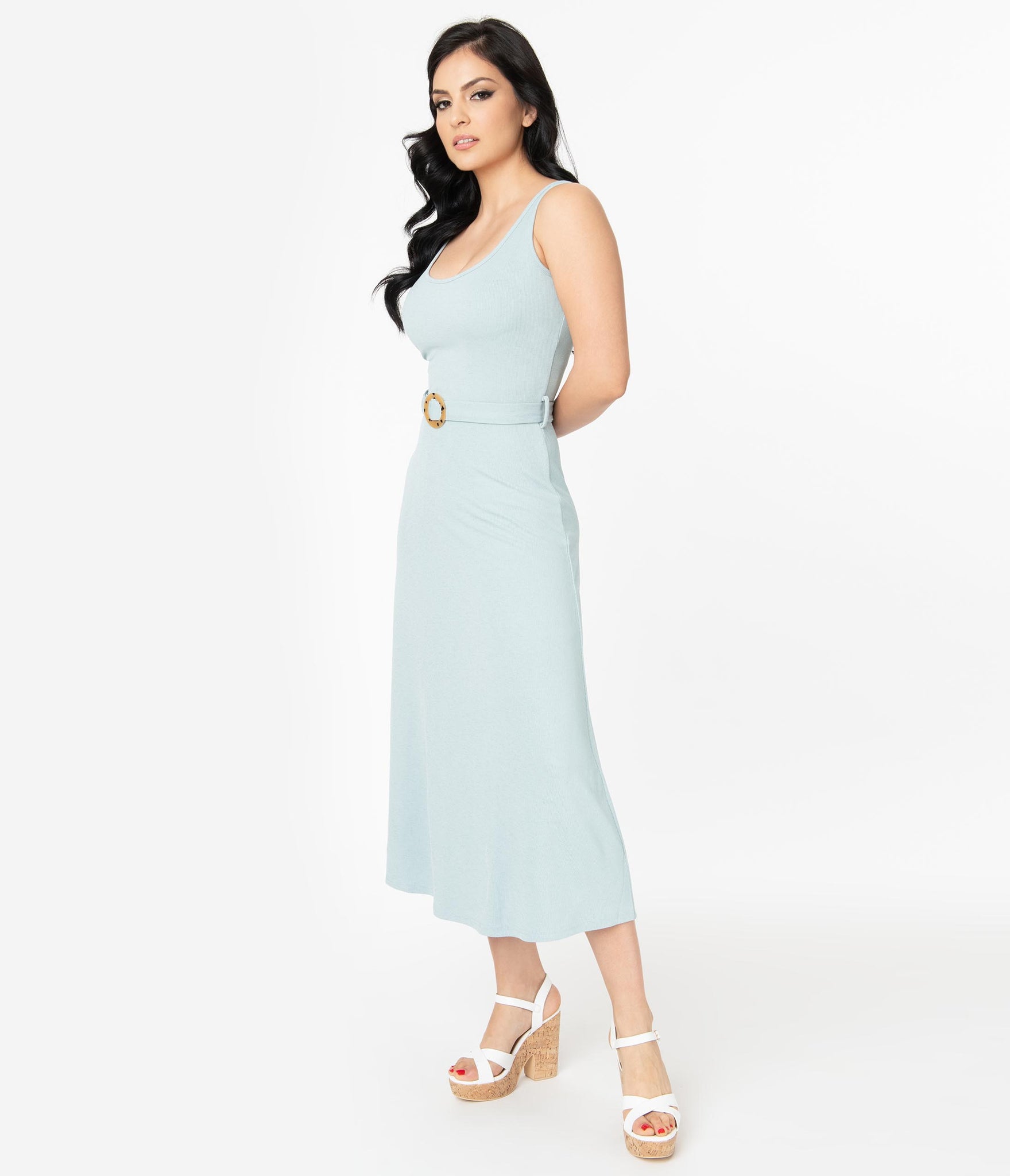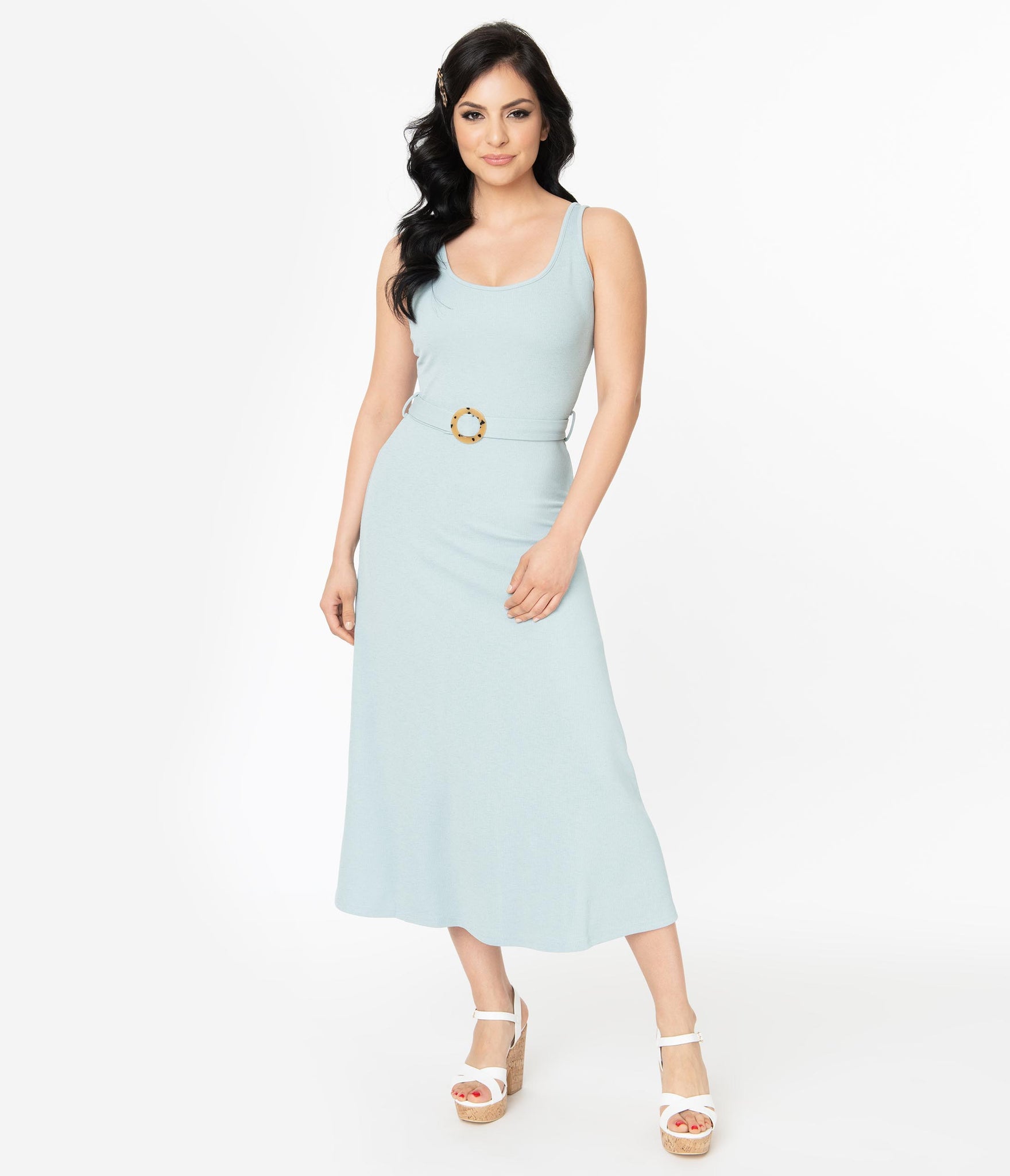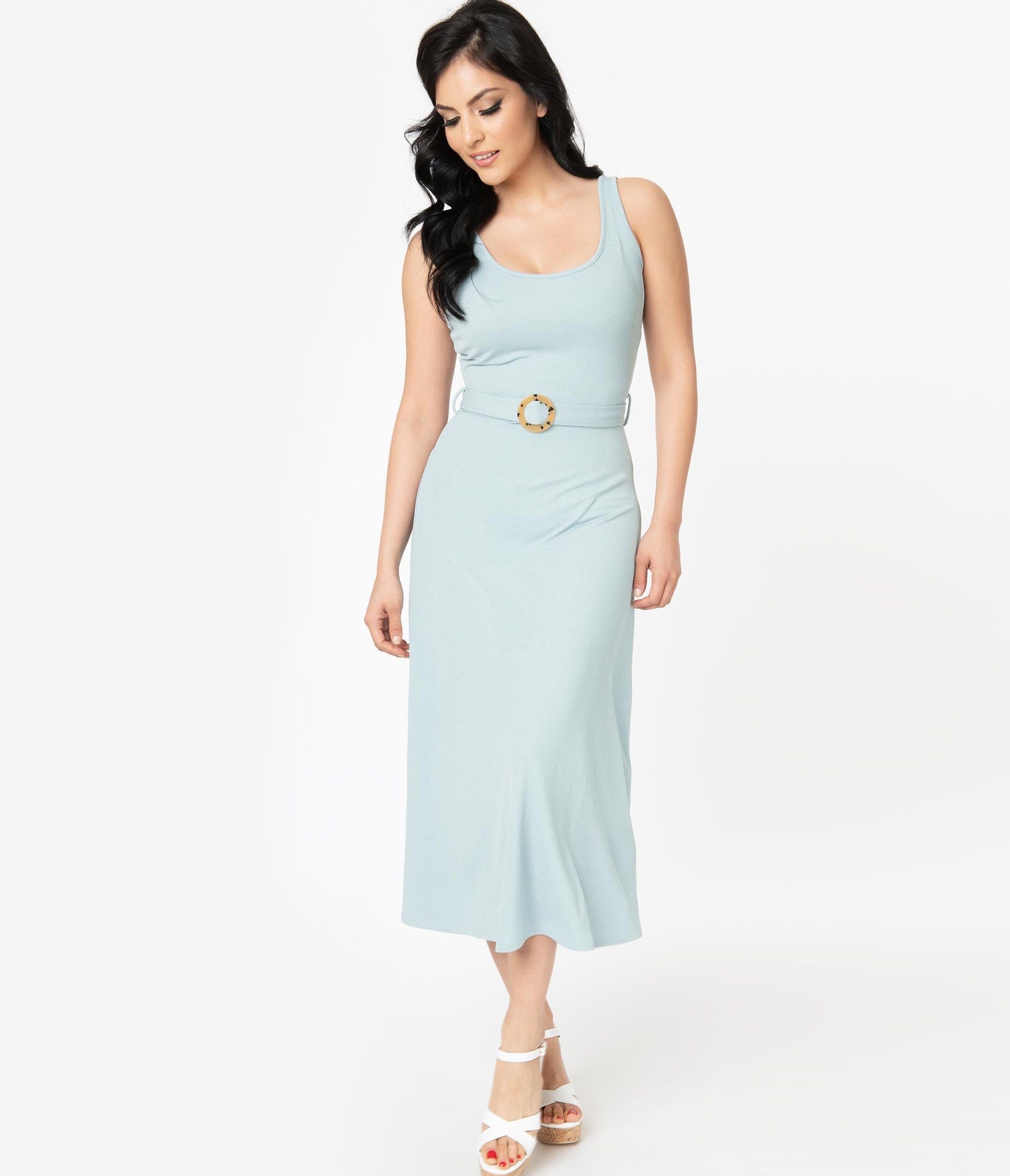 Style and comfort, darling! This chic light blue midi dress is cast in a thick stretch material perfect for that transition between seasons. A removable self-tie belt is finished with a light tortoiseshell round belt buckle to amp up this piece. This sultry midi-length frock is balanced out with the sleeveless style and scoop neckline both back and front. Make a statement and hit the dance floor, babe!