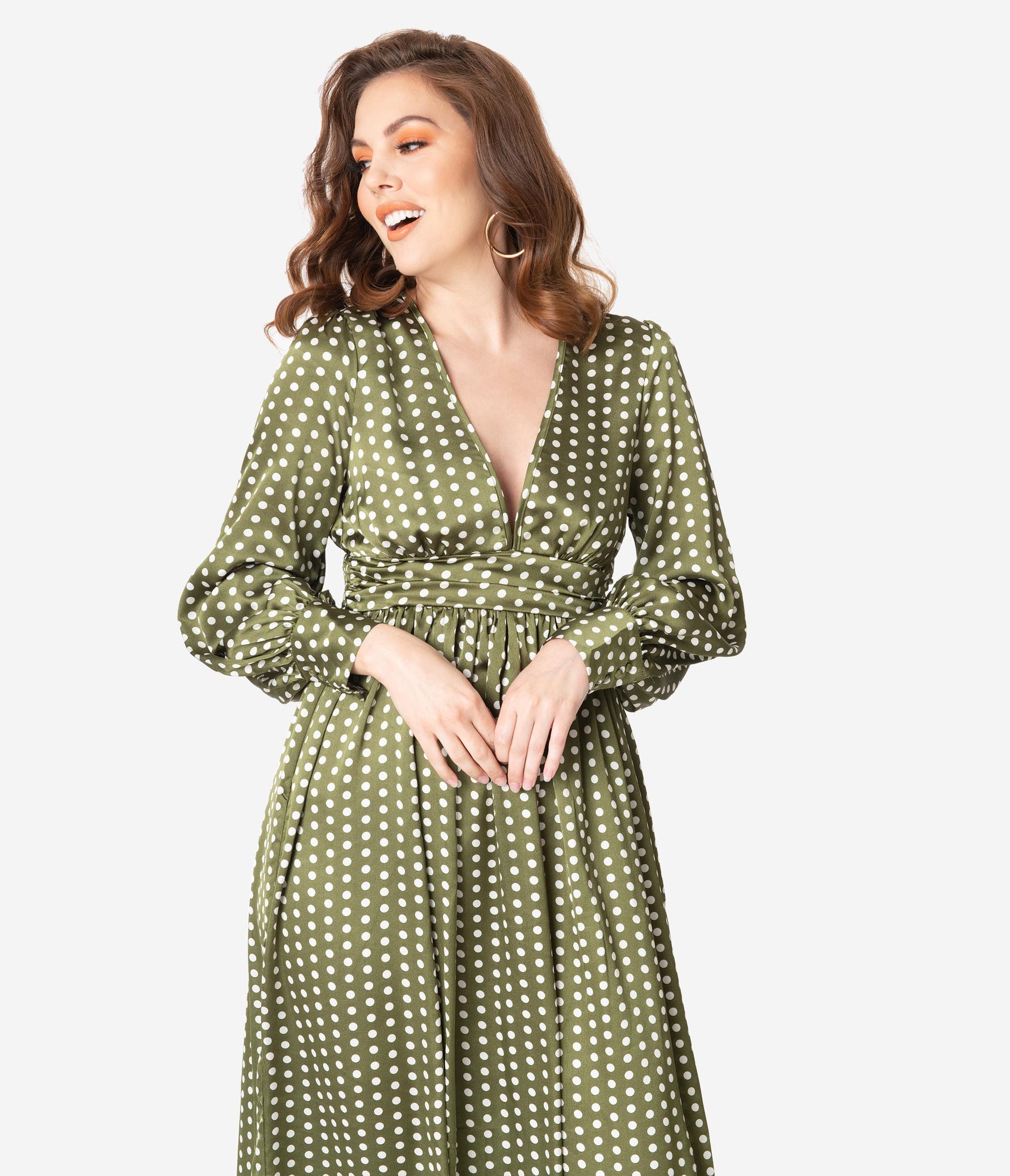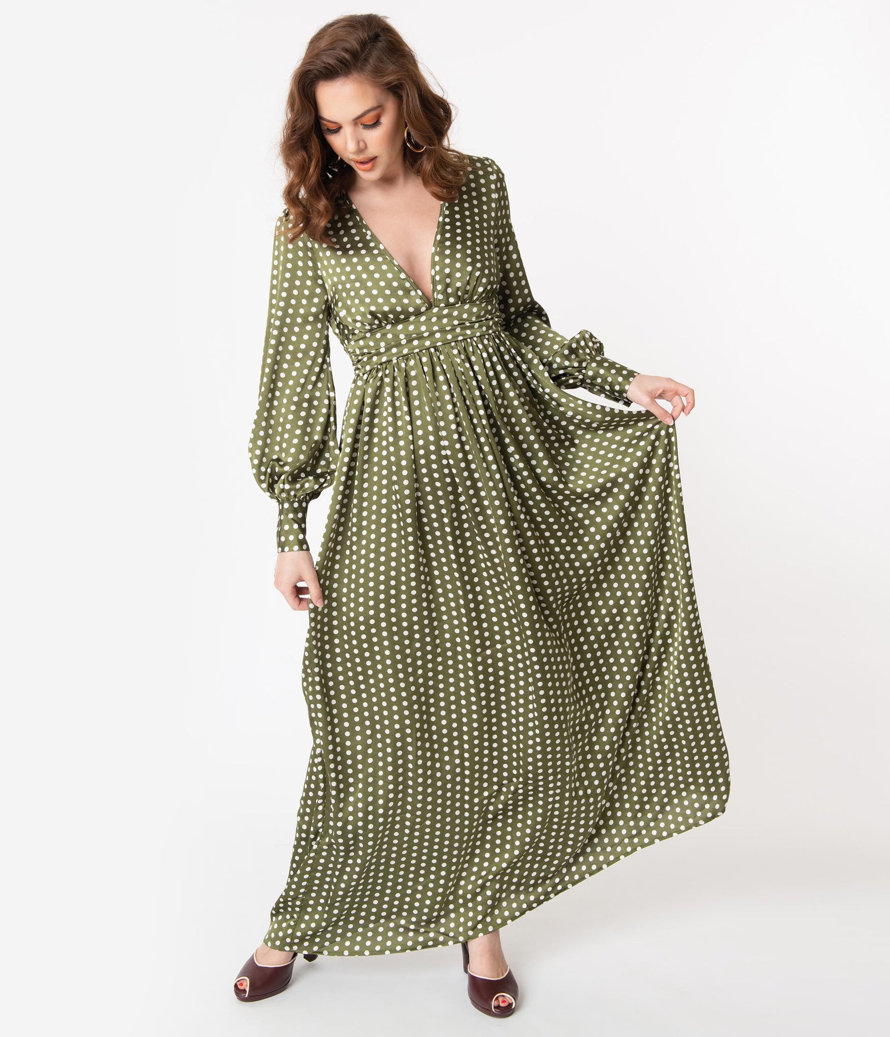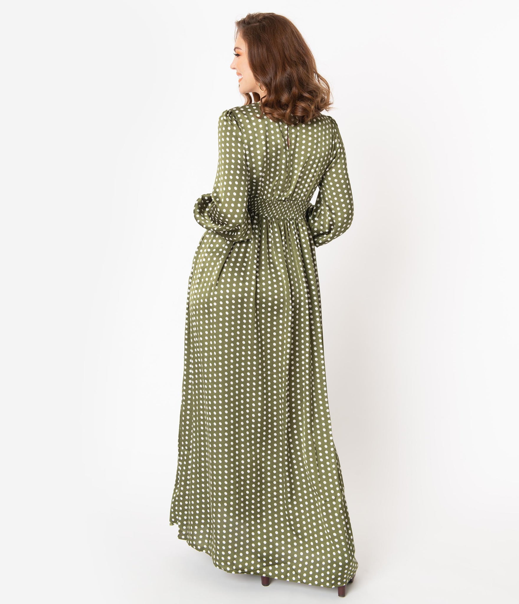 Dot your wardrobe, darling! This lightweight vintage inspired maxi dress is a beautiful addition with an airy satin-like fabric cast in a fabulous moss green with beautiful ivory polka dots cascading throughout the 1970s silhouette. The sultry V-neckline drops into a sweet banded waist while elegant long puff sleeves feature marvelous button cuffs. The sweeping skirt gathers at the waist and drops to your ankles for marvelous maxi form!