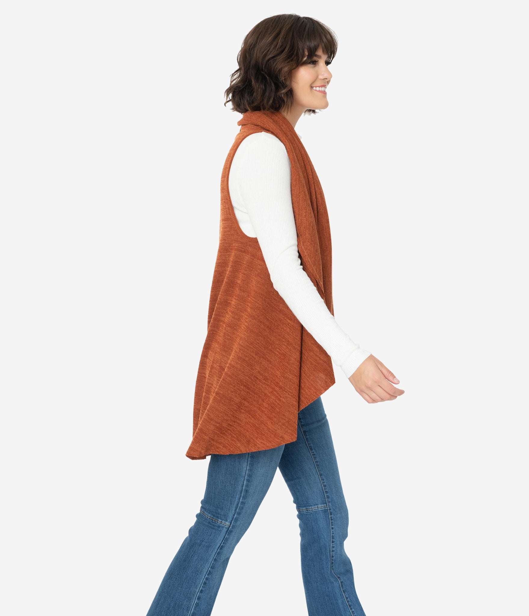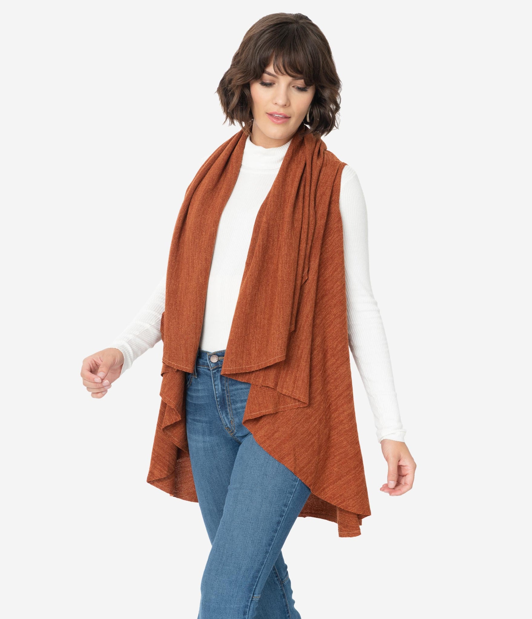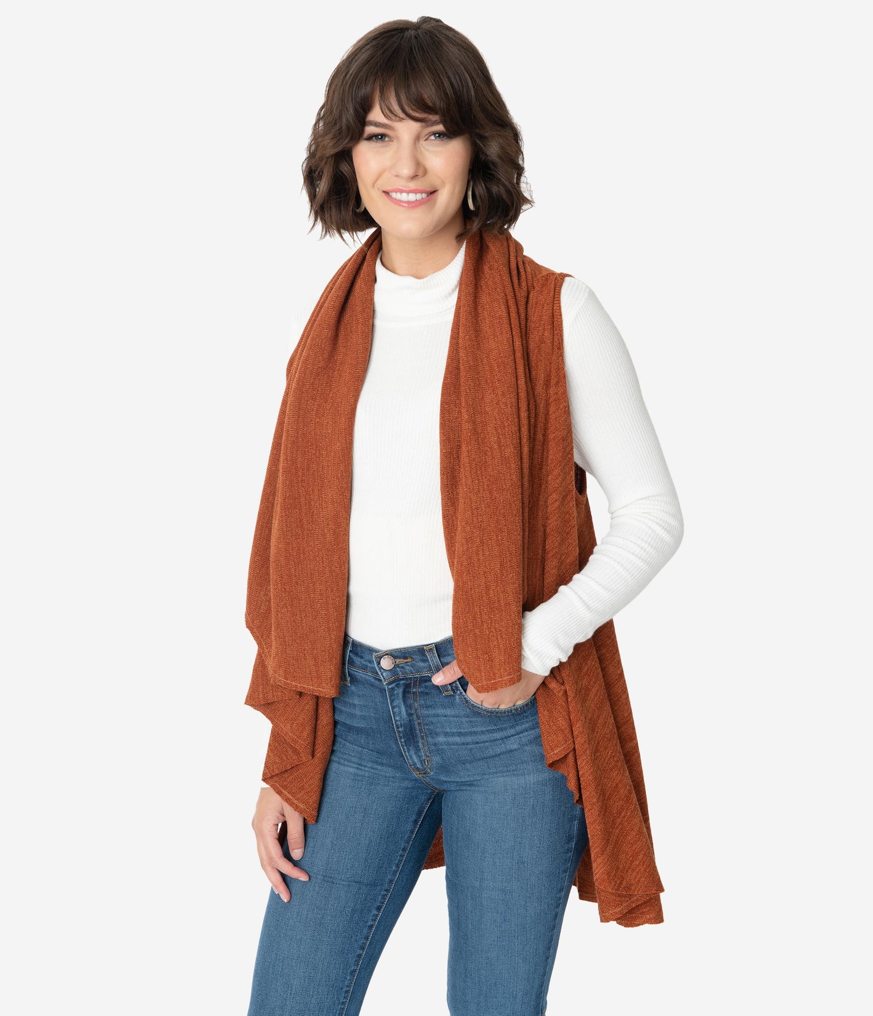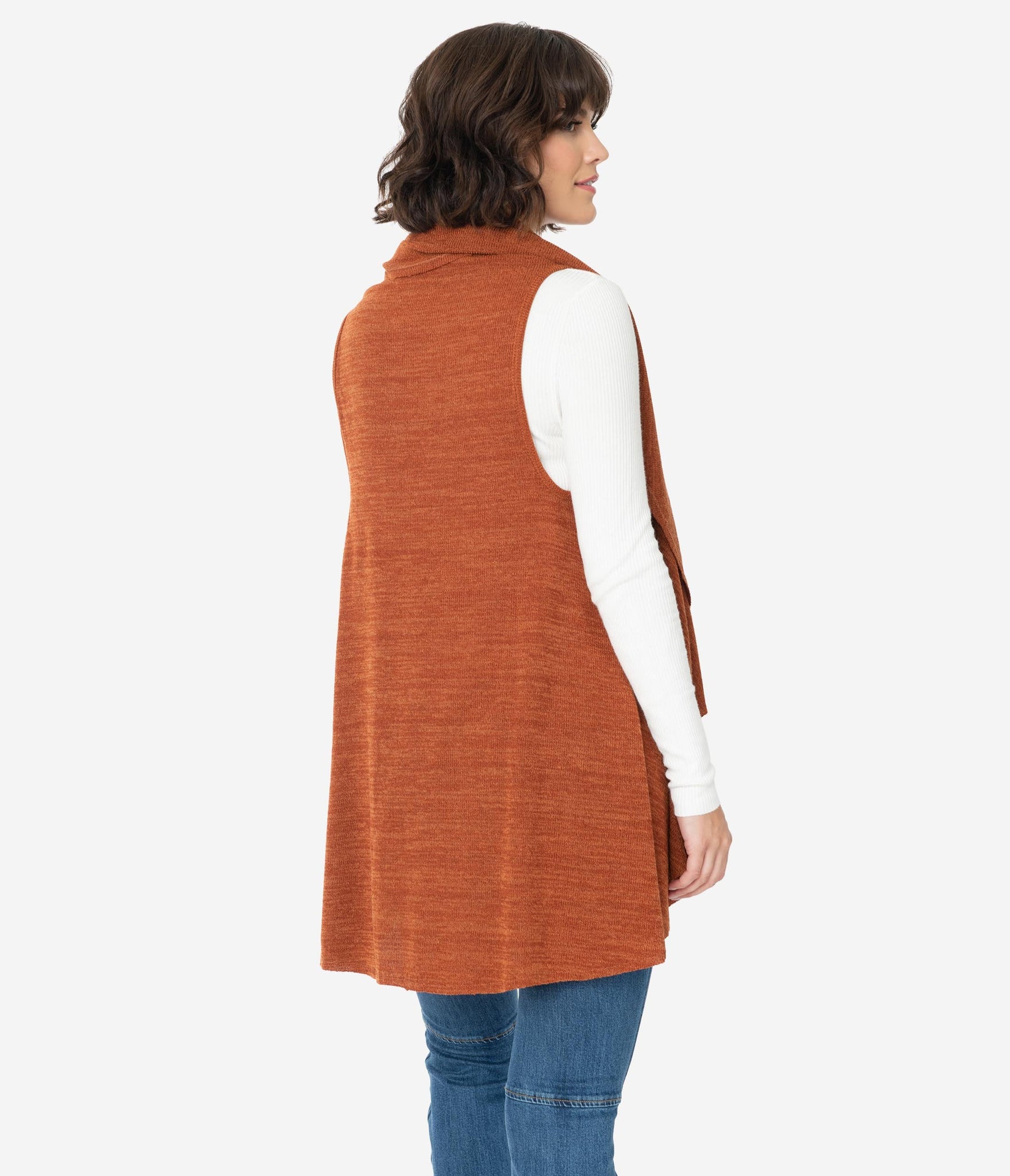 Flaunt your hippie soul, gals! This gorgeous open sweater vest is crafted in a fabulous rust orange knit for added retro wonder to your groovy silhouette. Boasting a gathered cowl that covers your neck and drapes around to the open front, the sleeveless design shows off your arms for bohemian style. Don’t worry, be happy!