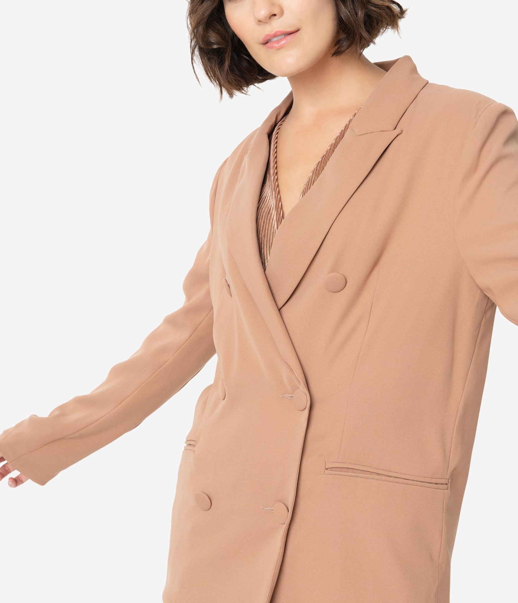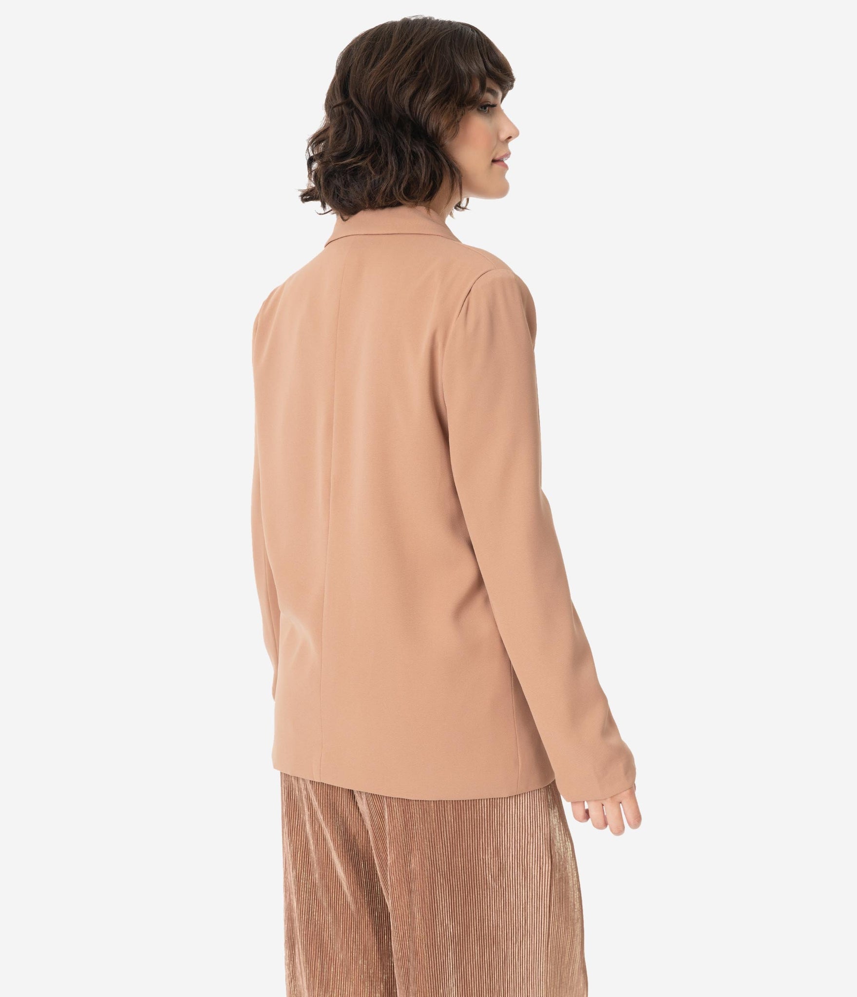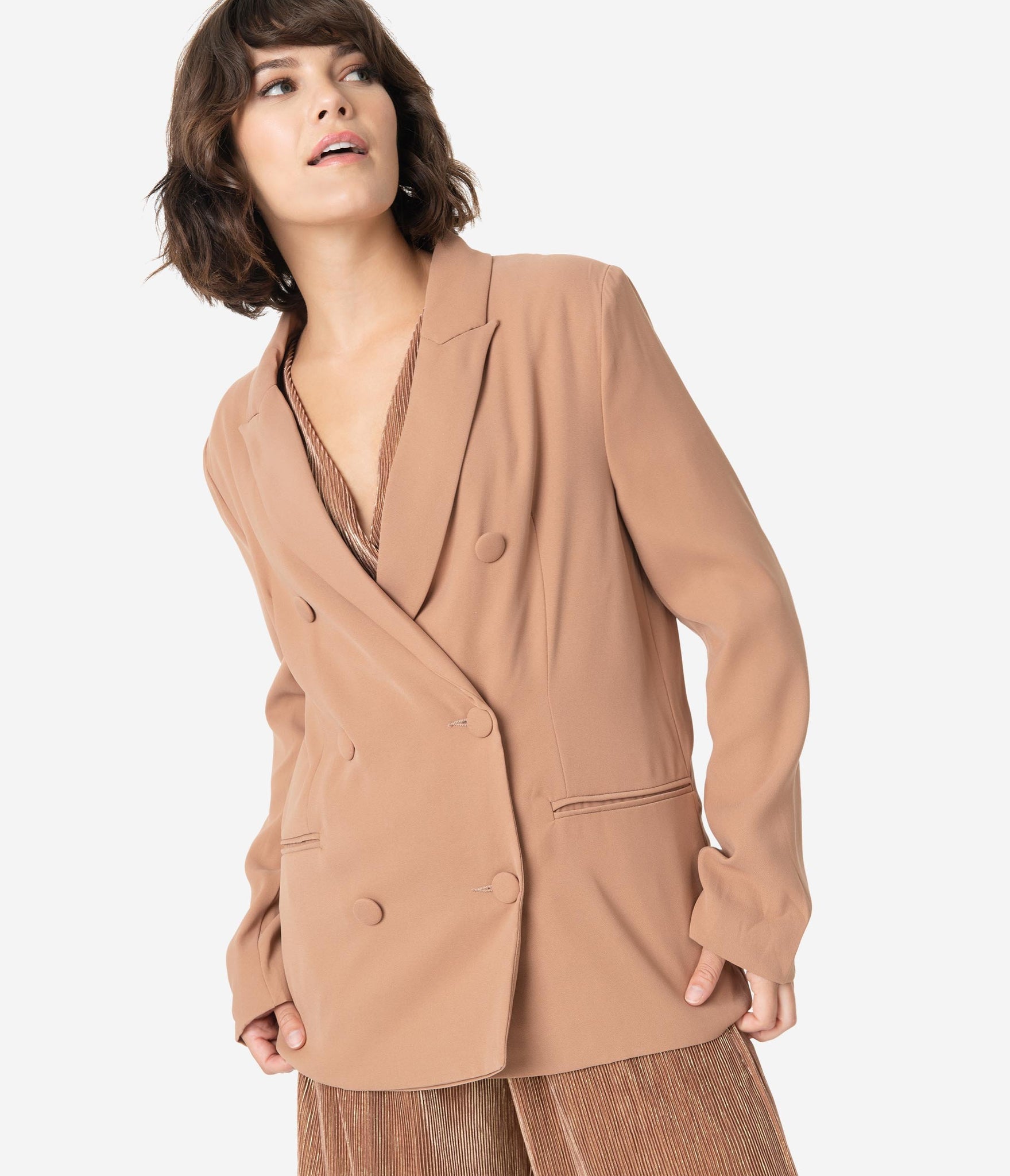 Change the times, ladies! This powerful separate is crafted in a sturdy woven blend and compels attention in gorgeous tan while the double breasted button up front allows for a versatile statement. The elegant lapel leads to subtle shoulder pads and drops into slender long sleeves. The darted waist lends a dash of form while the side pockets provide an impressive silhouette. Fully lined for comfortable wear, you’ve got the edge!
