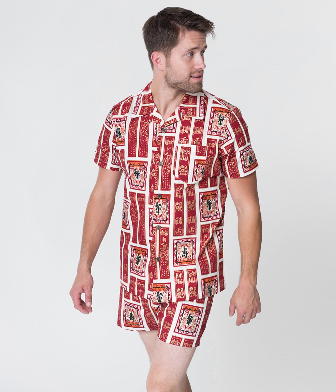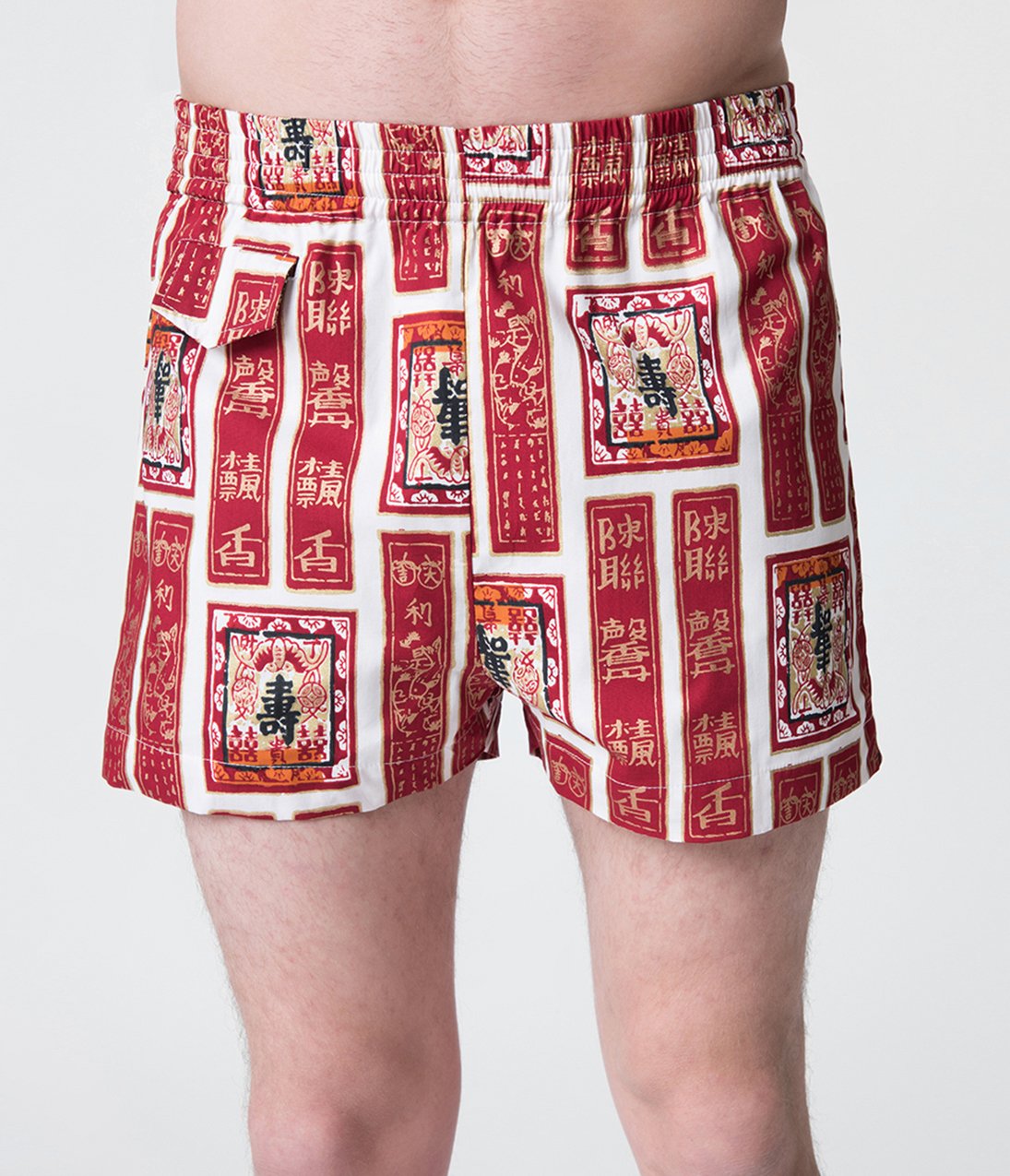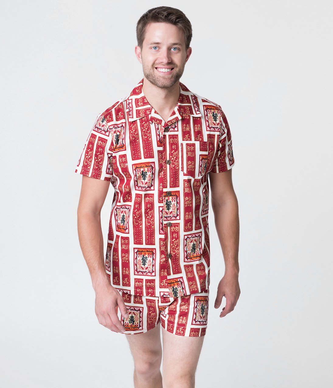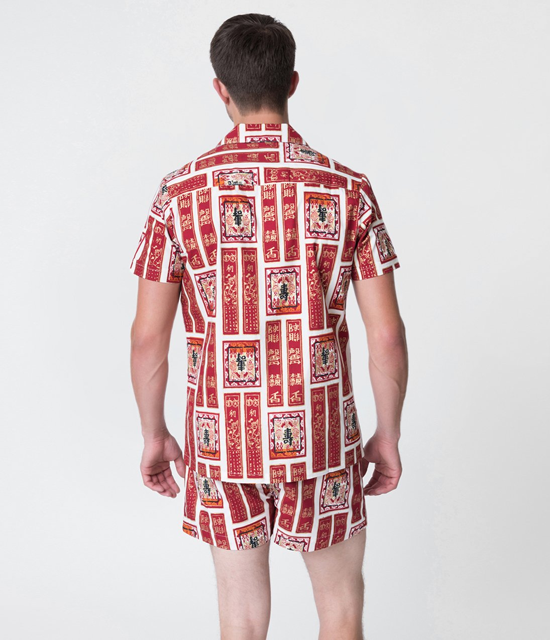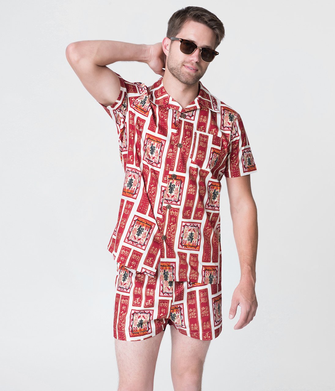 You and me by the sea! A special treat for the cabana boy in your life, this marvelous retro pair of relaxed shorts from Alfred Shaheen for Unique Vintage is a reproduction of the stunning Alfred Shaheen original, featuring an officially licensed print, crafted in marvelous cotton. A fabulous array of deep red Asian style banners and scrolls line themselves throughout an ivory backdrop, highlighted with gleaming golden accents. Lined for perfect comfort, the smocked waistband allows for an perfect fit while the pull sting provides easy adjustment. Complete with an adorable tiny pocket on the right and embellished with a flap to stow away a nip of world-traveling nightlife!