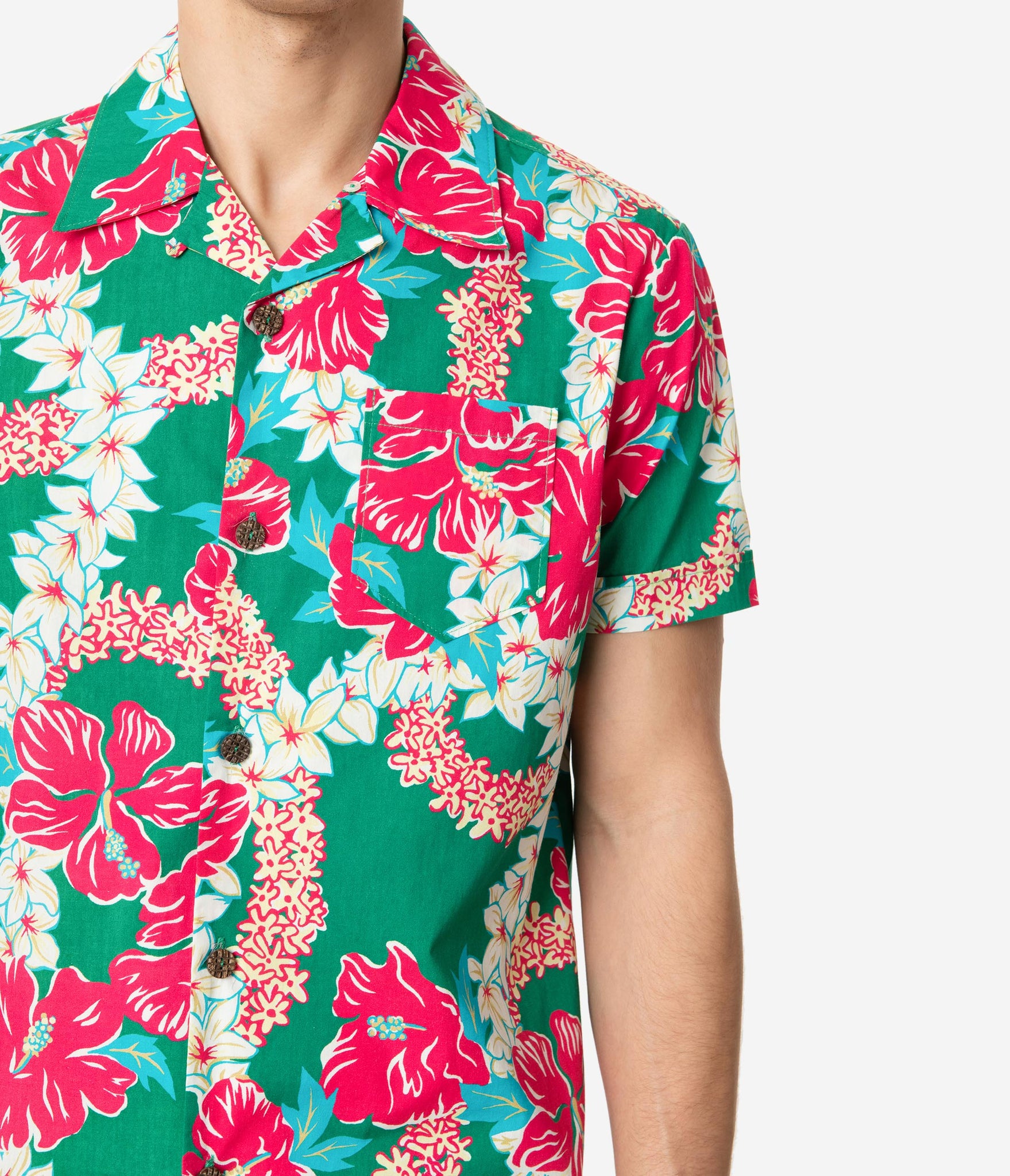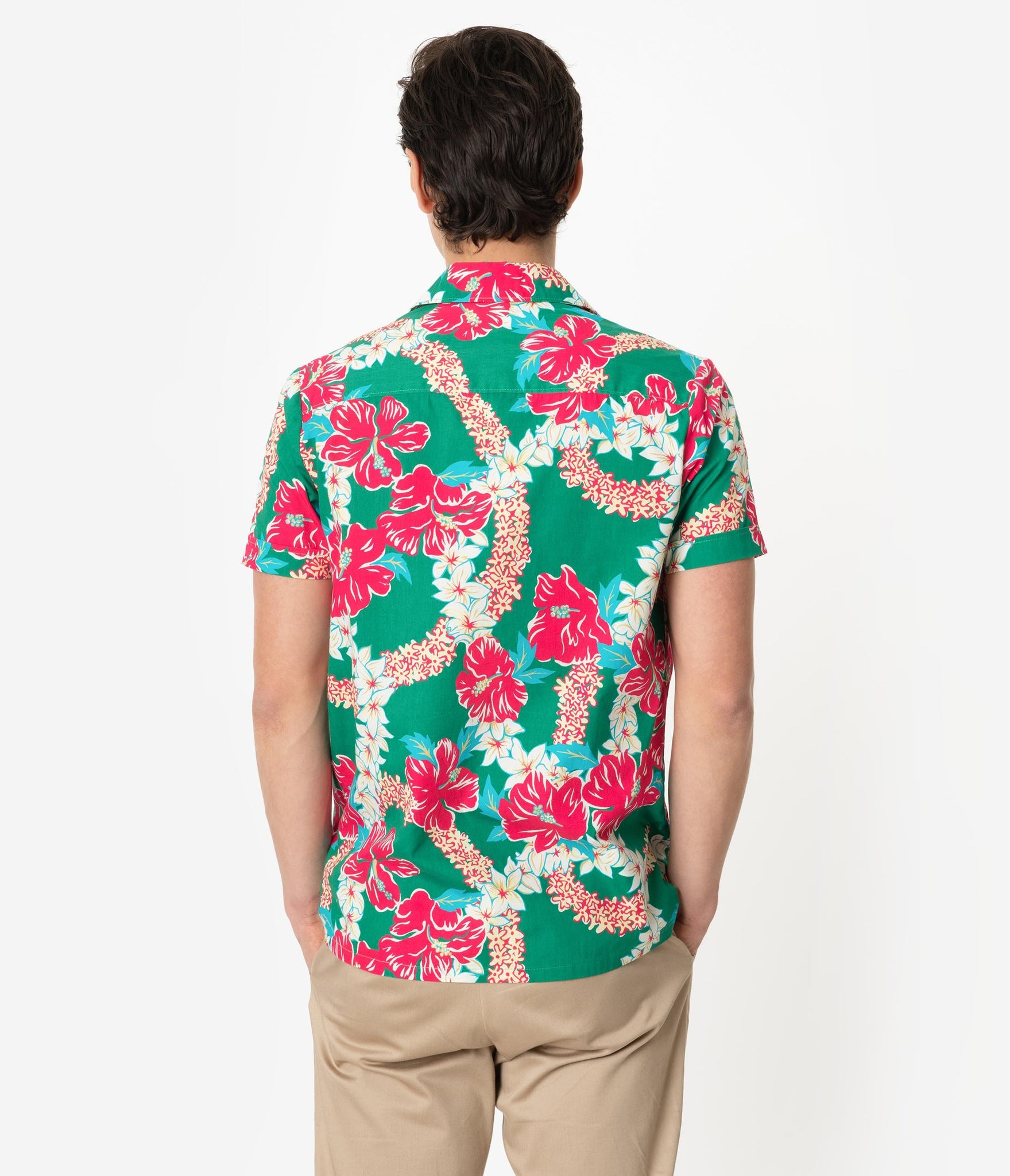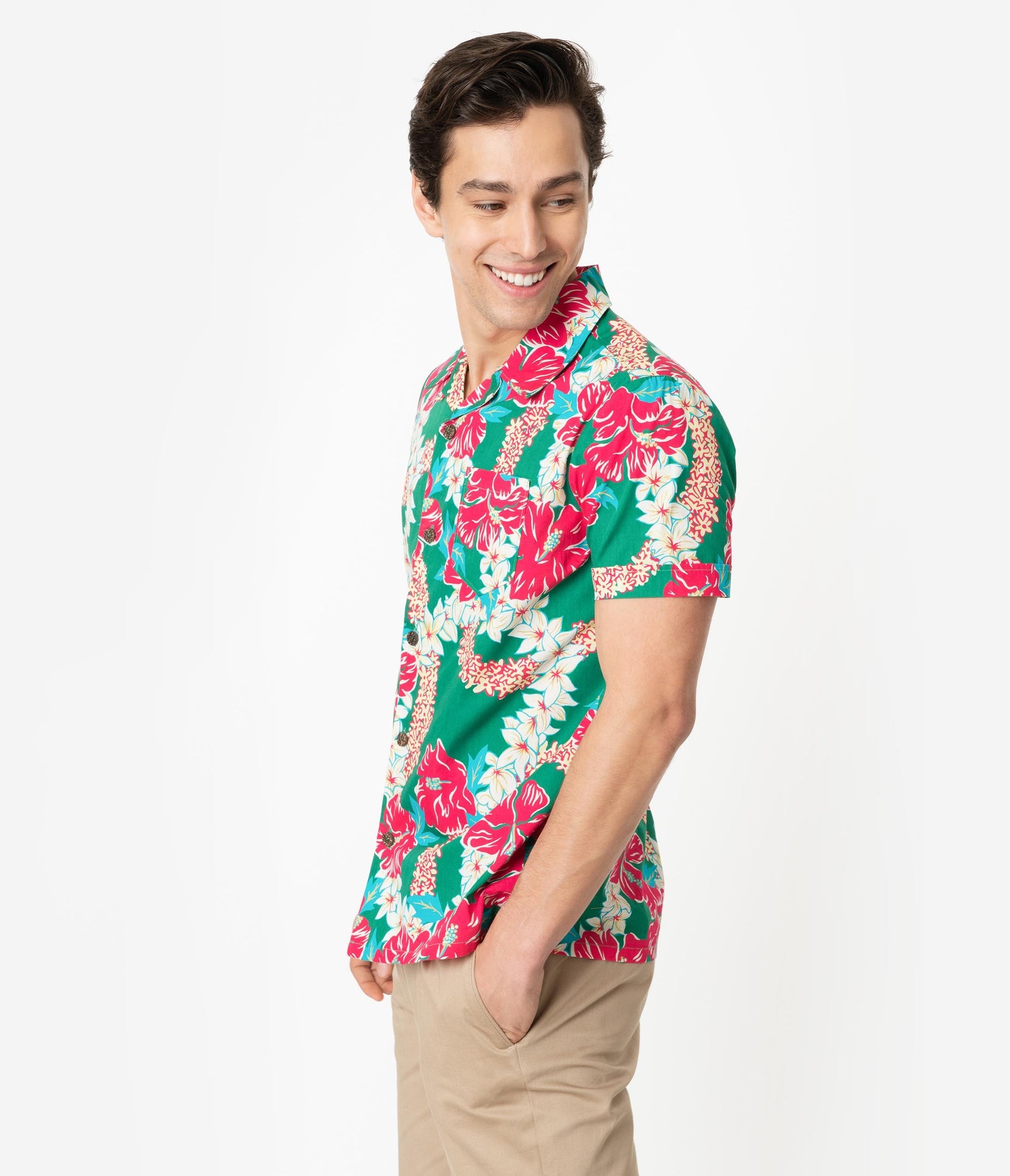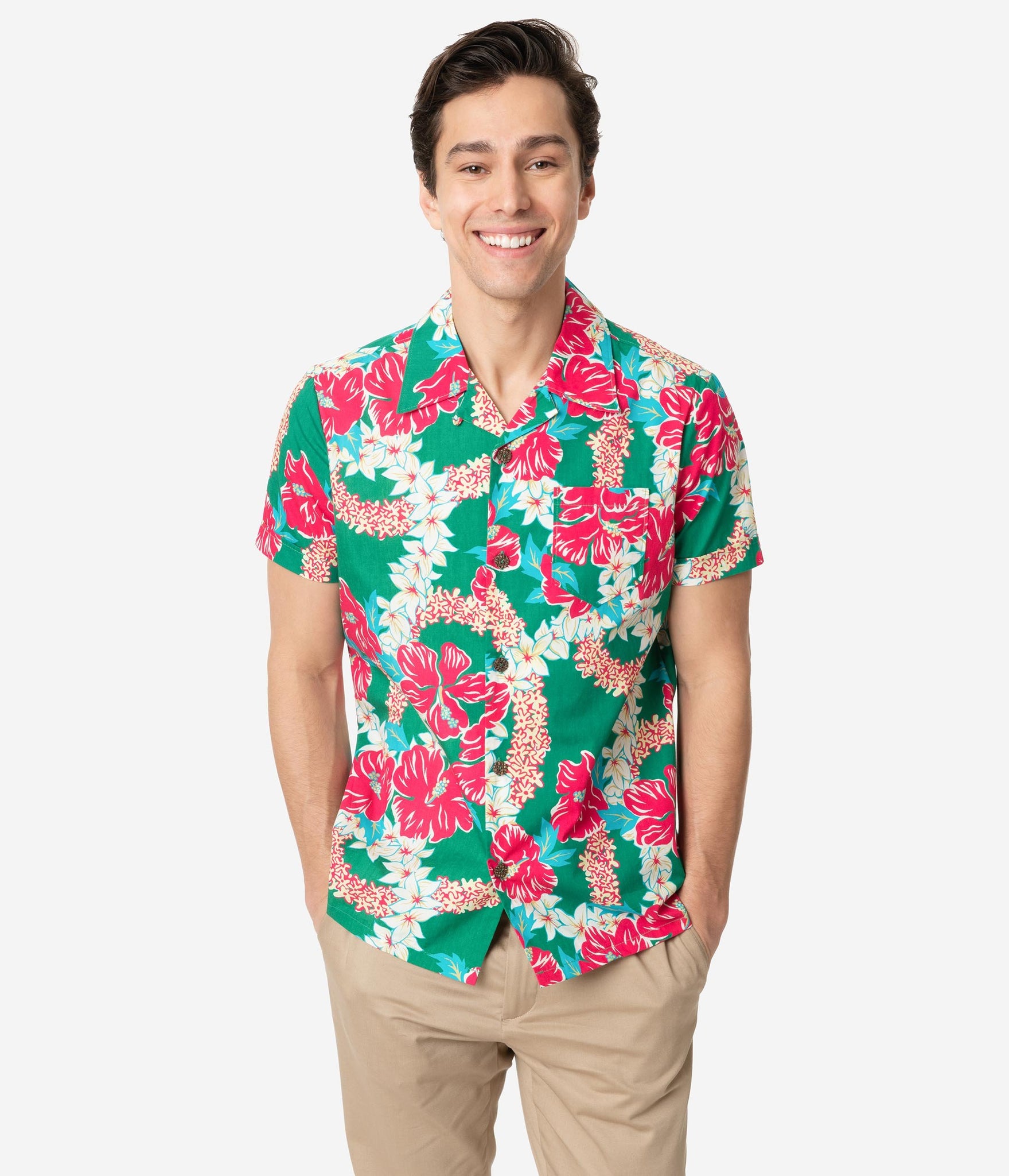 We love a warm greeting! A gorgeous celebration of Alfred Shaheen for Unique Vintage, this retro mens cabana shirt is a classic 1950s style piece that is an officially licensed reproduction of the Alfred Shaheen original. The bright and bold Male Pua Hibiscus Lei print boasts a beautiful and colorful array of pink, blue, white, and ivory florals on a lovely green backdrop, cast in lightweight cotton and featuring delightful wooden style buttons on the front and a classic breast pocket. Crafted with sweet short sleeves, a back yoke, and a notched collar, this brilliant mix of vintage styling and world-wide travel is a fabulous show of affection!