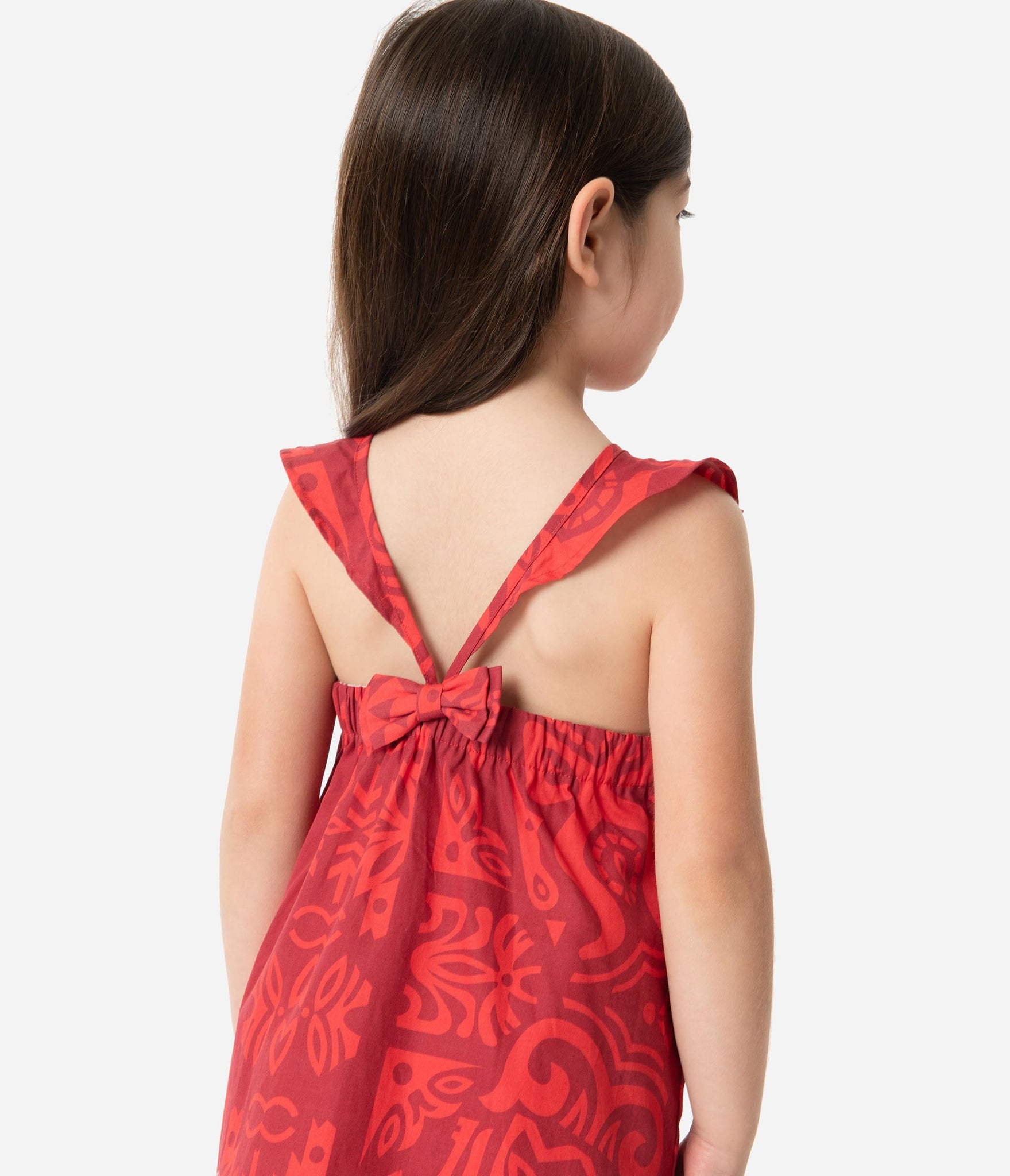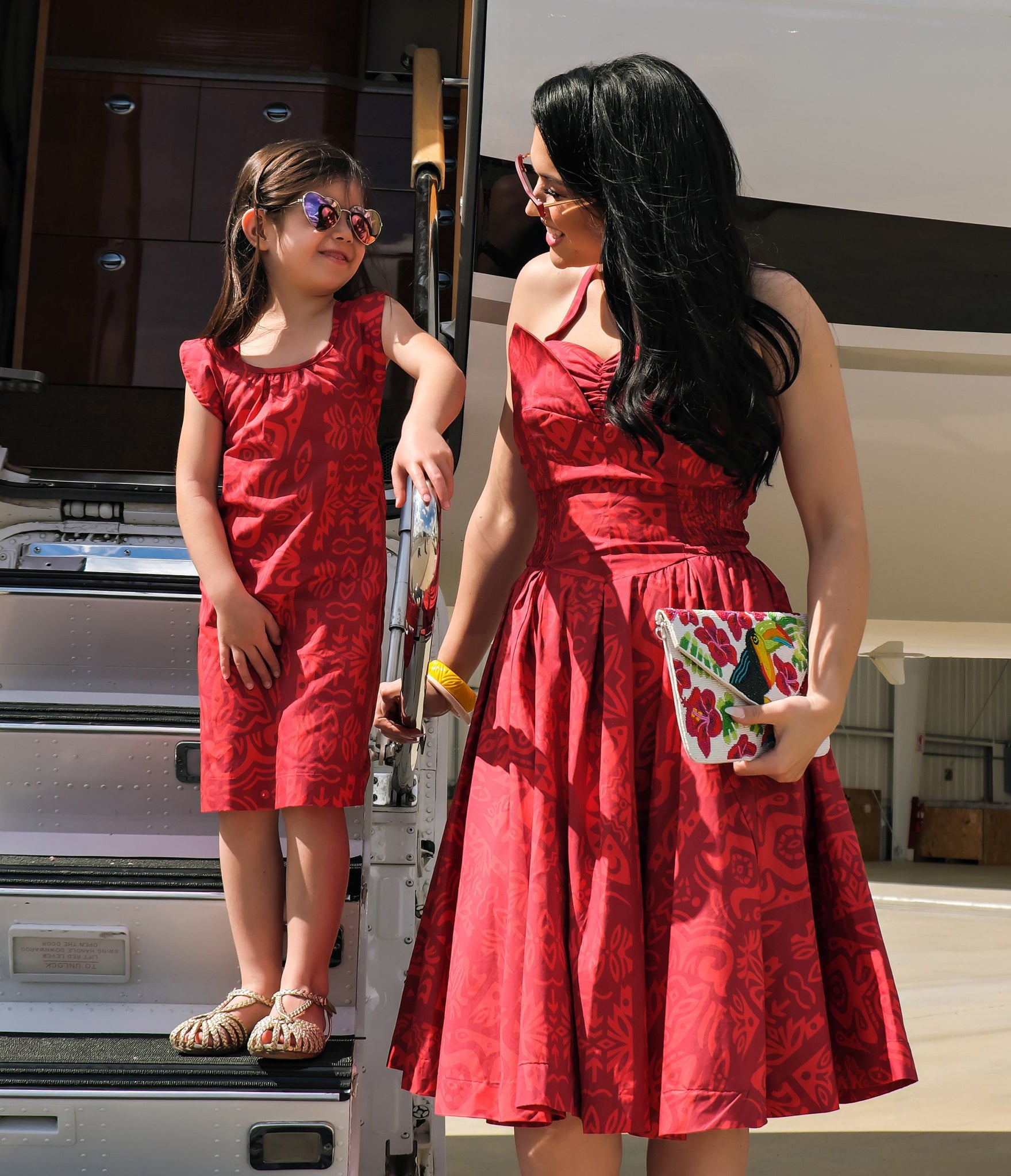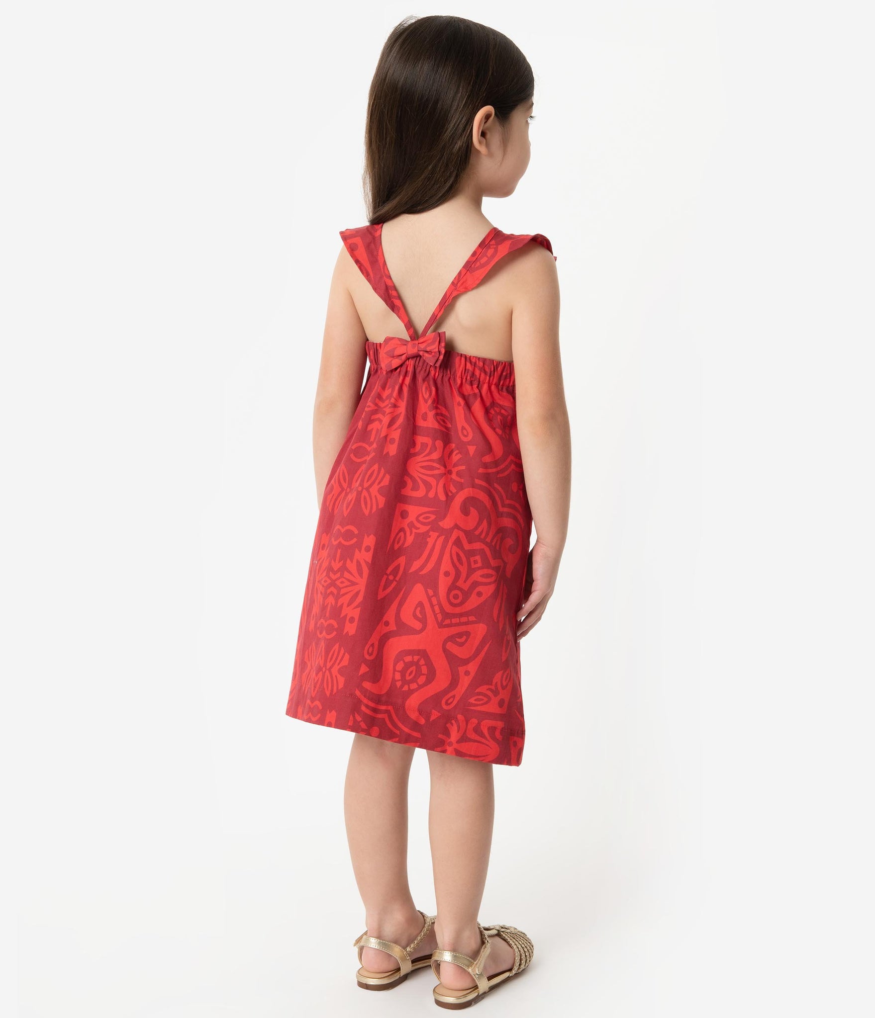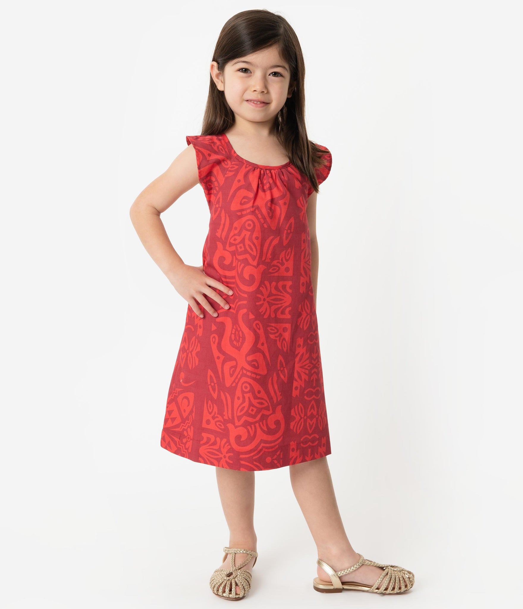 Her dreams are of tropical paradises! The latest wonder from Alfred Shaheen for Unique Vintage, this adorable cotton girls dress is cast in an officially licensed original Alfred Shaheen print called Tiki Pareau, a brilliant homage to tropical art in a beautiful red print. This cherished frock has a ruffled sleeveless design with a high halter-like neck with an elastic back band for a perfect fit. The fabulous A-line shape completes this delightful dress.