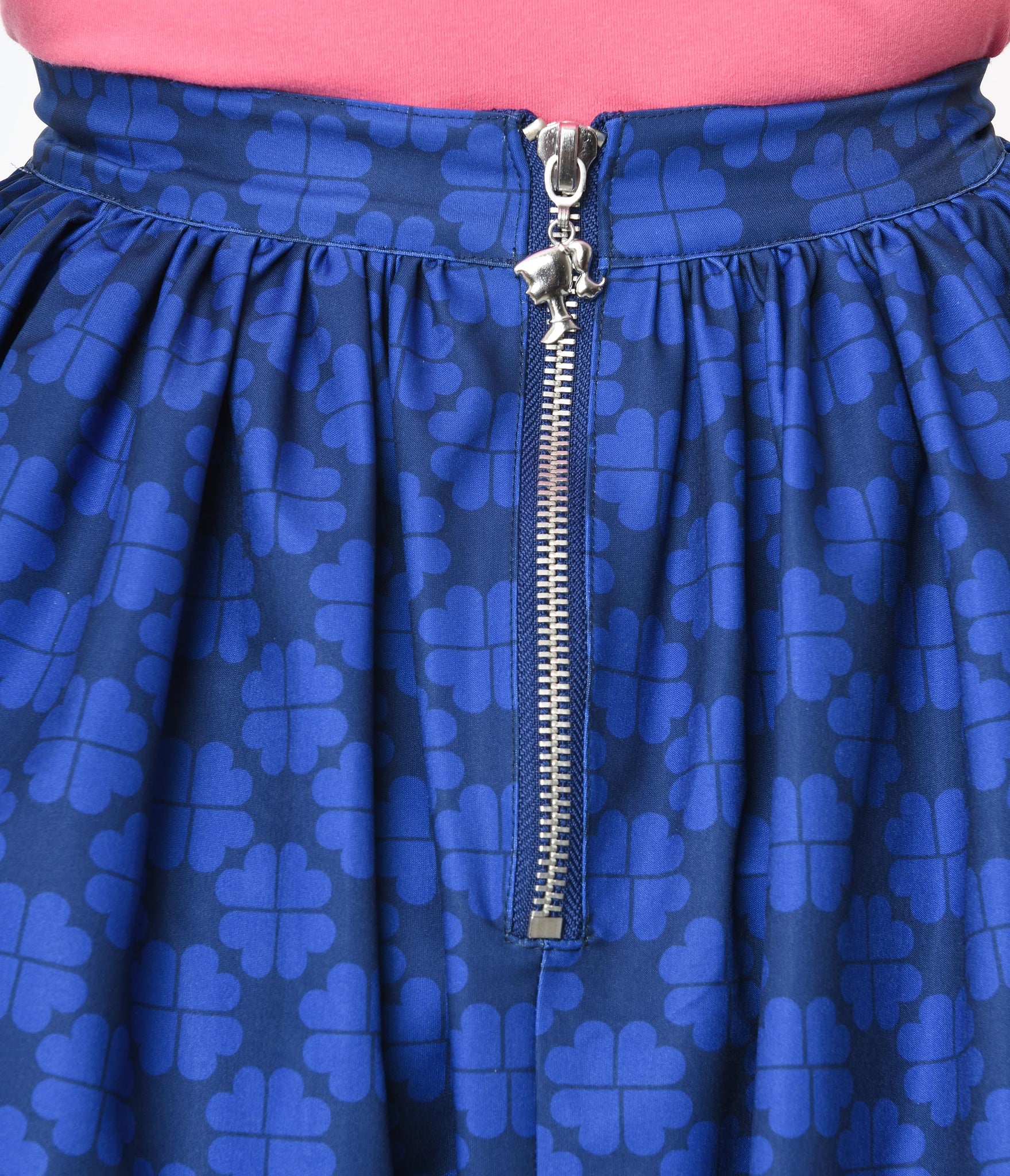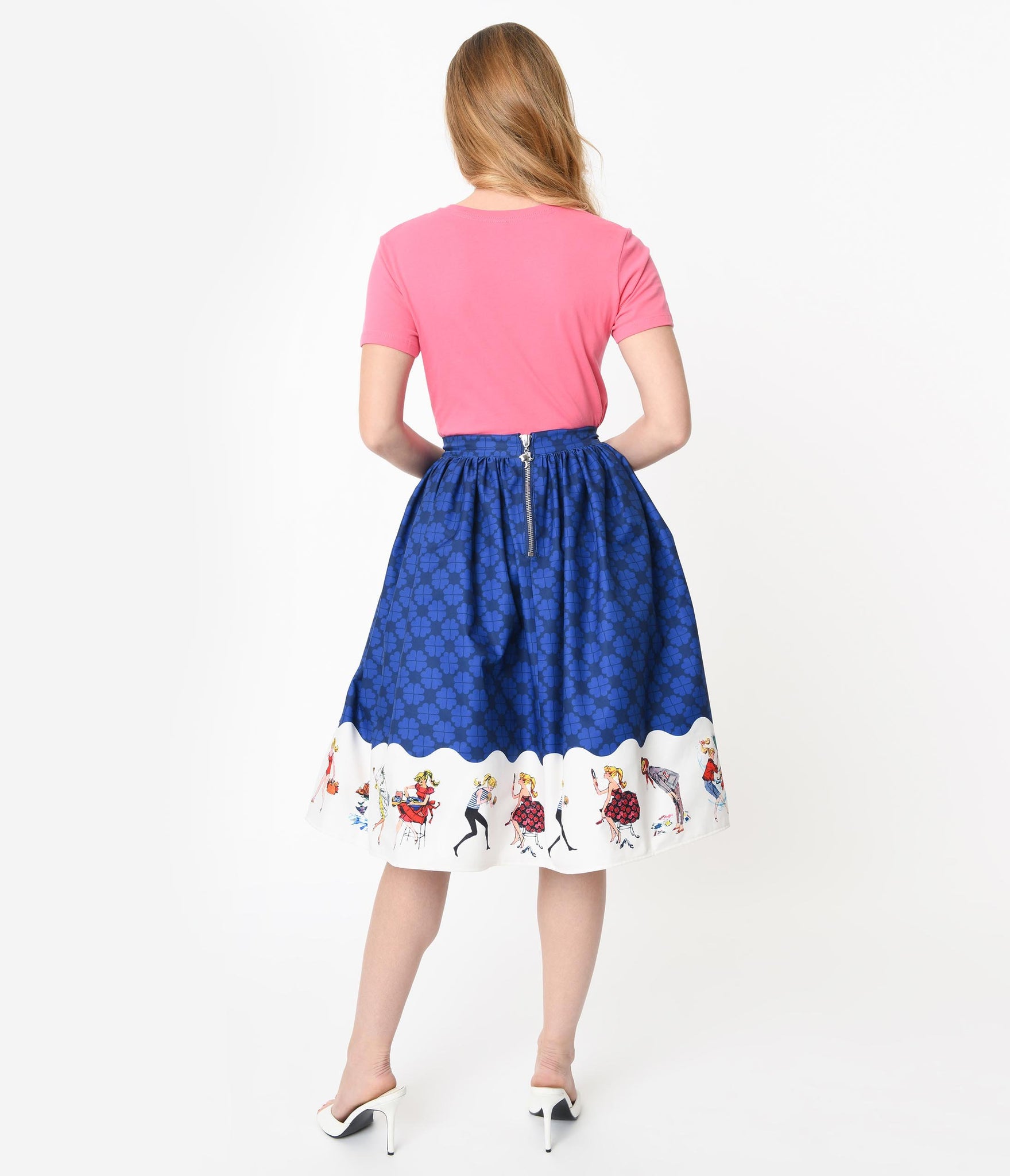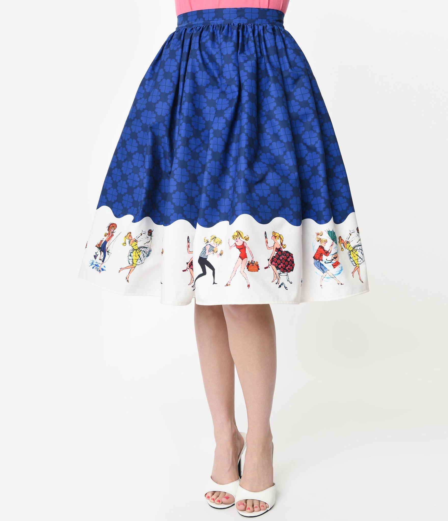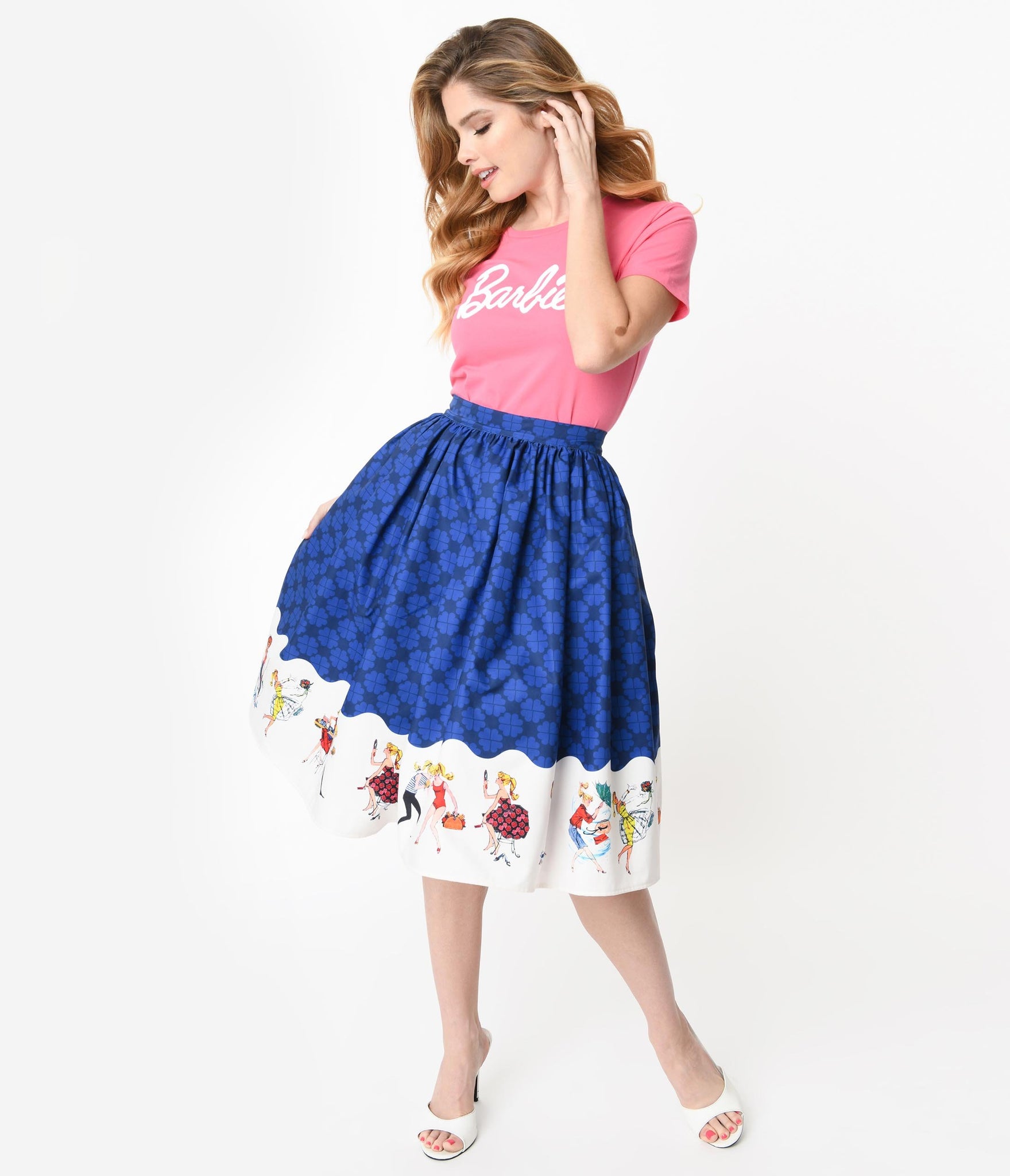 It’s a classic line-up, dames! Play make-believe all over again with My Barbie Collection from Unique Vintage, featuring a balletic print highlighting iconic Barbie silhouettes in vintage ensemble along the ivory hem. This marvelous blue floral swing skirt is cast in a gleaming woven fabric that gathers at a banded high waist and cascades to a straight hem. Outfitted with a zipper in the back that cinches in your feminine figure and hidden side pockets to store your favorite Barbie accessories! They’re irreplaceable, darling!