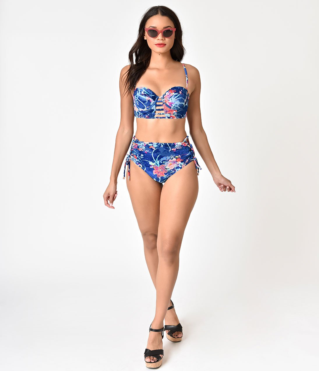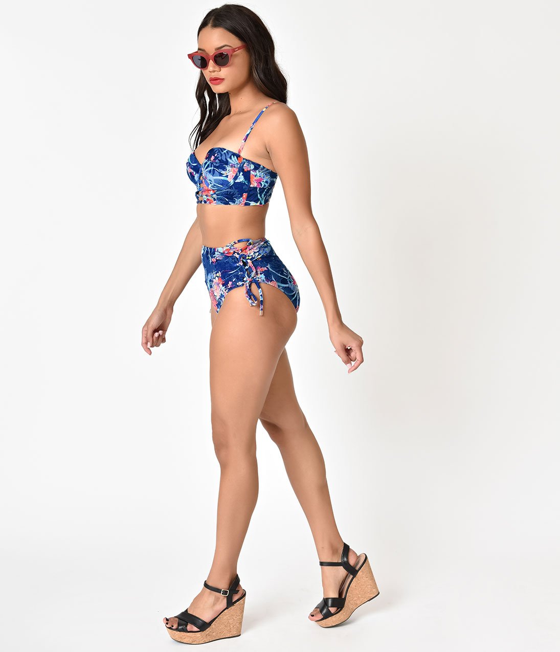 Fabulously floral in blue velvet, dear! Betsey Johnson gives you the midnight garden too floral pattern against a rich blue velvet stretch blend on this high waisted swim bottom. The cut provides this swim piece with medium coverage, and contours your form for a fabulous silhouette. Featuring self fabric laces feeding through heart shaped metal eyelets, this corset detailed bottom is blooming just for you!