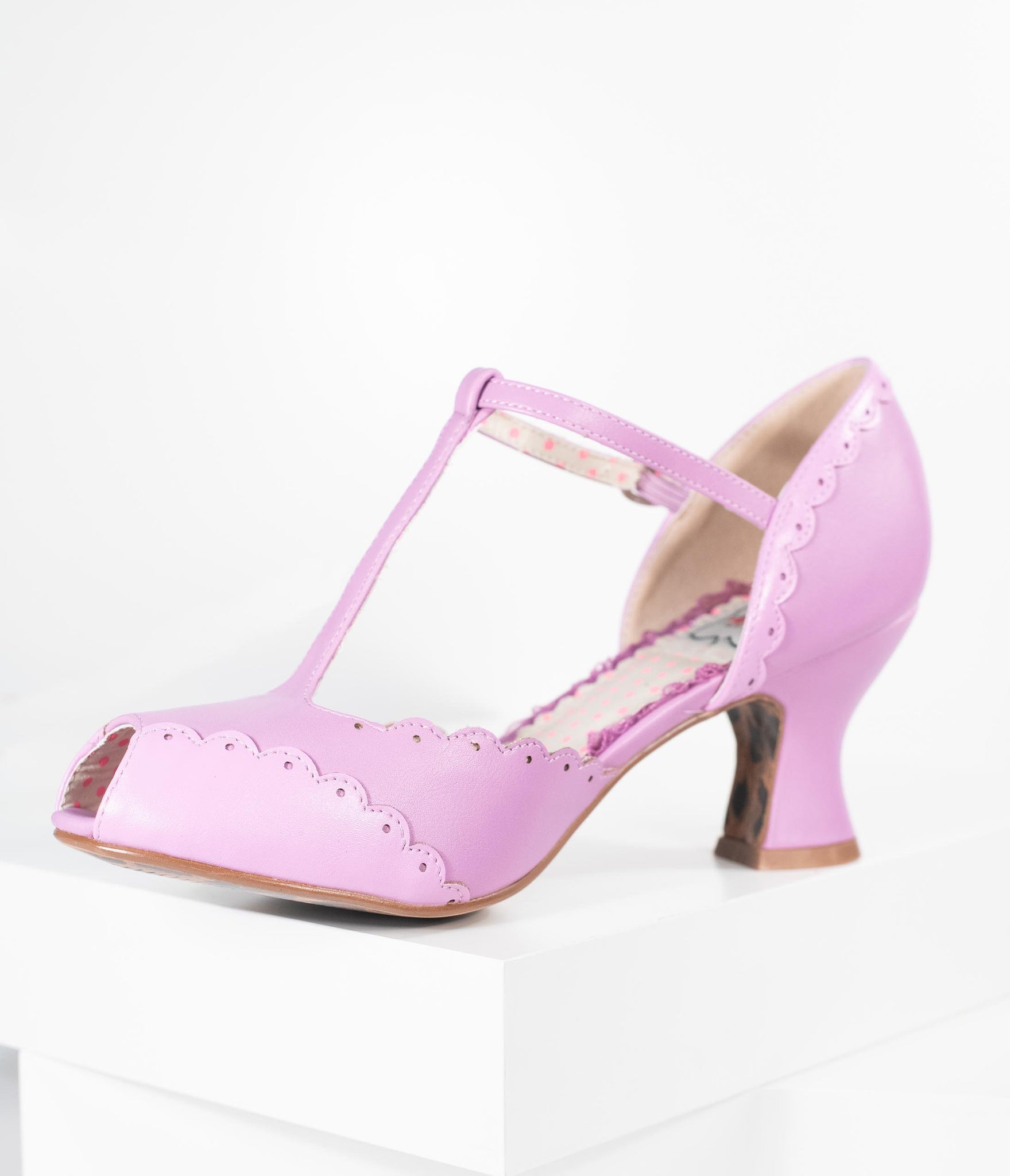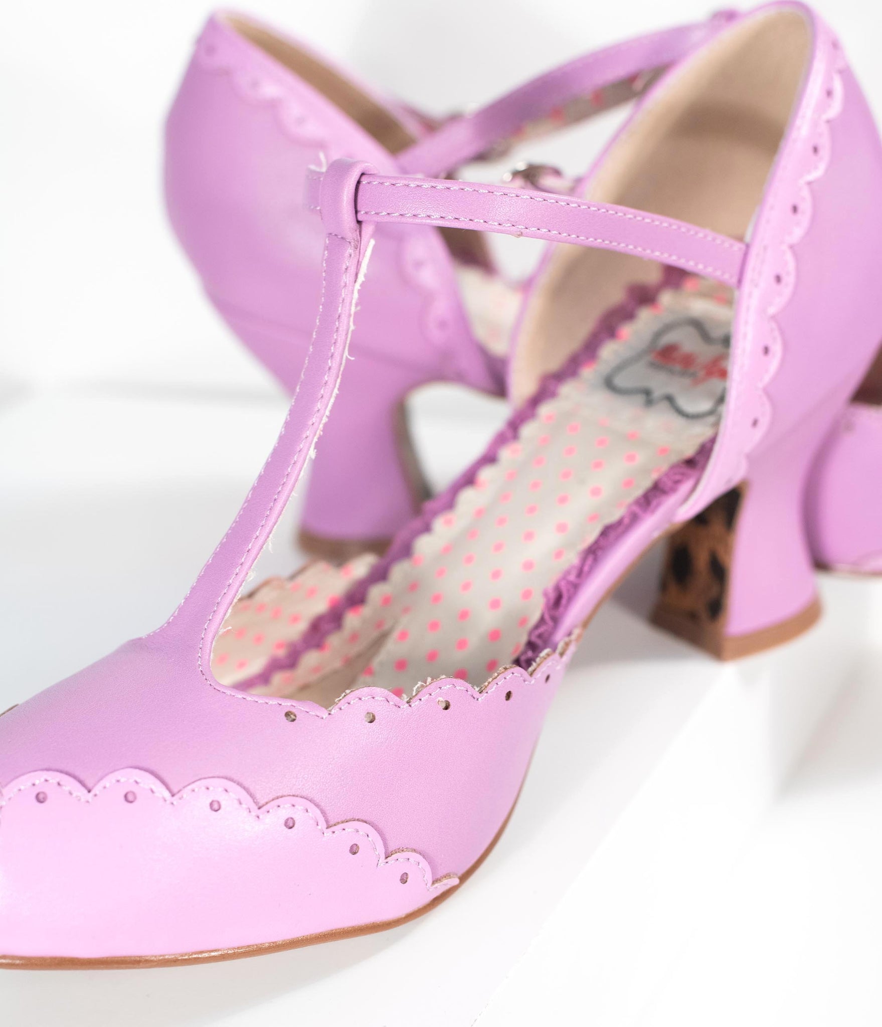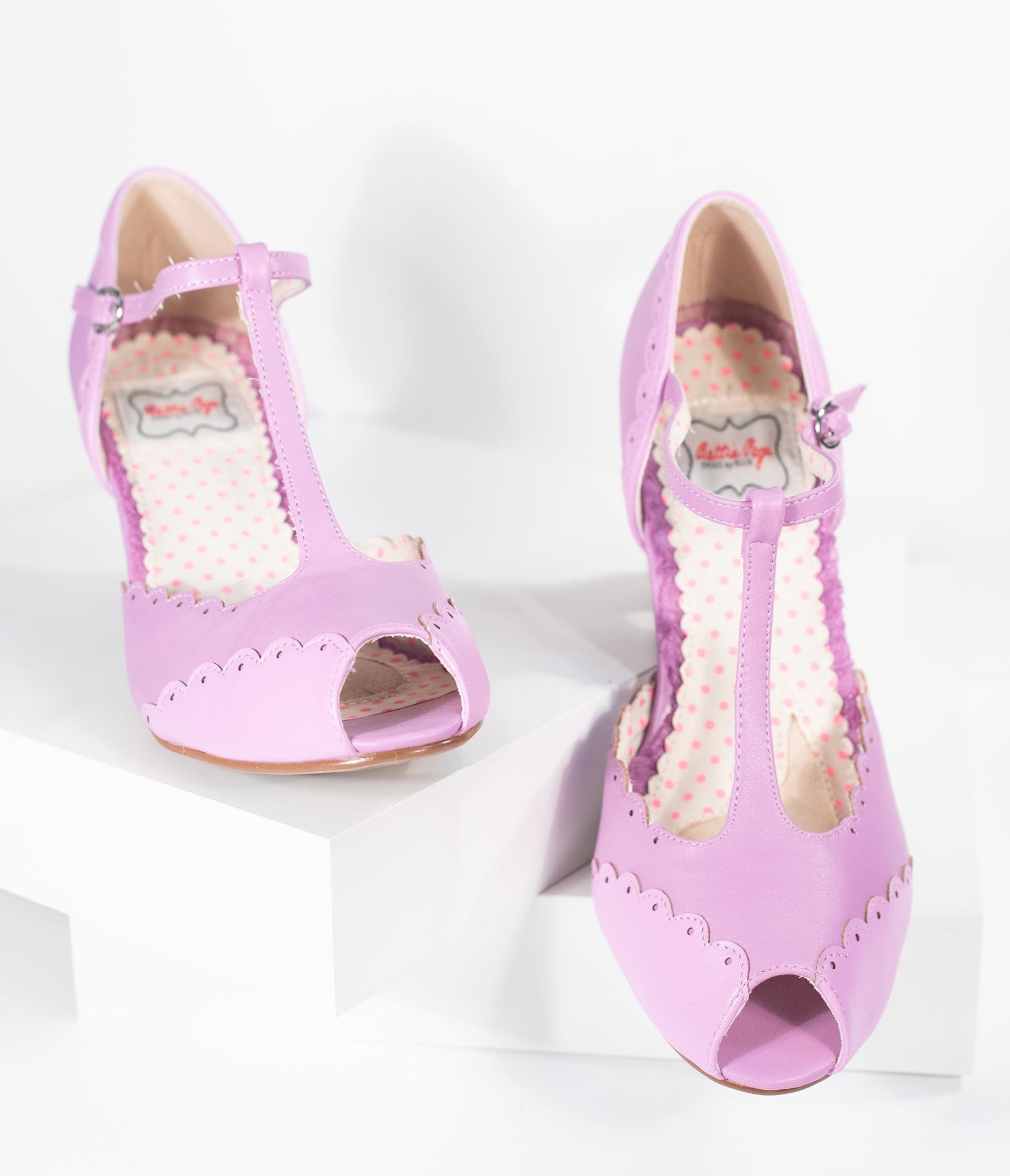 Cute all day long! The lavender purple Carlie heels are vintage t-strap perfection, chic enough to go from day to night. Crafted in man-made materials from Bettie Page, these adorable kicks boast a charming T-strap and peep toe vamp, while color blocked purple layers boast scalloped detail for a truly feminine feel. Complete with a gored adjustable buckle, a polka dot cushioned insole, and a 2.5” heel to dance the days away!