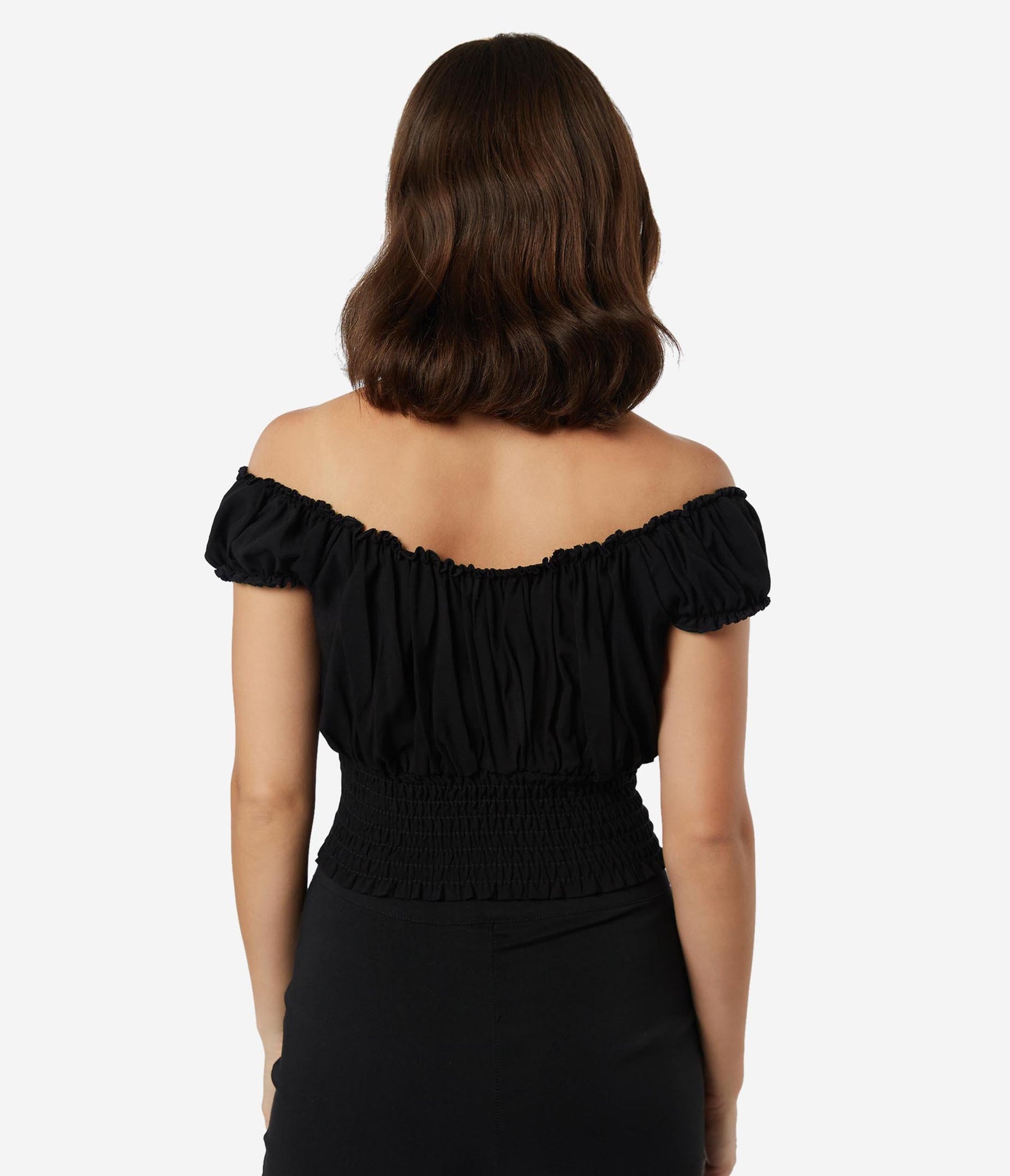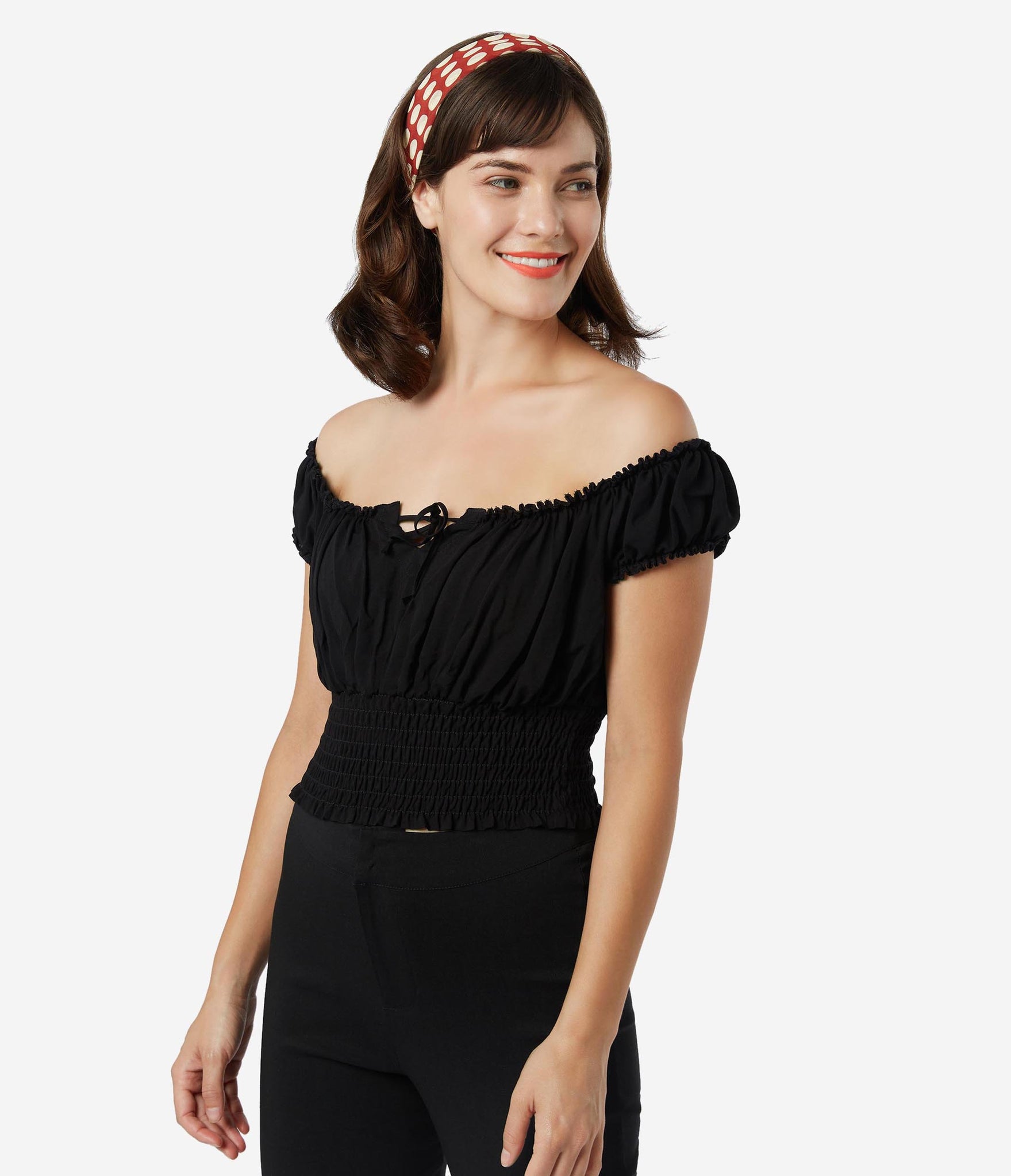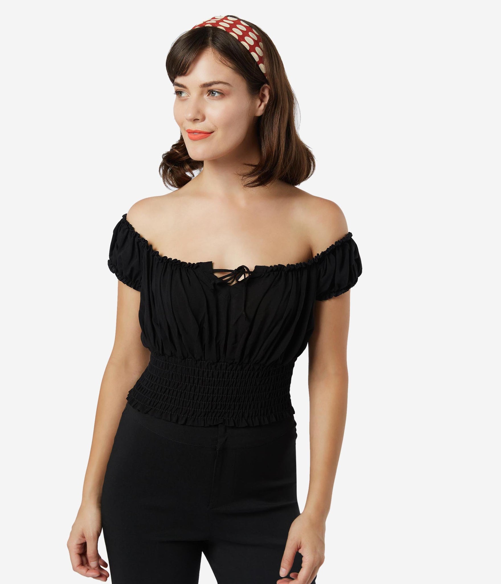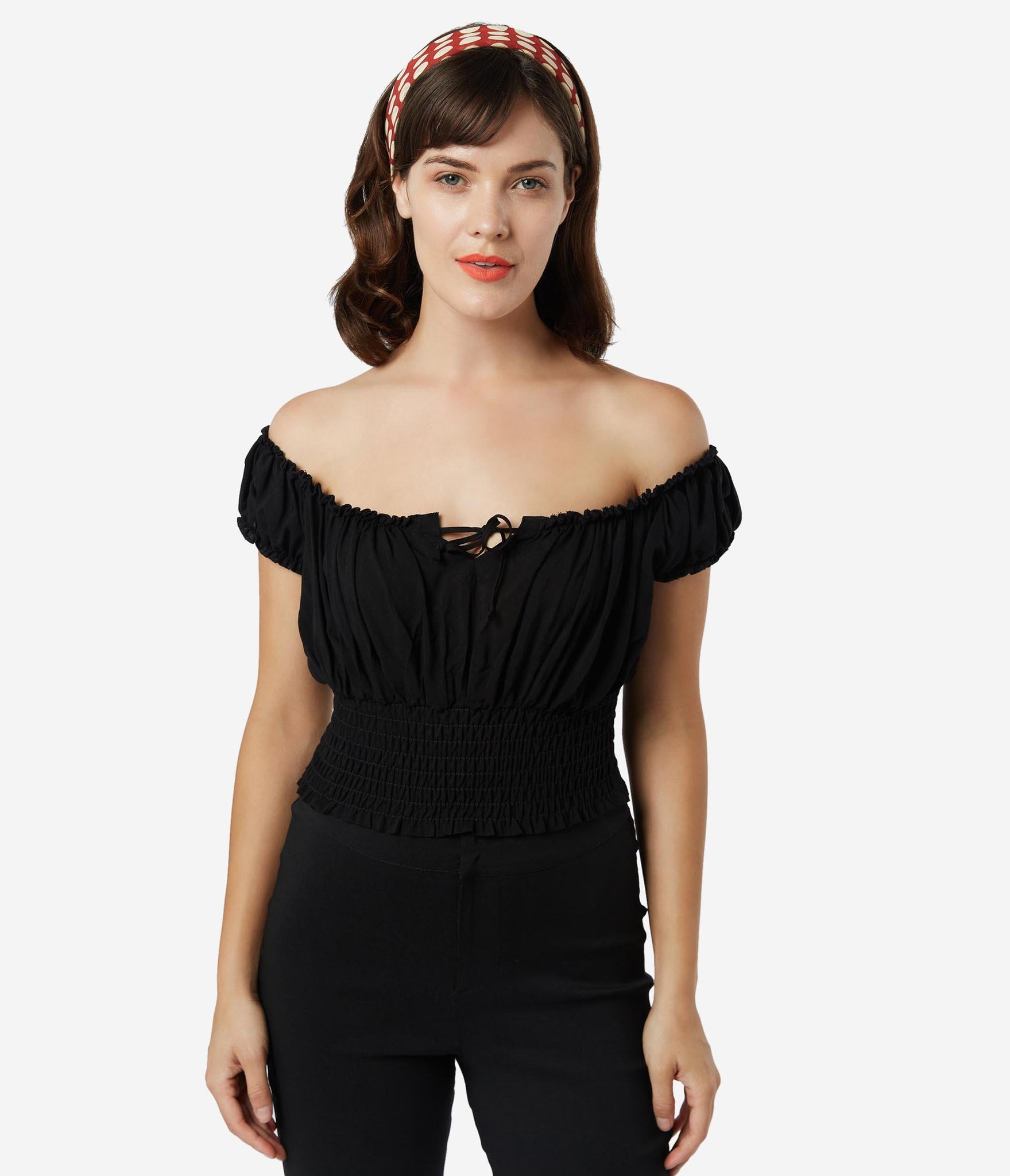 Fresh femininity, dolls! This soft and supple separate from Bettie Page is crafted in a silky blend that radiates romance in a sultry black. A gathered, peasant blouse style boasts an elastic off the shoulder neckline with Bardot sleeves, centered by a string tie detail. A flattering smocked waist shows off your hourglass!