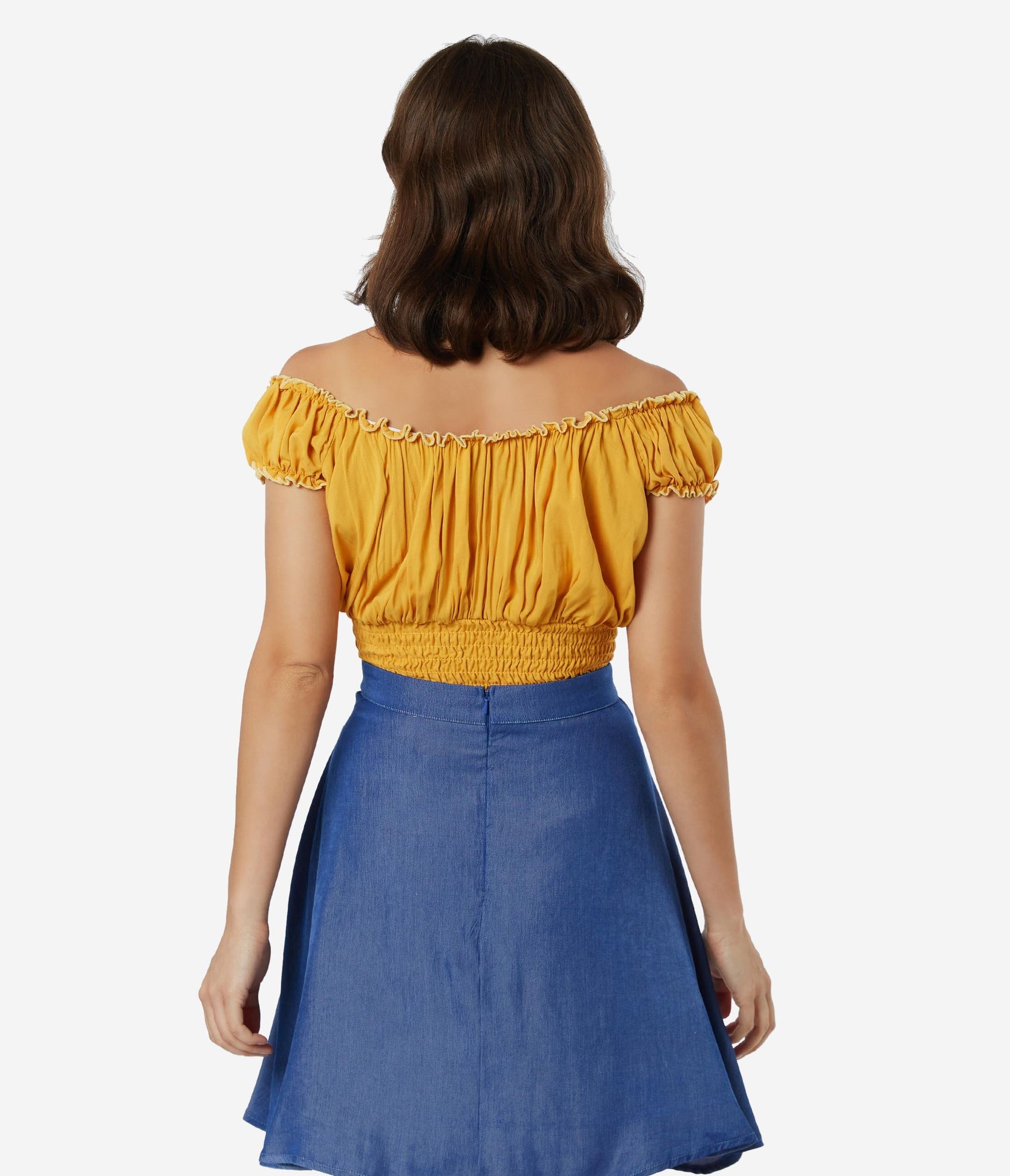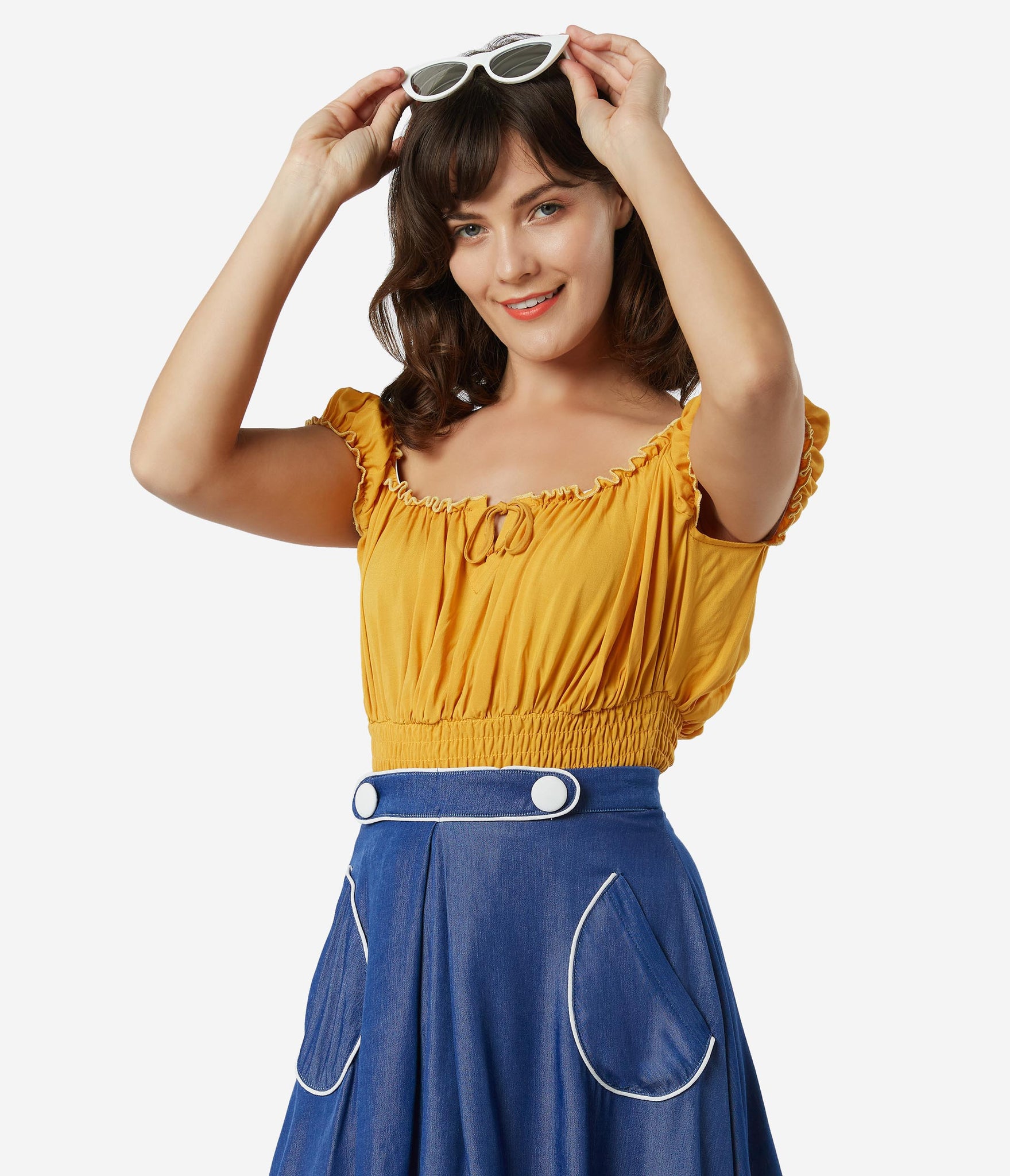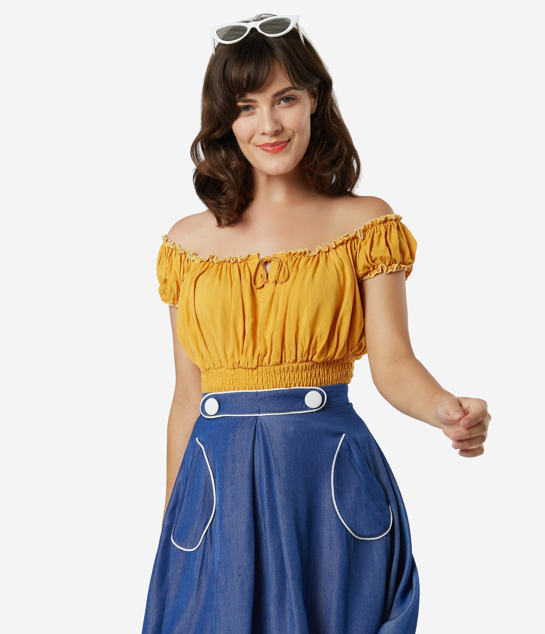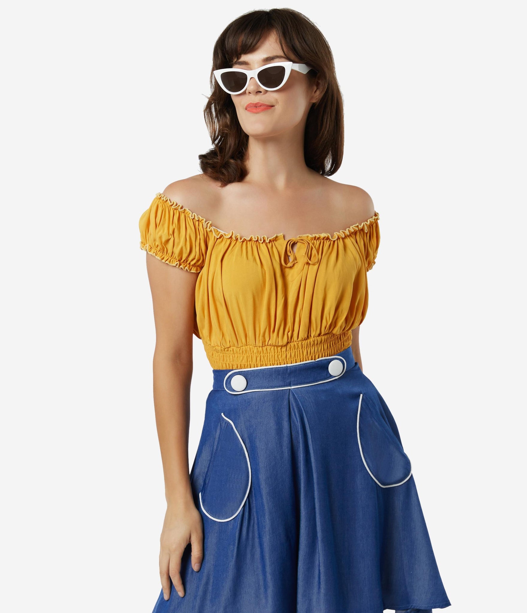 Fresh femininity, dolls! This soft and supple separate from Bettie Page is crafted in a silky blend that radiates romance in a cheerful mustard yellow. A gathered, peasant blouse style boasts an elastic off the shoulder neckline with Bardot sleeves, centered by a string tie detail. A flattering smocked waist shows off your hourglass!