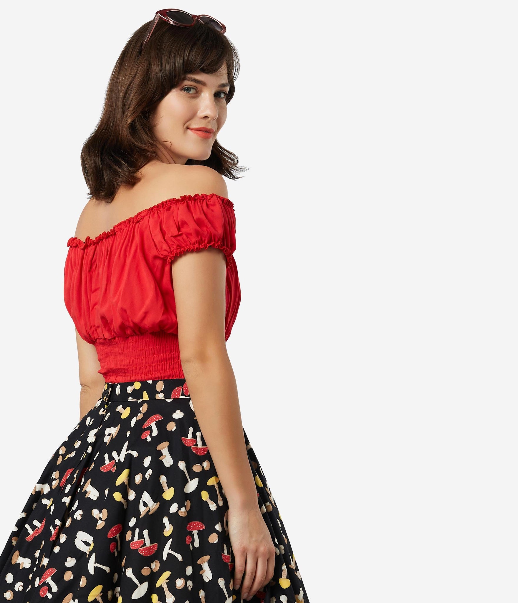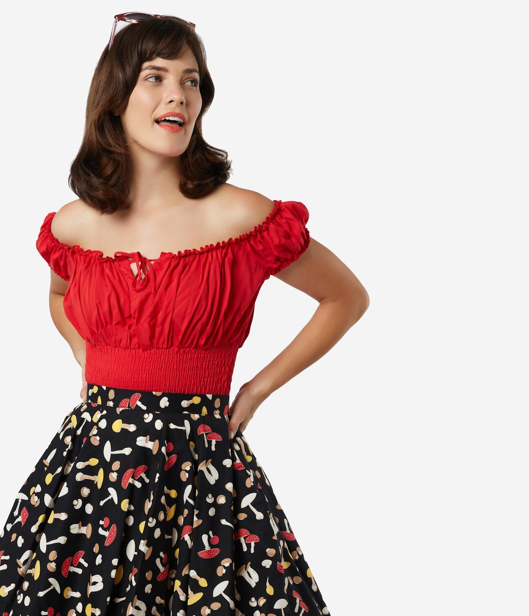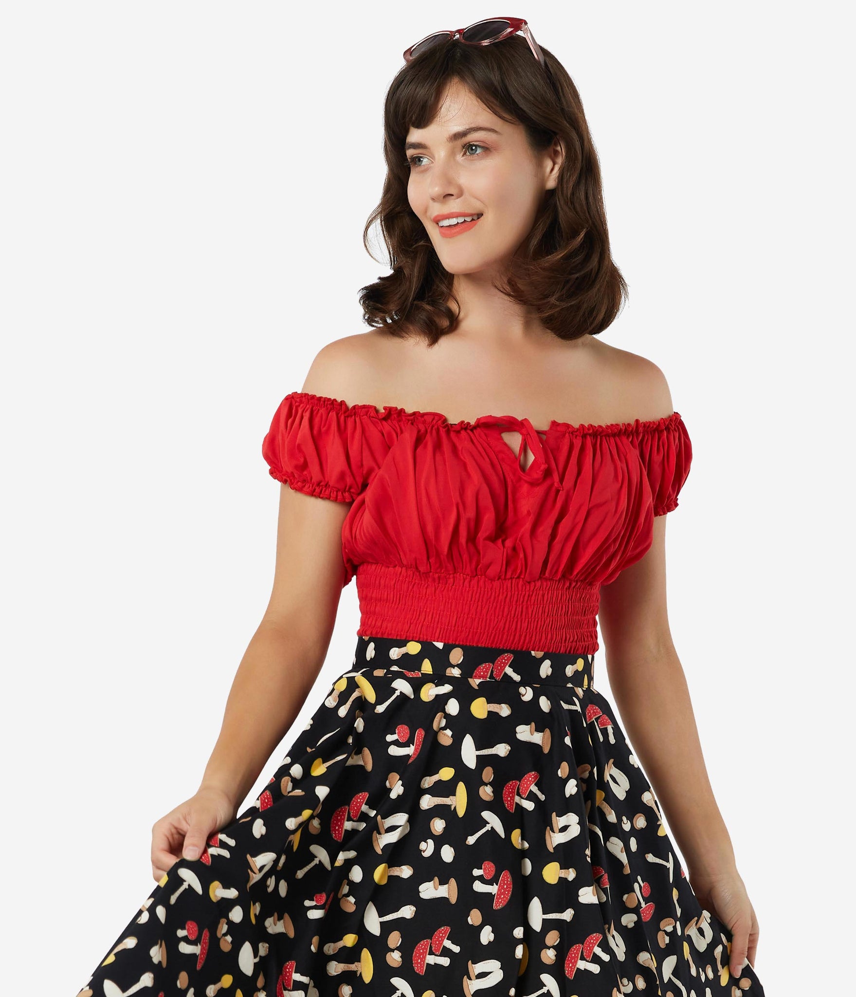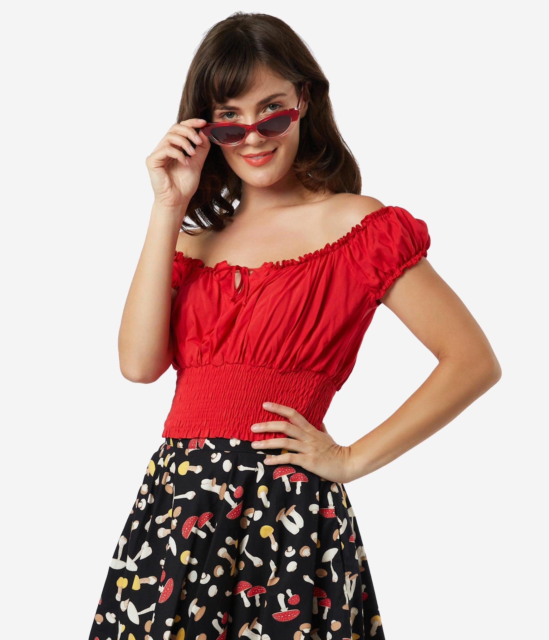 Fresh femininity, dolls! This soft and supple separate from Bettie Page is crafted in a silky blend that radiates romance in rockabilly red. A gathered, peasant blouse style boasts an elastic off the shoulder neckline with Bardot sleeves, centered by a string tie detail. A flattering smocked waist shows off your hourglass!