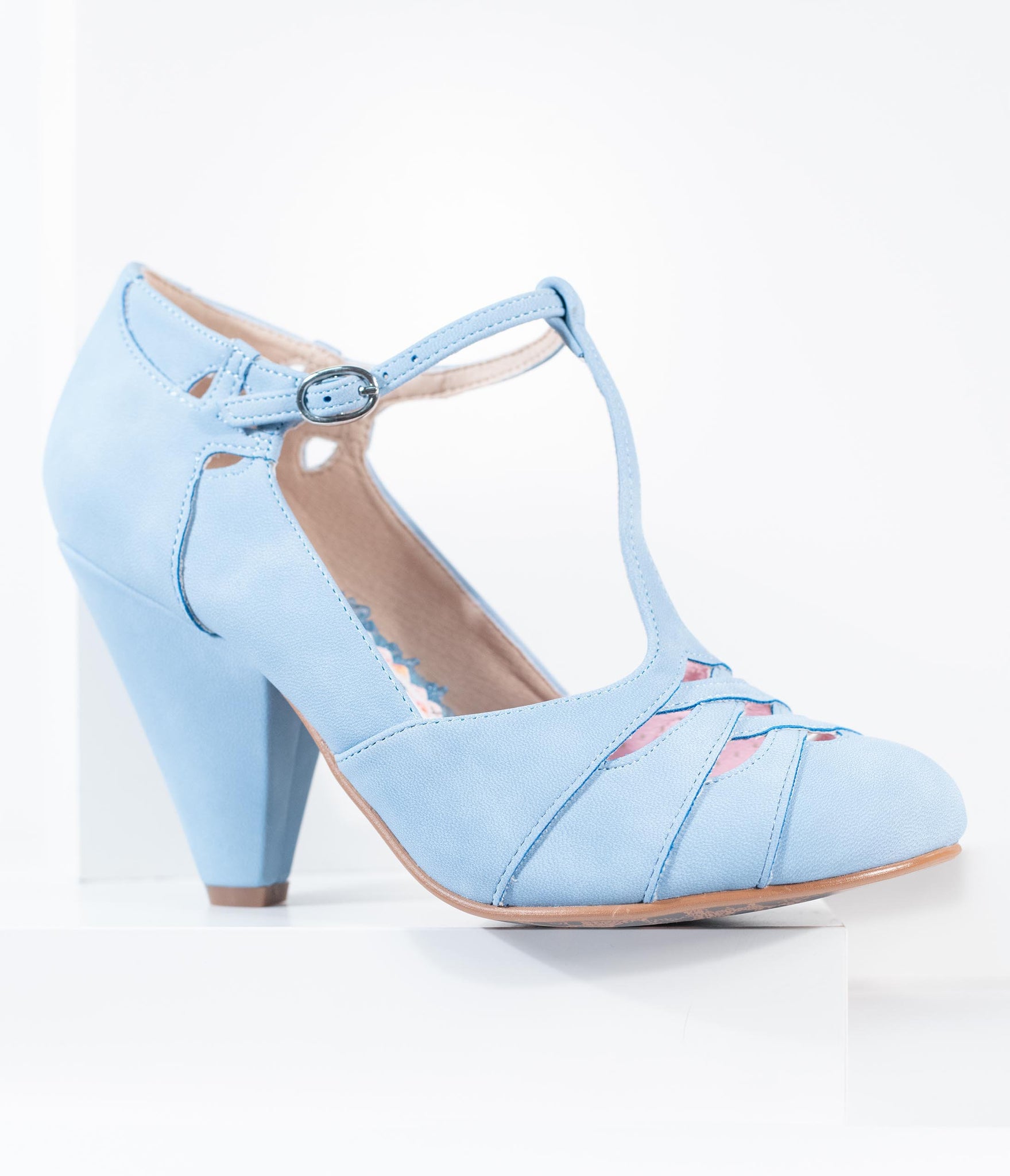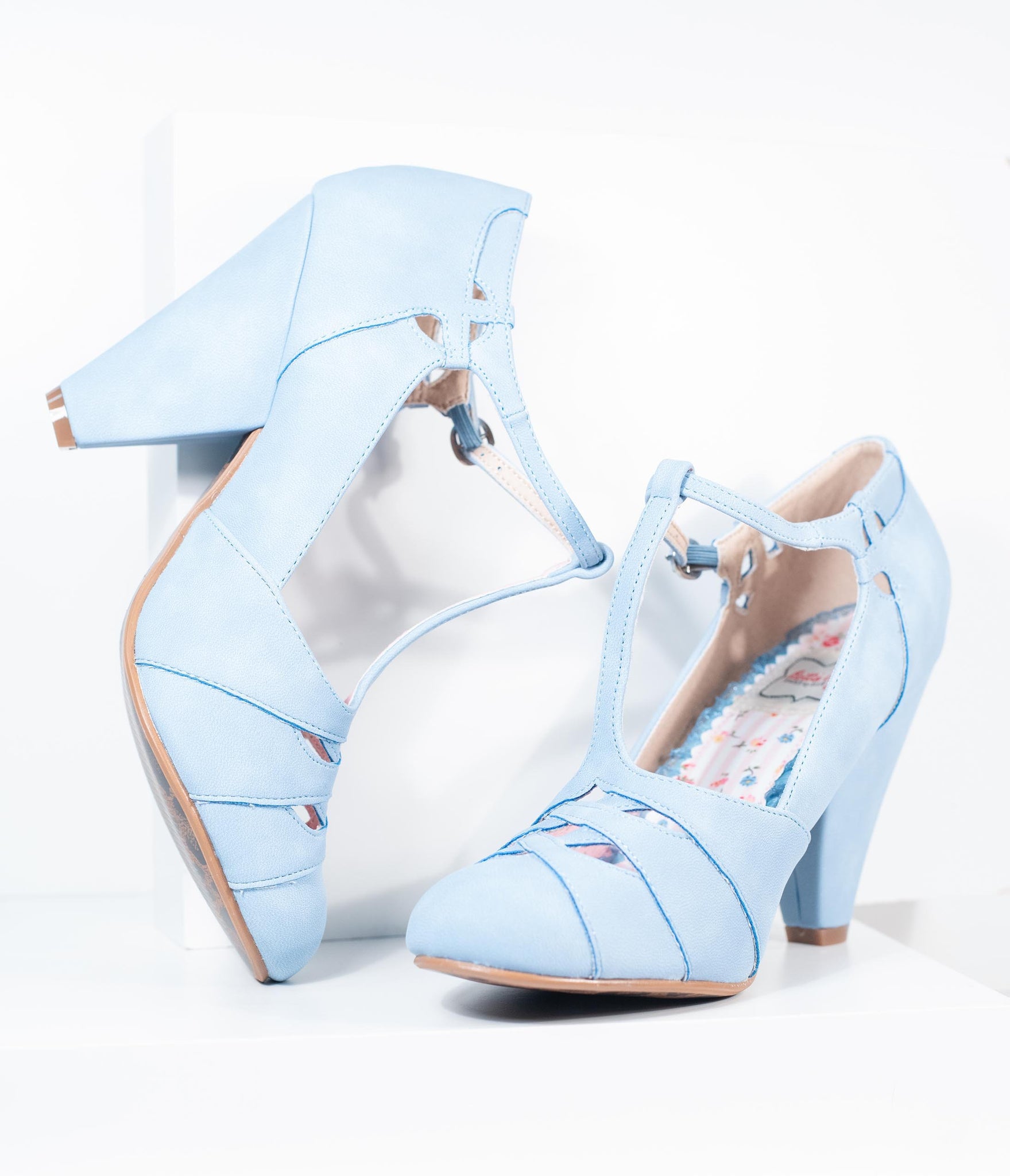 Charmingly cute and endlessly endearing, the Laura Heels from Bettie Page are a delightful pair crafted in a baby blue leatherette and featuring sweet cutout detail throughout the vamp. The fabulous 4 inch cone heel and adjustable t-strap provides stunning feminine vintage style while the cushion insole keeps you comfortable.
