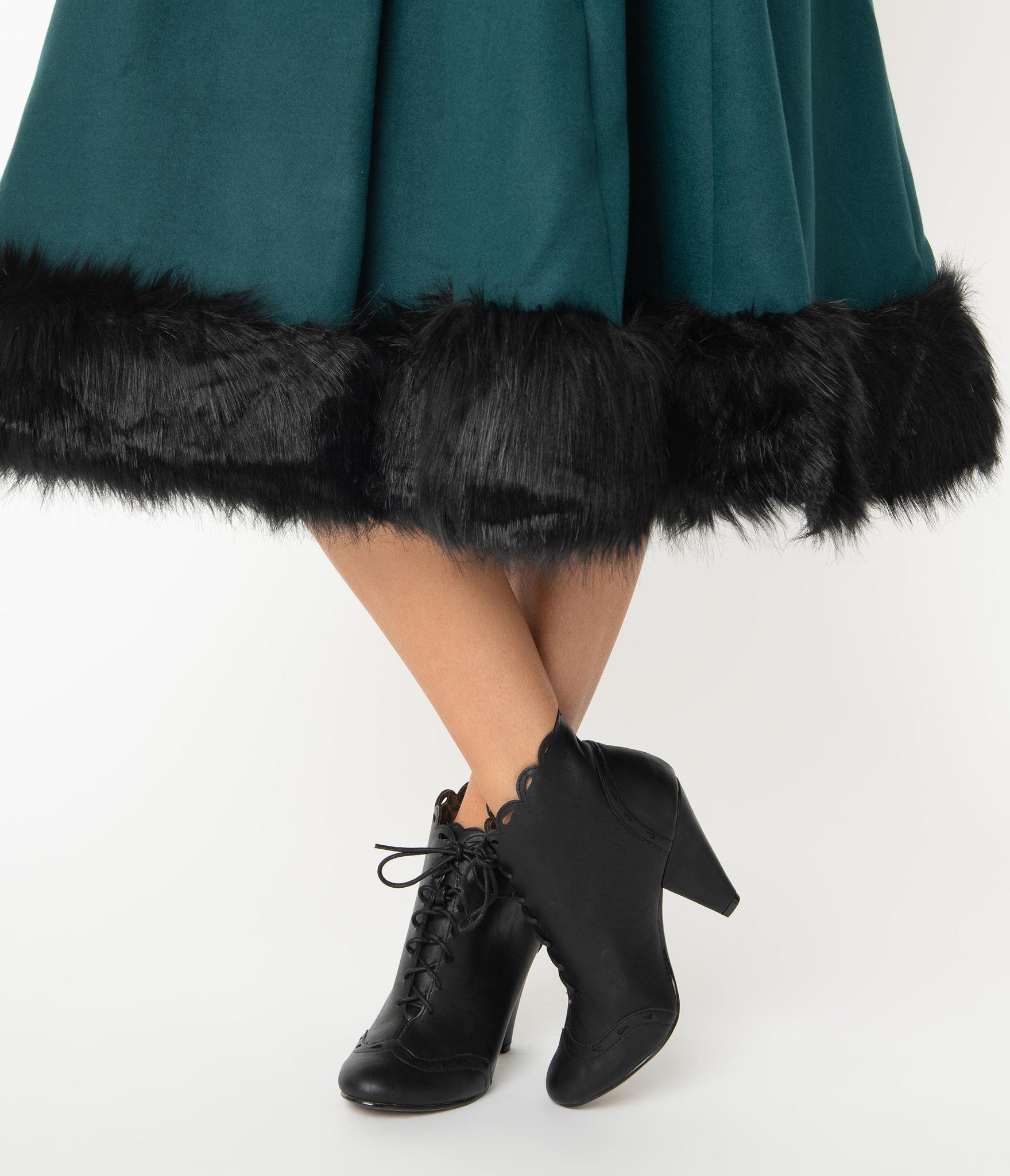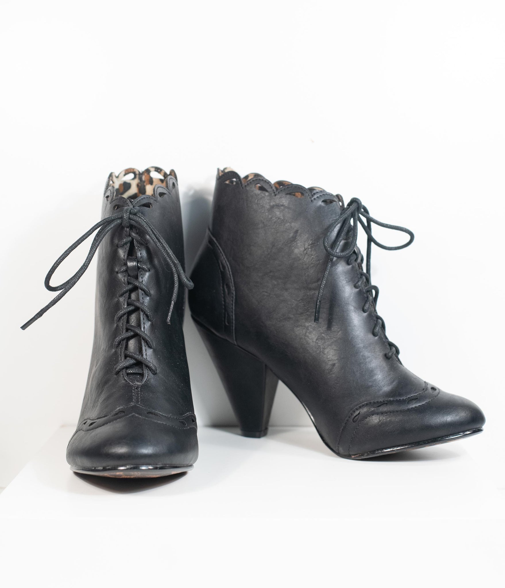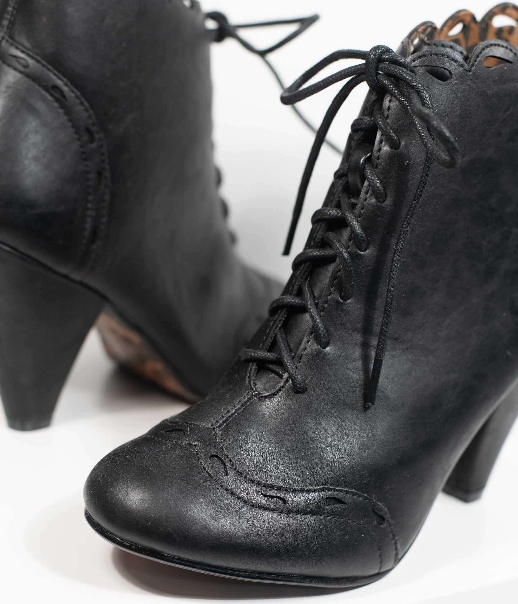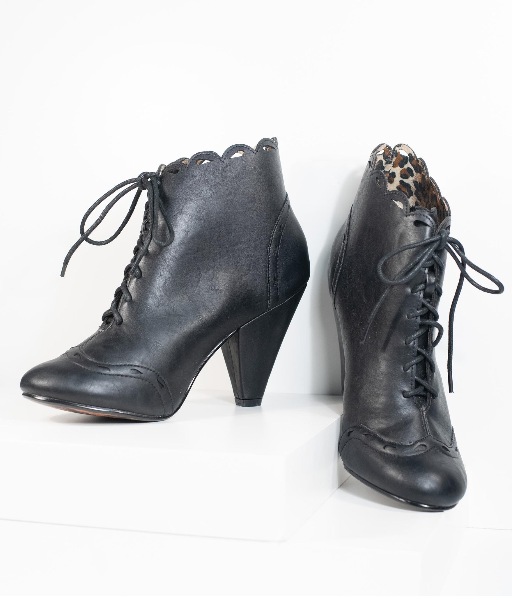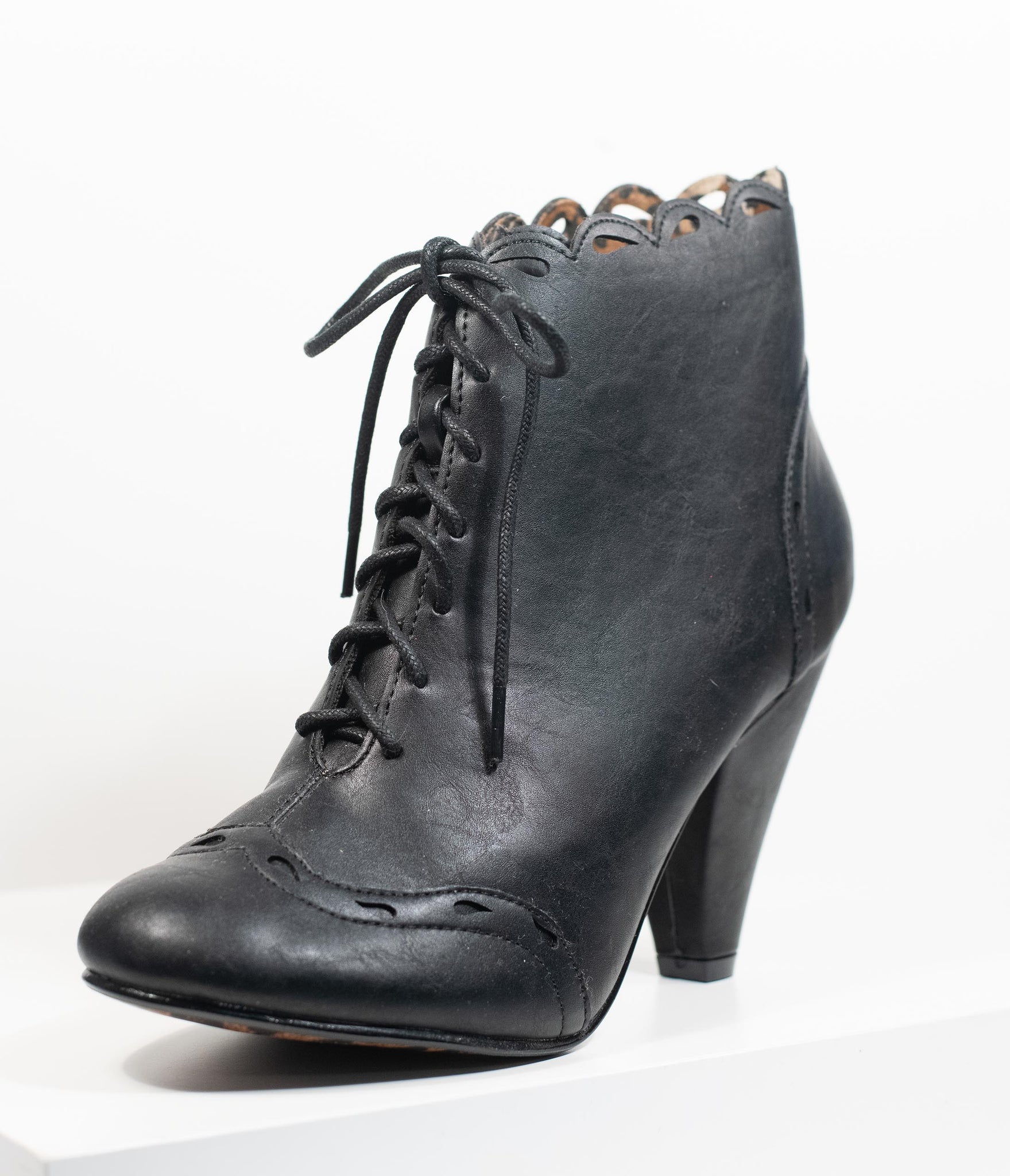 We've got butterflies, dolls! These whimsical booties from Bettie Page are crafted in black leatherette and feature a spectator accent on the toe and heel. Secured with a vintage styled lace up front and outfitted with a dramatic 4” lift, the soft cushion insole and polka dot interior turn this into a pair of favorites!