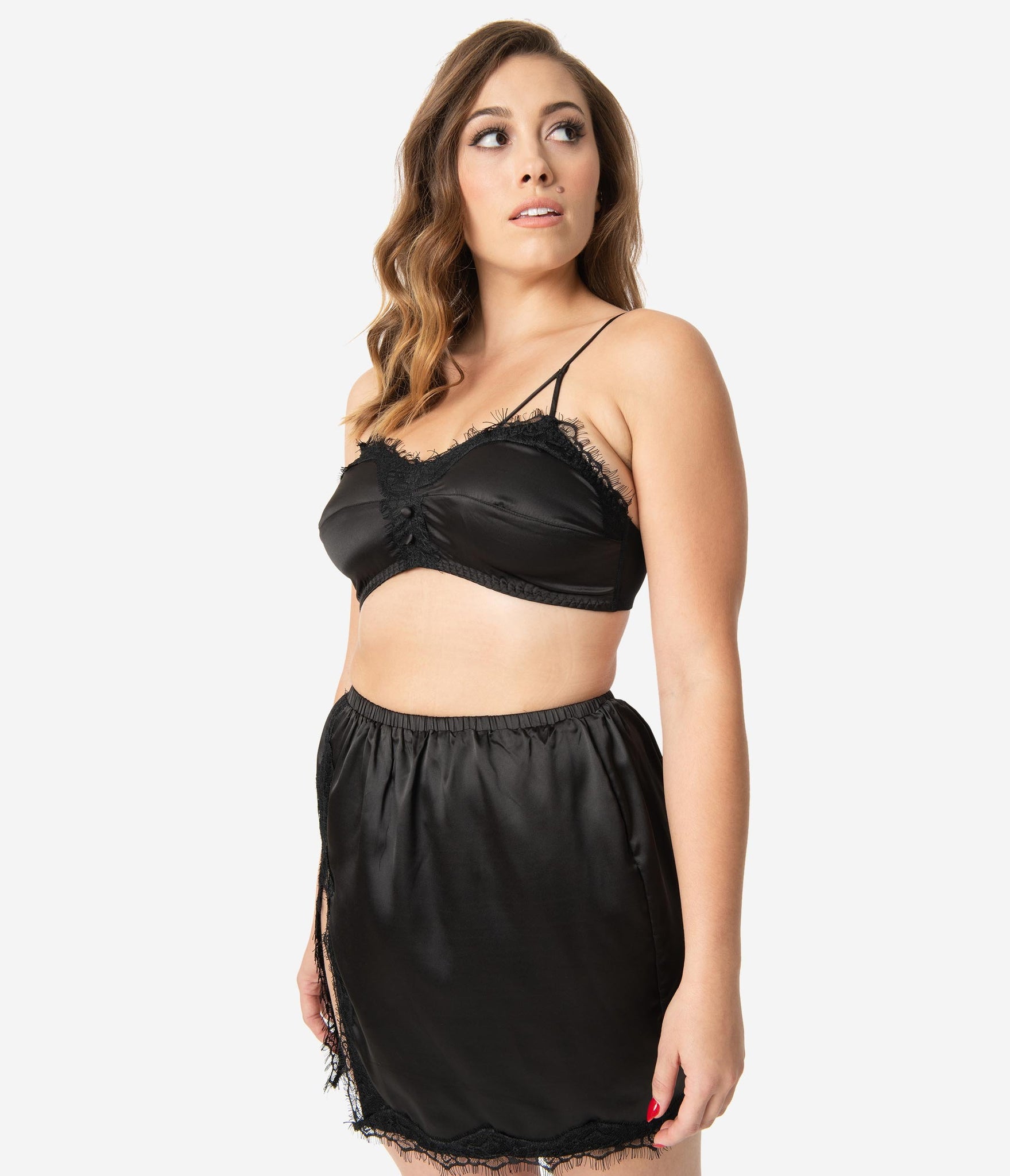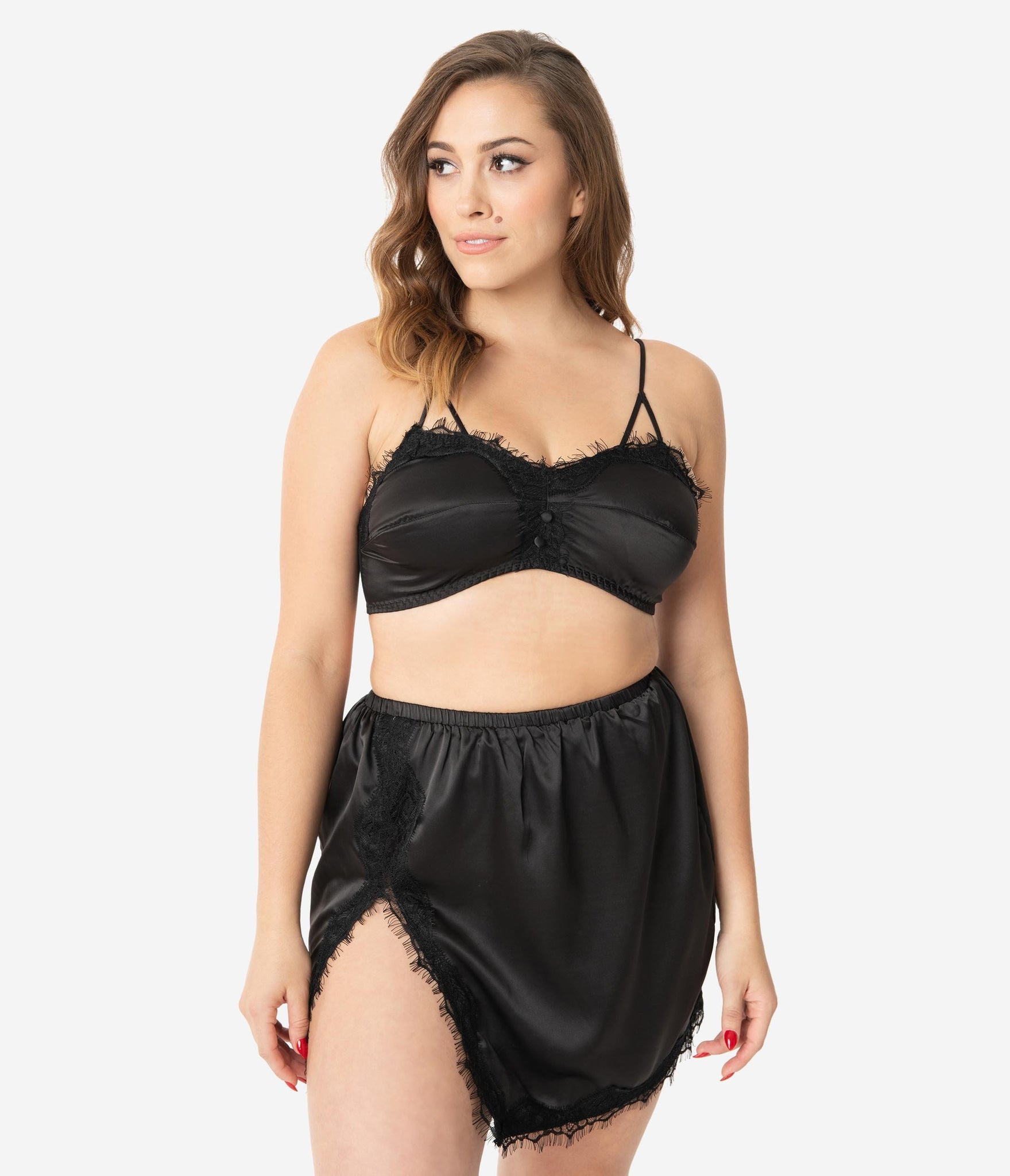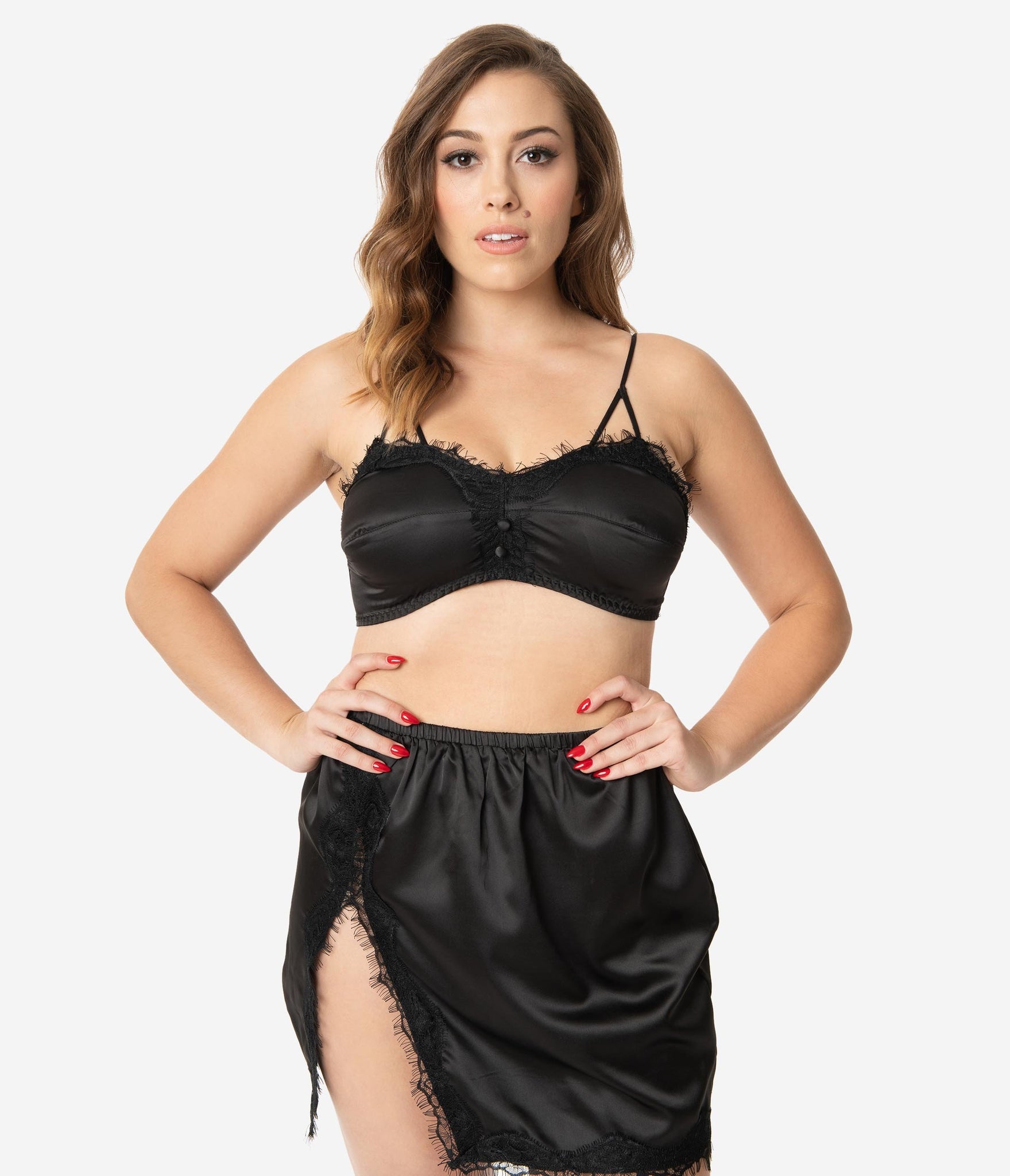 Time to break out your best, babe! This silky black bralette and slip set has gorgeous lace details. Faux buttons add extra detail to the bralette while a slit brings something sultry to the slip. Adjustable straps and hook closure allow for customization while elastic slip waistband provides comfort.