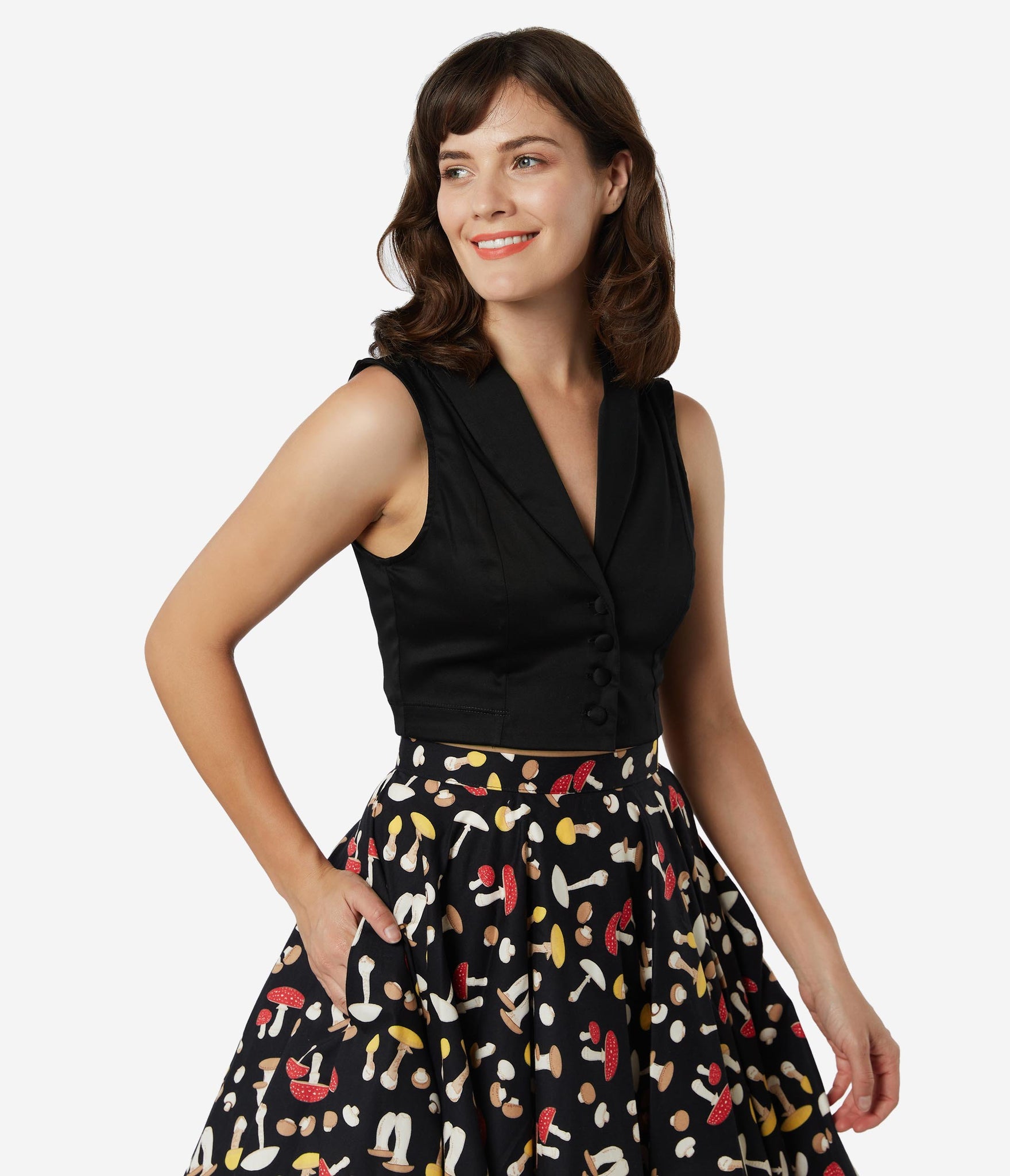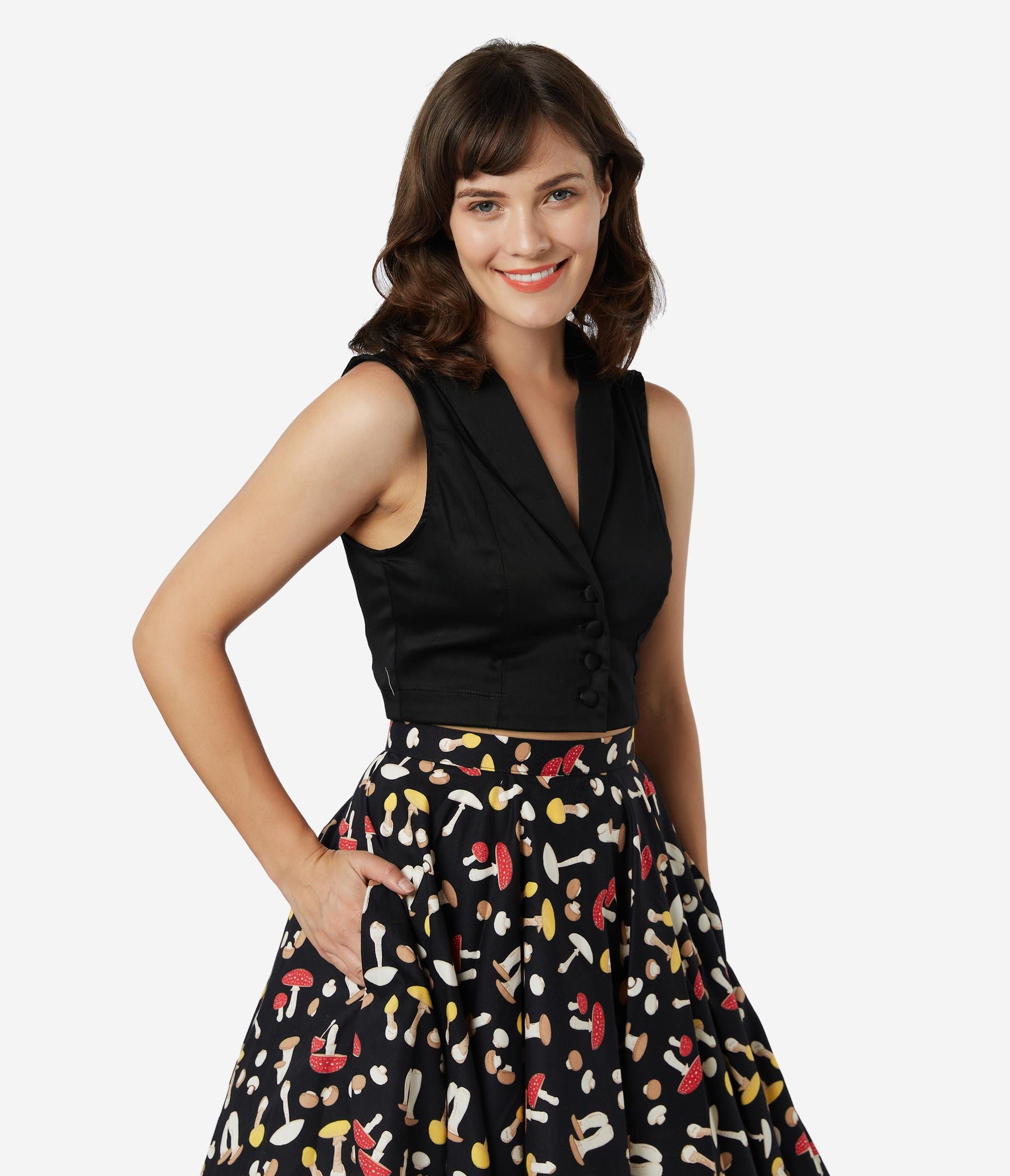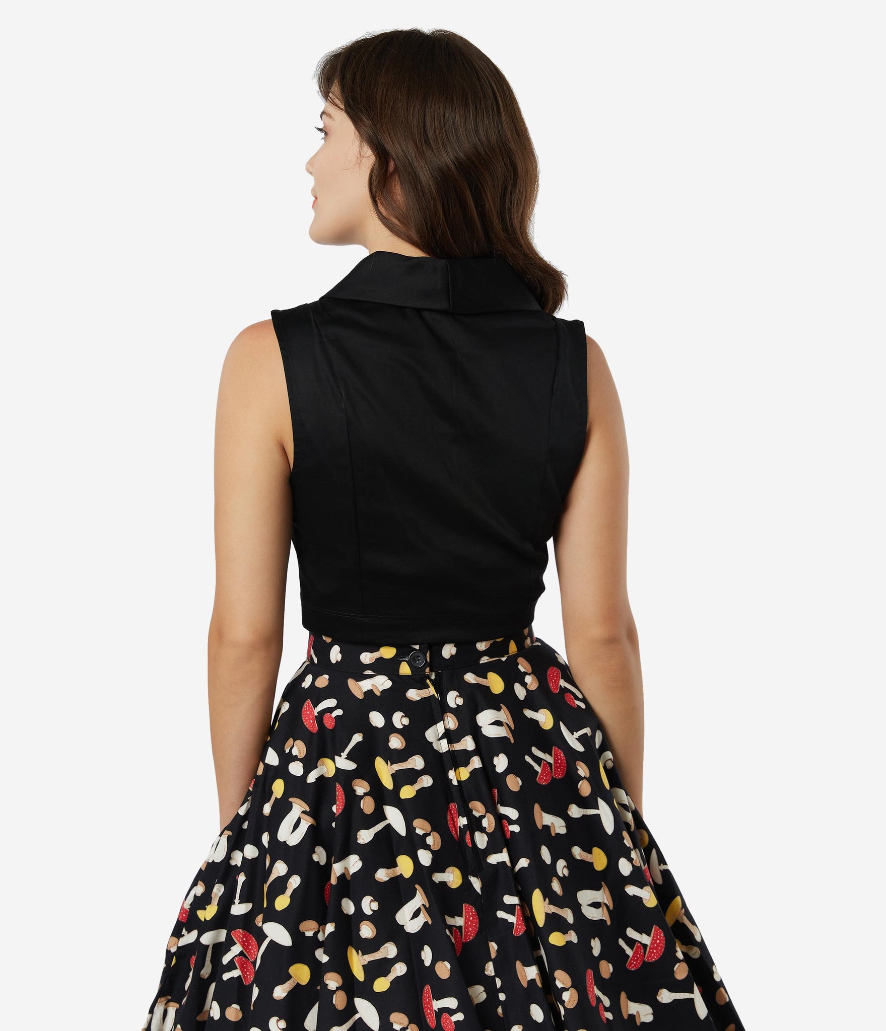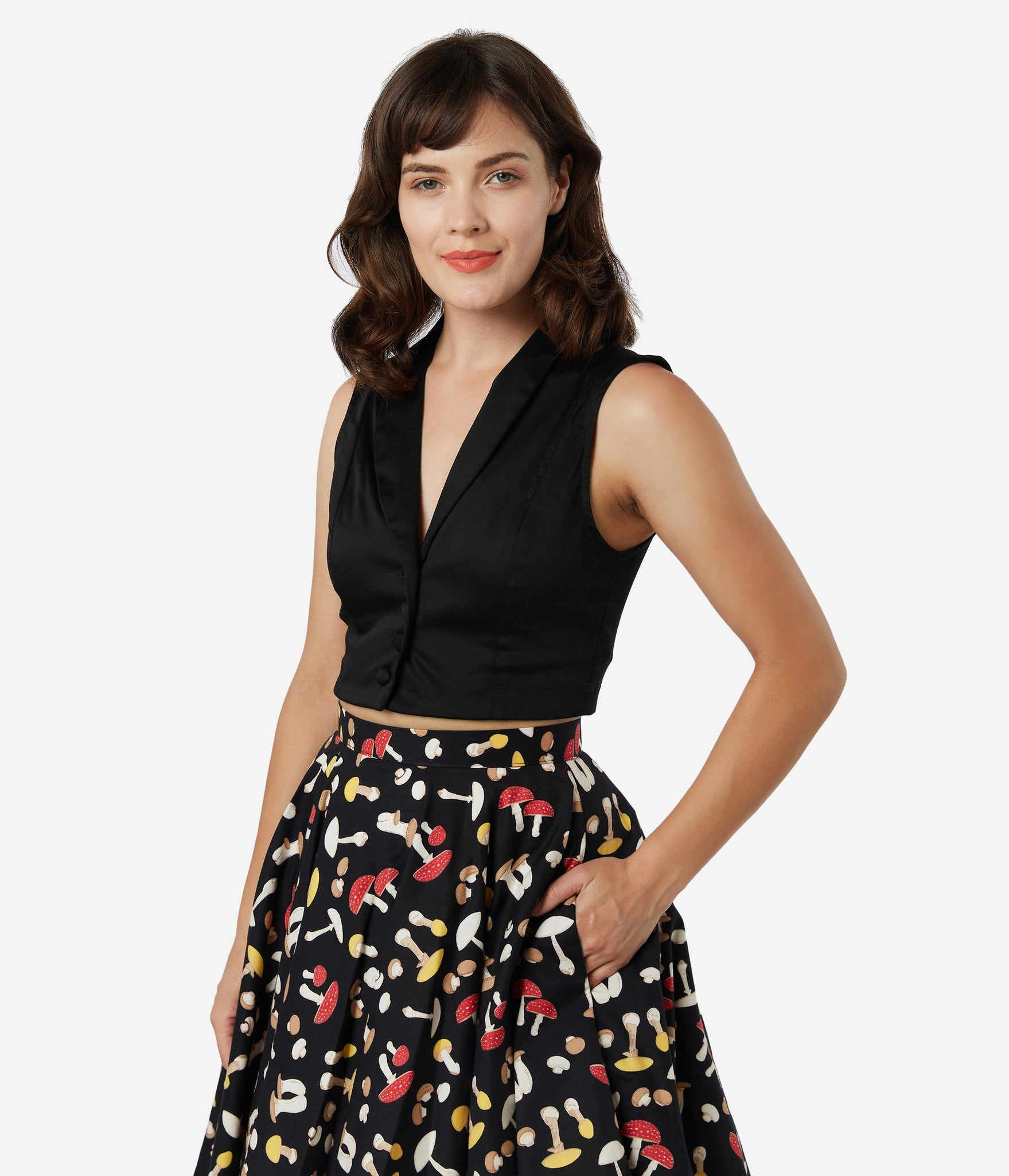 This one makes the cut, dear! A beautiful black top cropped to perfection from Bettie Page and crafted in a lightweight cotton. The button up front leads to a sultry V-neckline, embellished with a classic lapel and striking with a fabulous sleeveless design. Add retro wonder to to your wardrobe essentials!