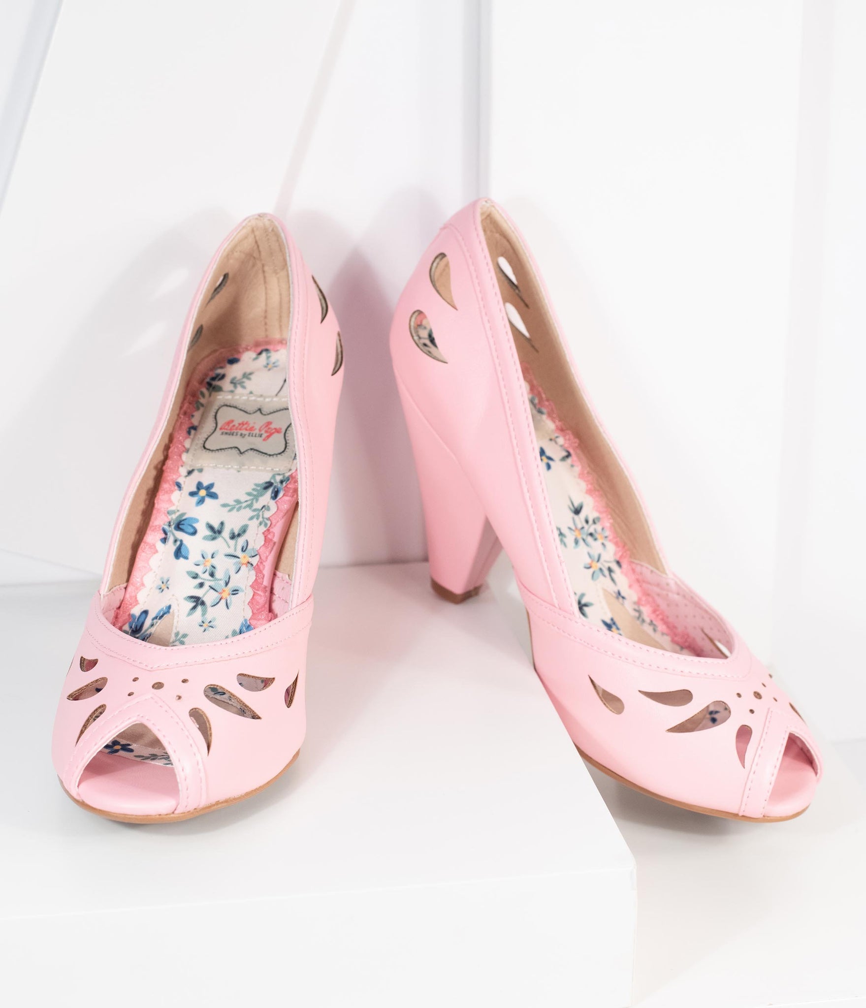 There’s nothing sweeter! These cute pumps from Bettie Page are crafted in a fabulous light pink leatherette and boast charming cutouts throughout. The charming peep toe and stunning 4 inch heel provide perfect pin-up poise while the cushion insole lends comfort day or night!