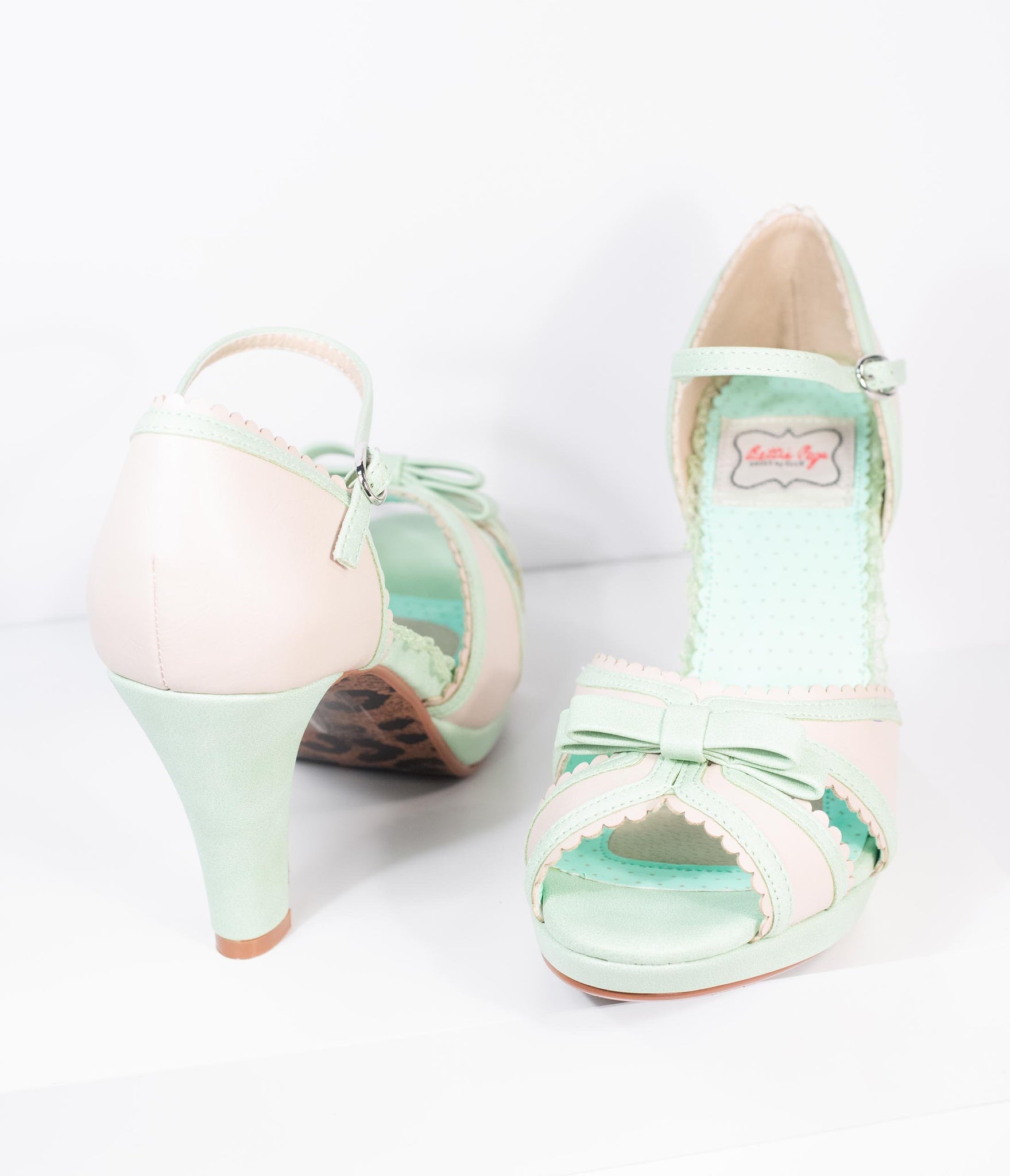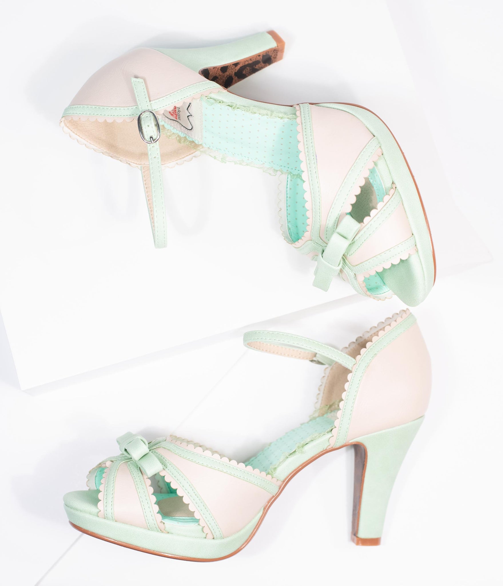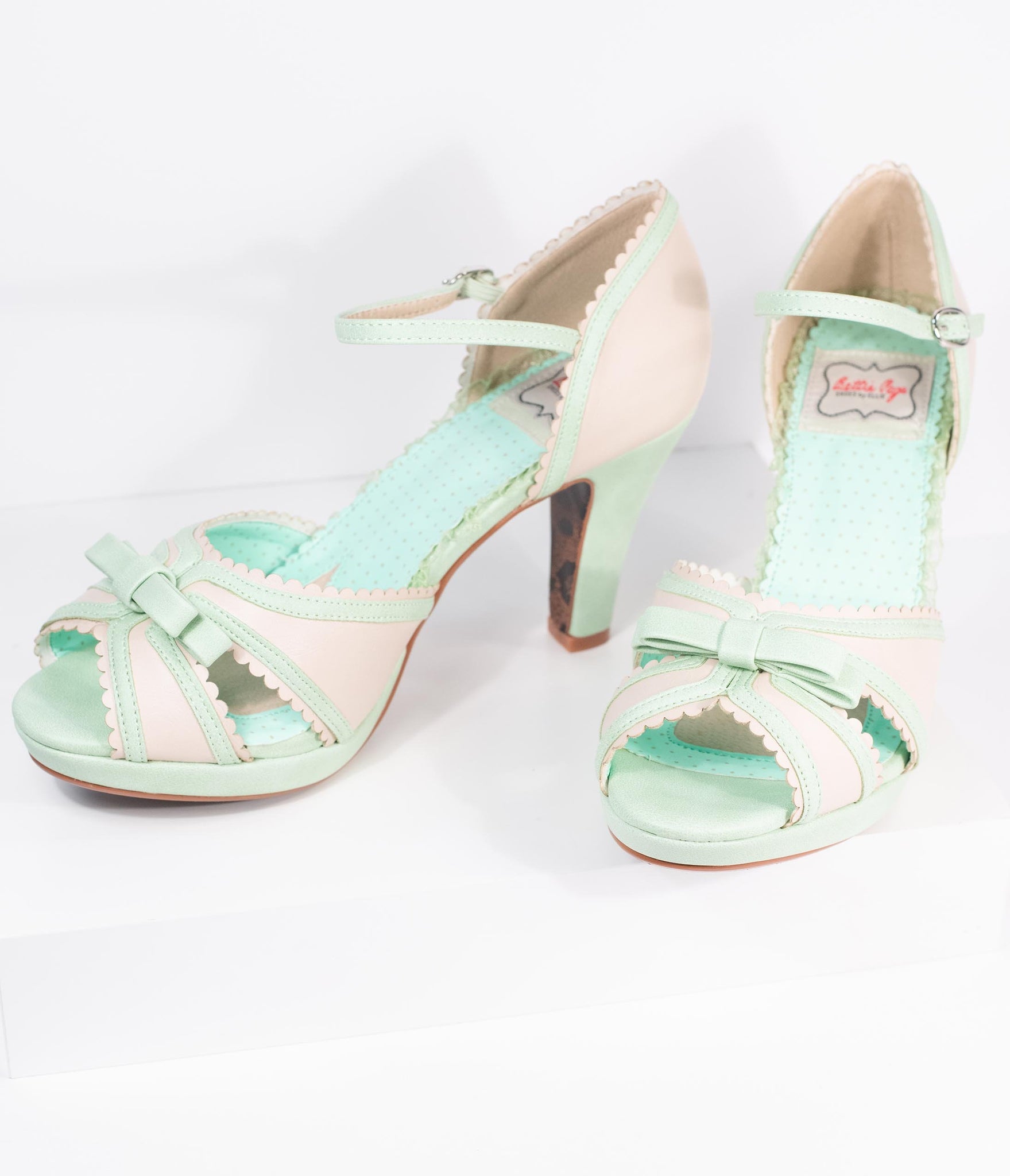 Stop them on a dime! Bettie Page brings you the perfect pair in charming two tones of mint and beige leatherette. The darling peep toe boasts a sweet bow and scallop detail along the vamp while the stunning d’Orsay cut boasts a fabulous 4 inch lift, secured with a gored and adjustable ankle strap. With a cushioned insole, it’s a look you can rely on!