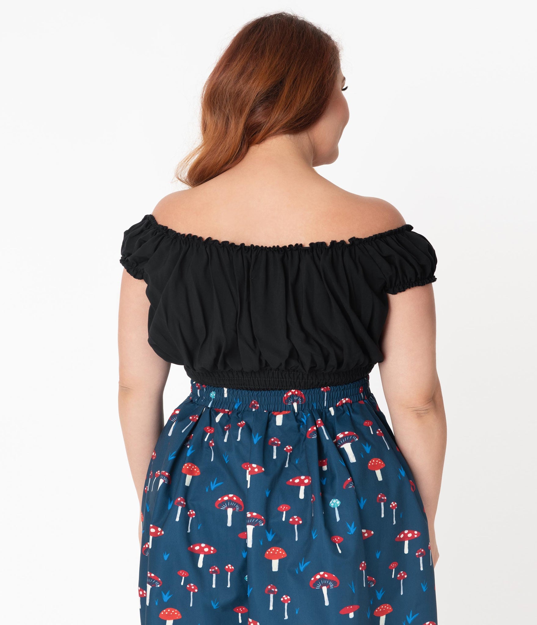 Fresh femininity, dolls! This soft and supple plus size separate from Bettie Page is crafted in a silky blend that radiates romance in a sultry black. A gathered, peasant blouse style boasts an elastic off the shoulder neckline with Bardot sleeves, centered by a string tie detail. A flattering smocked waist shows off your hourglass!
