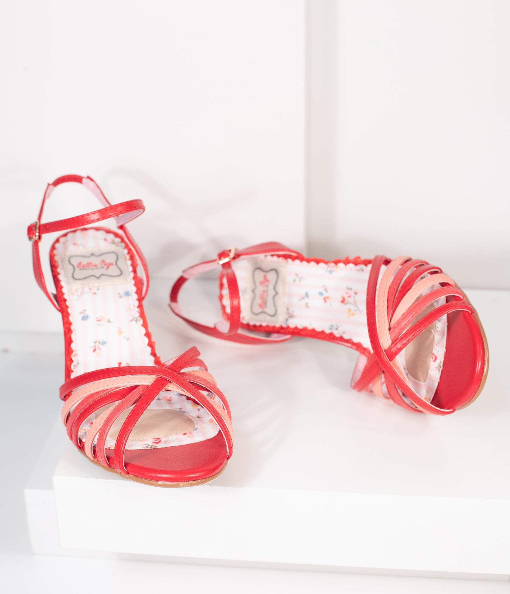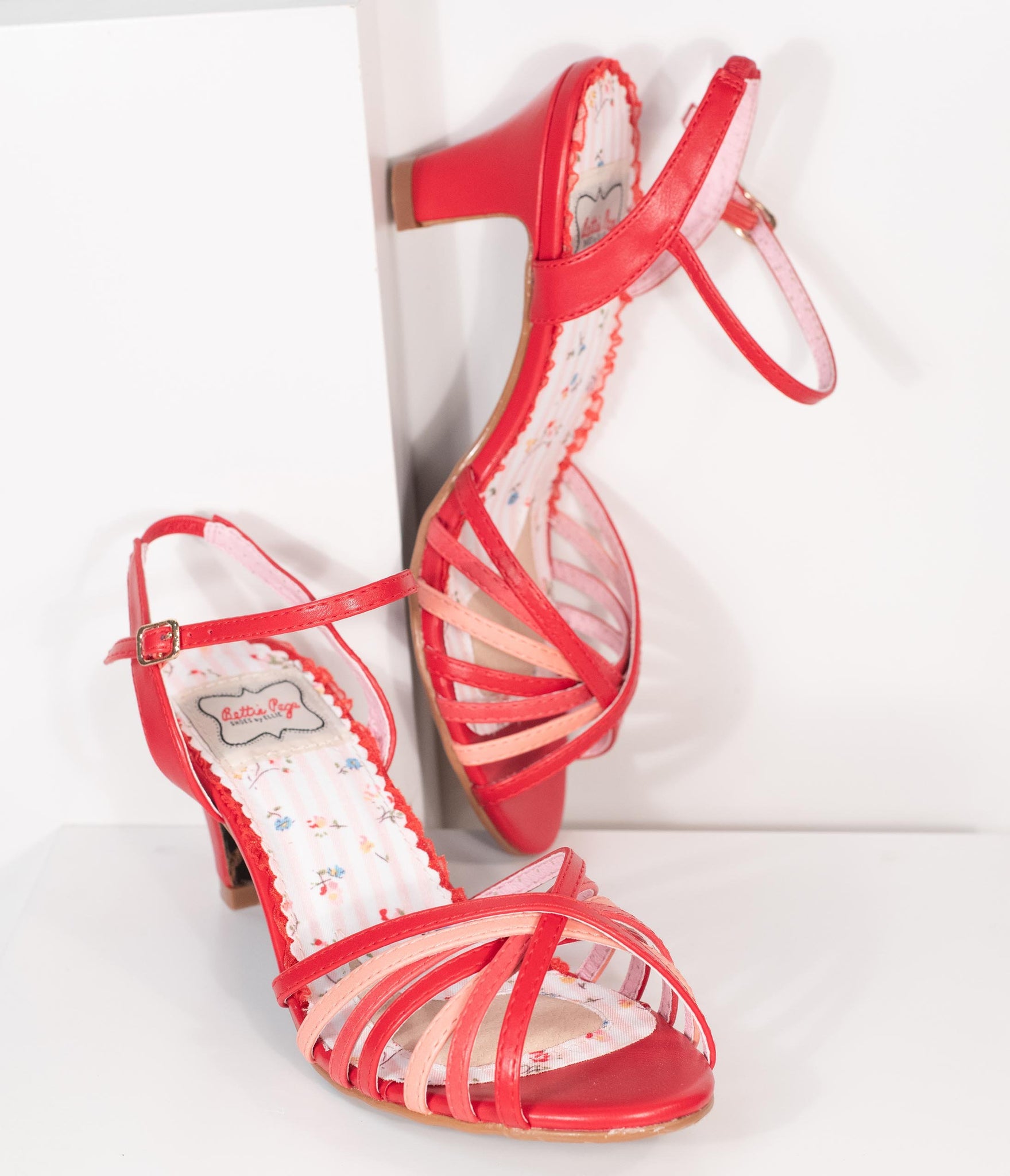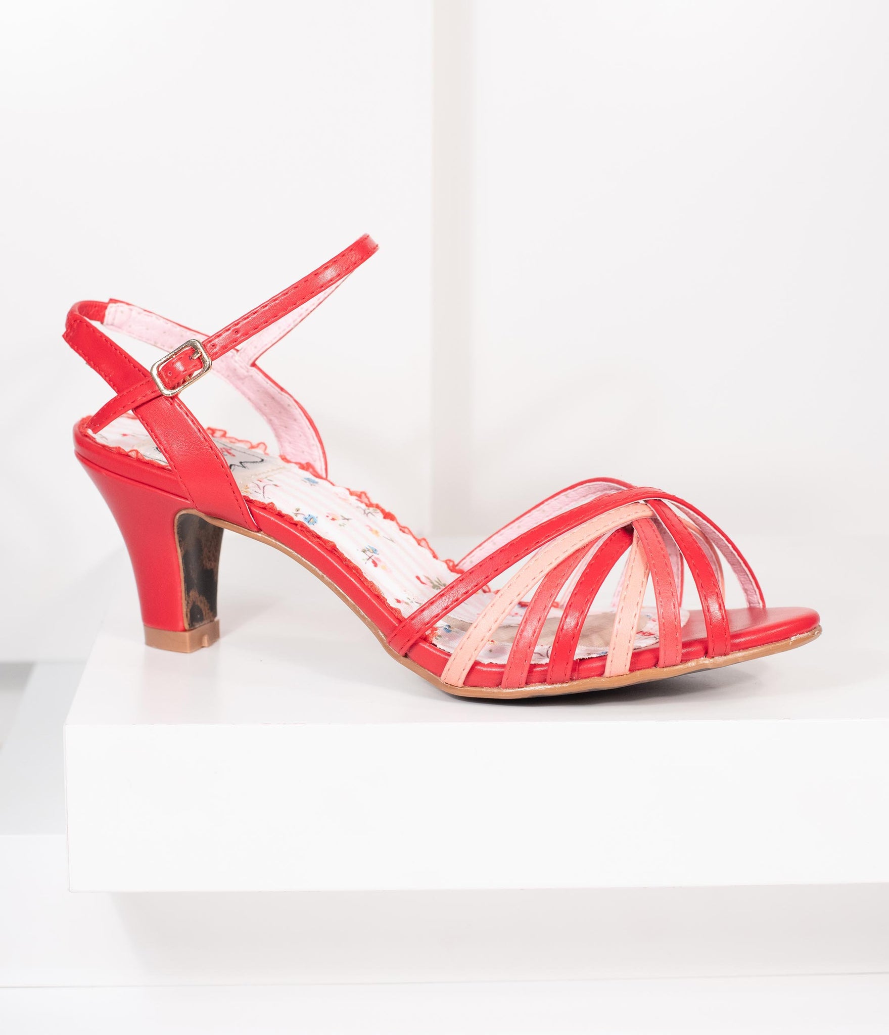 An adventuresome step, darling! A flirty pair from Bettie Page, these charming strappy sandals feature a lovely 2.5 inch heel in a dazzling red and pink leatherette. Crafted with a flirtatious peep toe, the adjustable and gored ankle strap provides secure wear as a cushion insole keeps you comfortable.