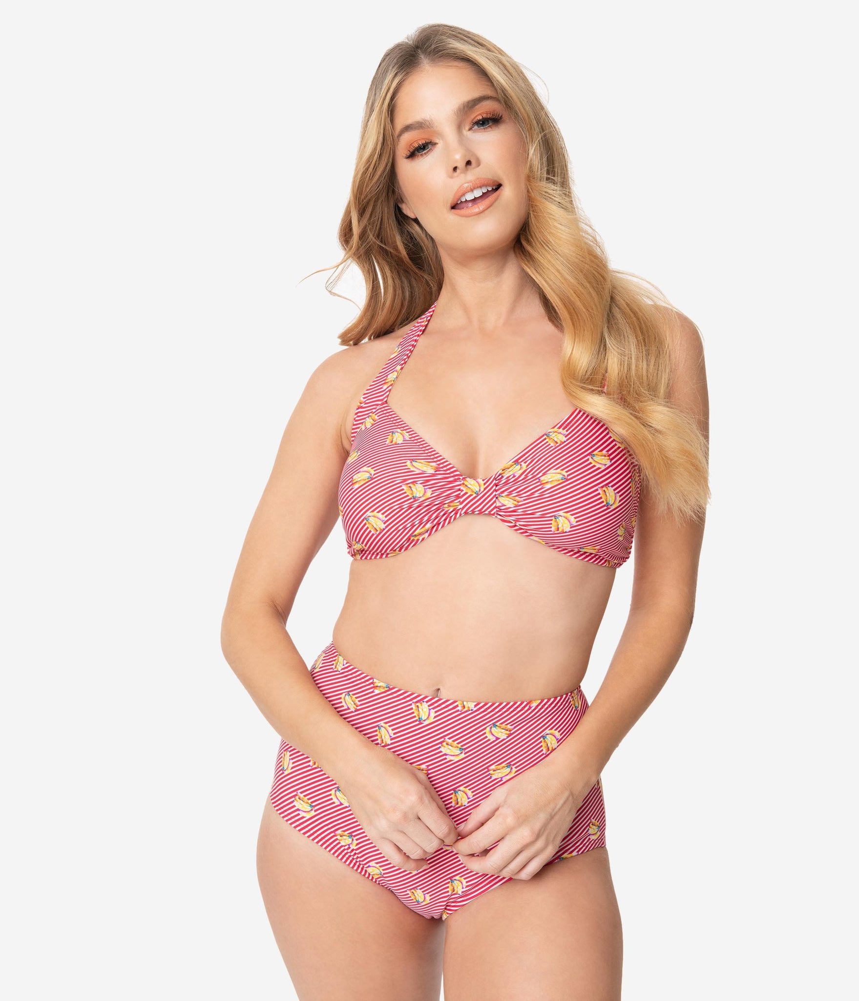 A-peeling retro wear! This sultry swim top from Bettie Page features a dazzling red and white striped pattern with bunches of bananas printed throughout the triangle bikini top. The self tie halter allows for a versatile fit while the sewn in padding lends a subtle boost. Secured with a hook back and structured with side boning, it’s your tropical getaway staple!