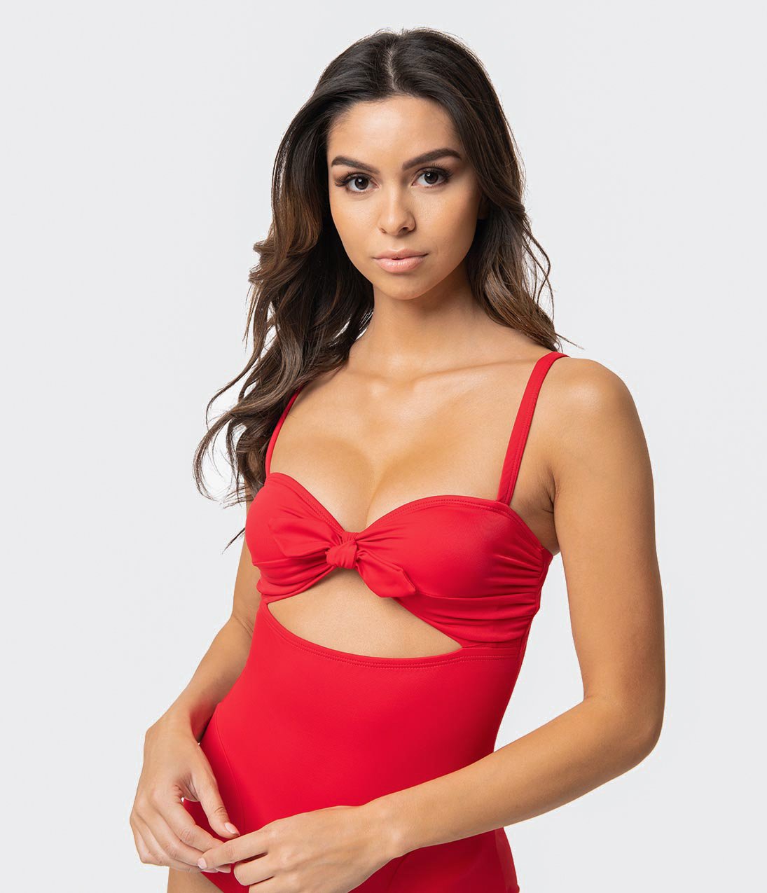 It’s a peerless pin-up look, gals! A divine retro inspired one piece swimsuit from Bettie Page in a gorgeous solid cherry red color! Entirely flattering with front power mesh lining, this striking vintage swimsuit boasts a sultry front cutout under a sweetheart neckline, centered by an adorable bow. The straps curve around to the back and secure with a hook while subtle padding provides comfort. With low cut legs to keep things chic, don’t forget the shades, dear.