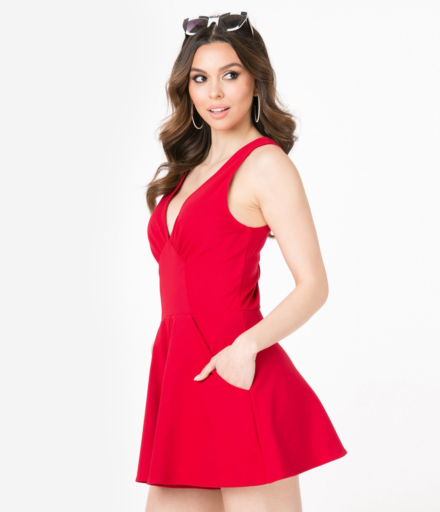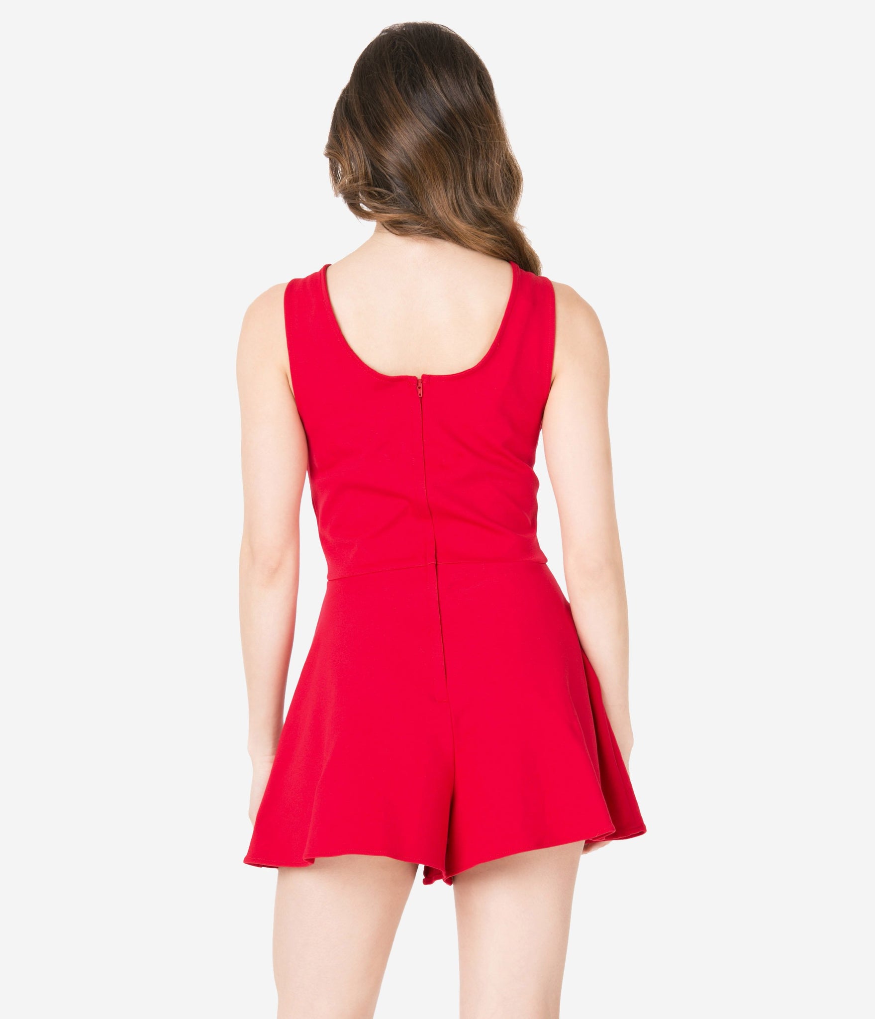 Give ‘em whiplash, darling! Set their hearts ablaze in this sultry red romper from Bettie Page, crafted in a sturdy stretch knit for an all day affair. The plunging V-neckline drops to a pointed center panel with subtle gathers while the sleeveless form is meant for sunny days. The flare shorts are outfitted with side pockets while a back zipper cinches in your figure!
