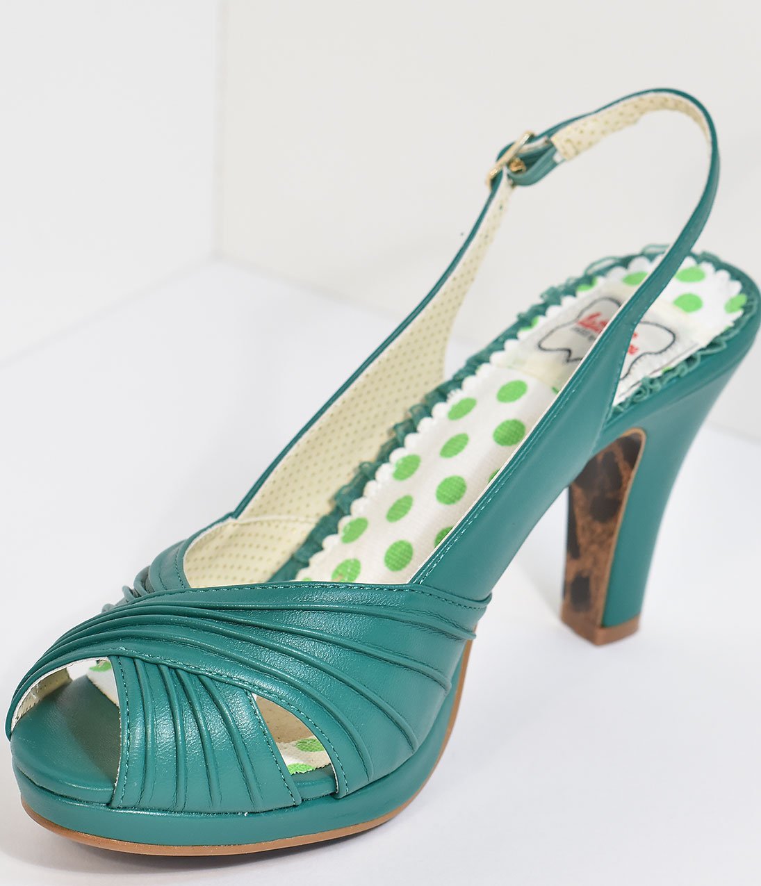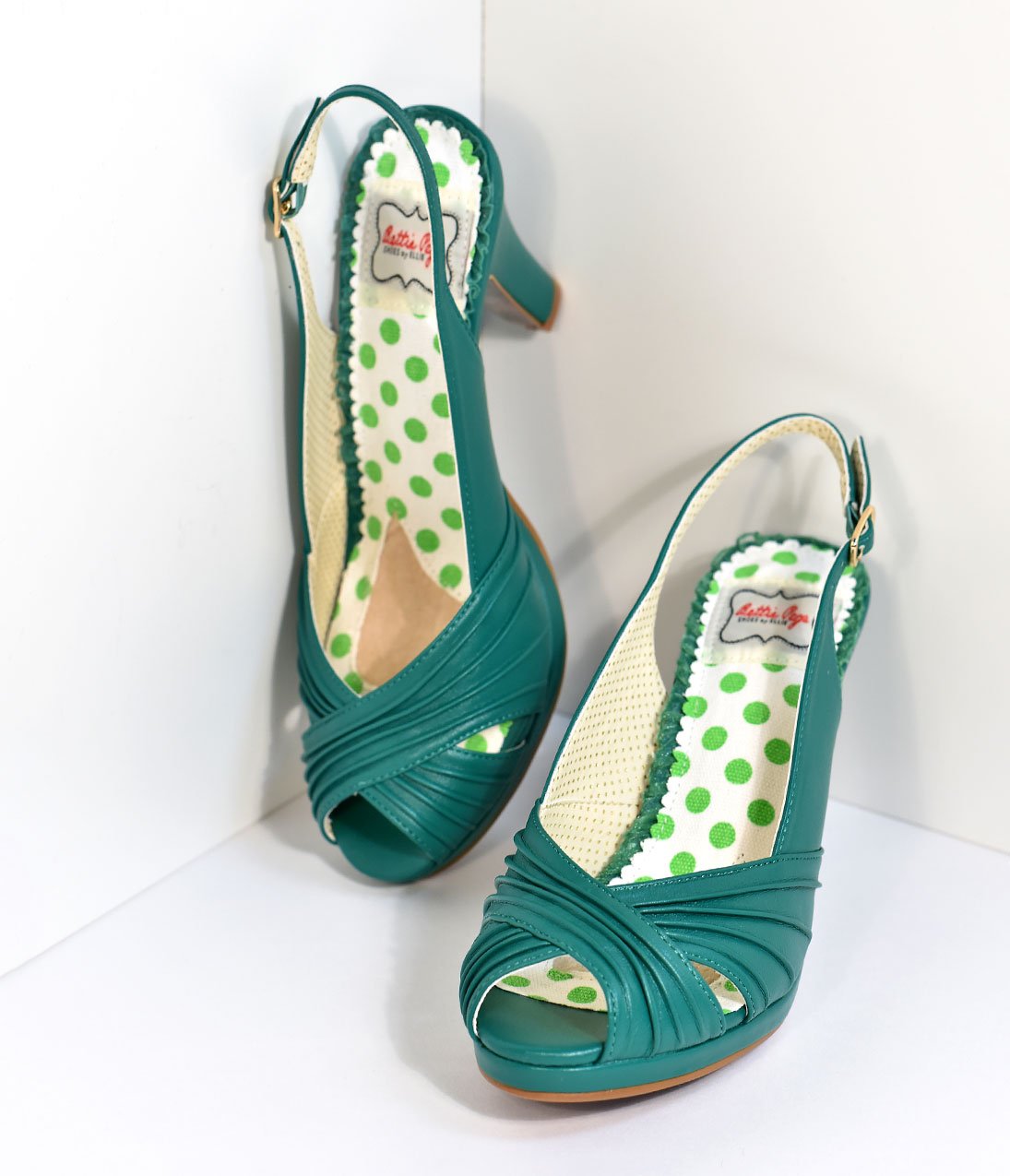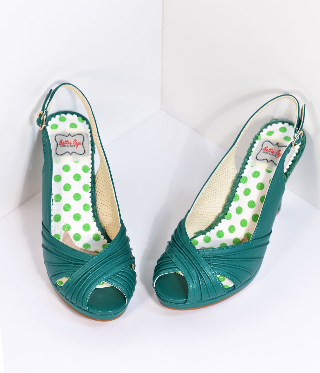 Gorgeous in green, Bettie Page is bringing you the perfect pair of heels! The green Selene heels are crafted from lovely leatherette, comfortable insoles for everyday wear, and sling-back straps. A 4" heel is complemented by touches of polka dot lining, and subtle ruffles around the edges. The criss-cross ruched effect completes these heels for a look you can rely on!