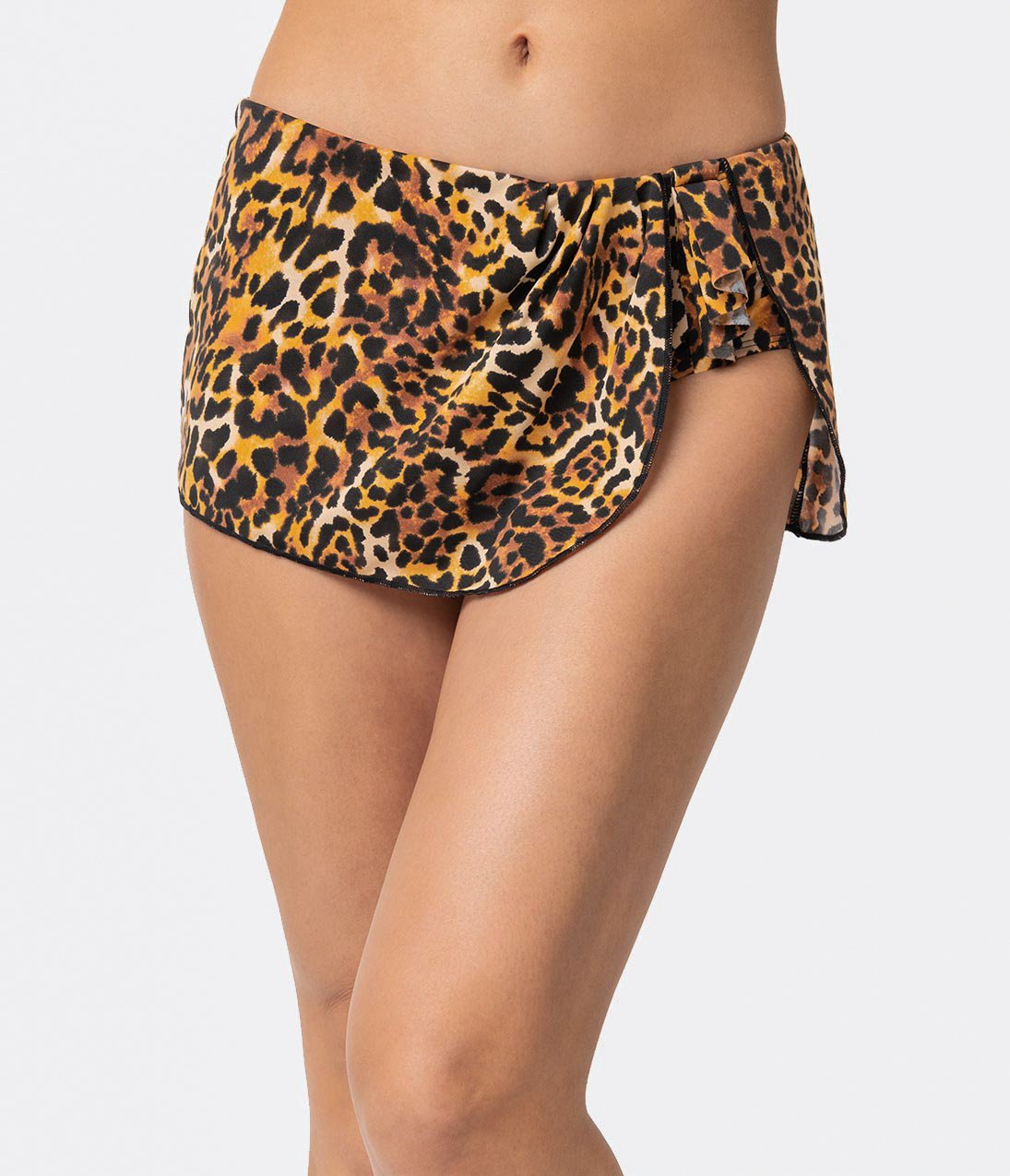 A lucky catch, darling! This ferocious vintage inspired swim bottom from Bettie Page is wild with Pin-up pizzazz with it’s ravishing leopard print and fashionable vintage stylings. The front mesh lined bikini bottoms boast an adorable faux sarong style wrap with an accordion flair at the hip. Everything is in order!