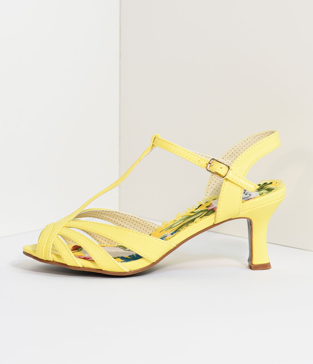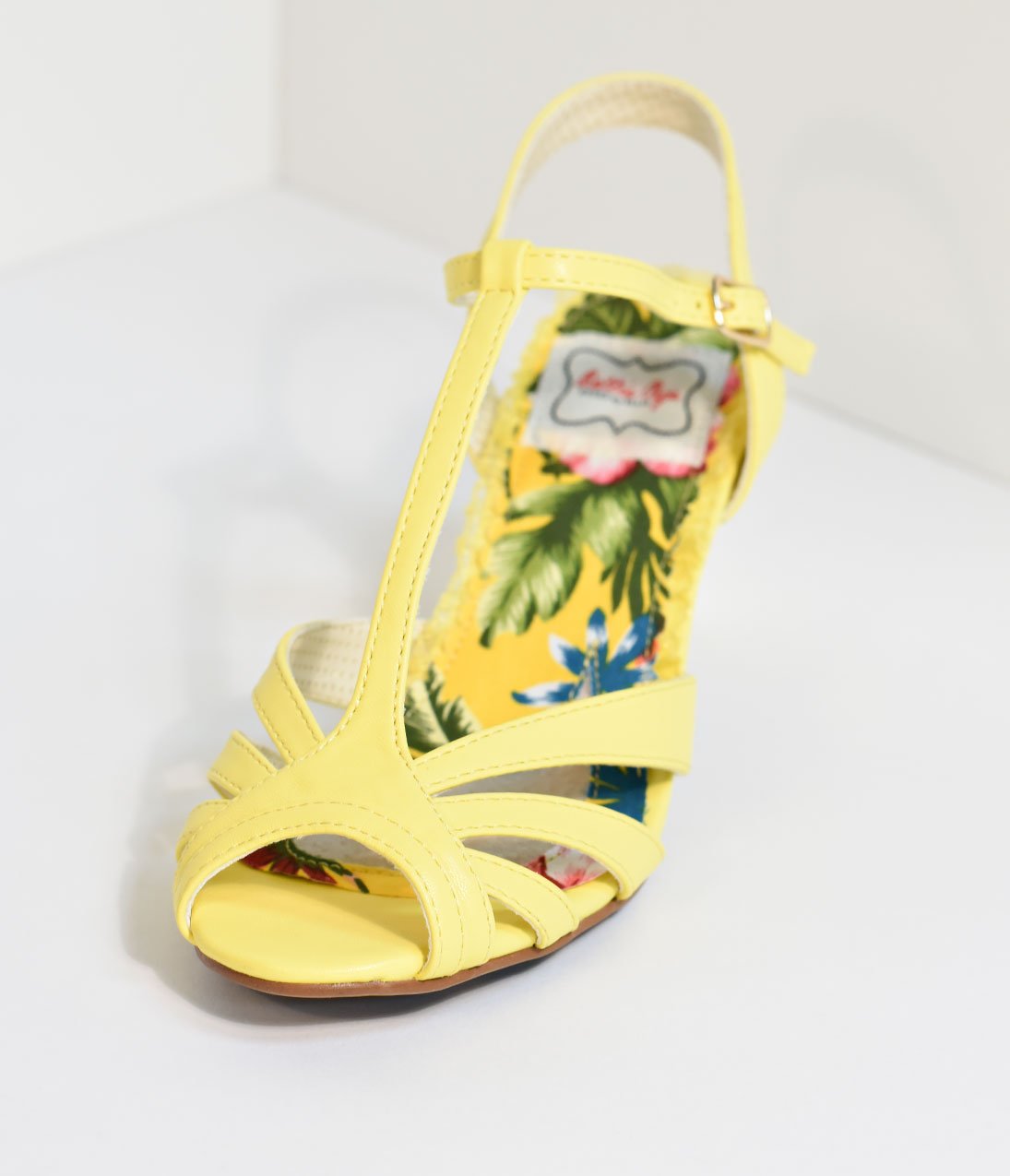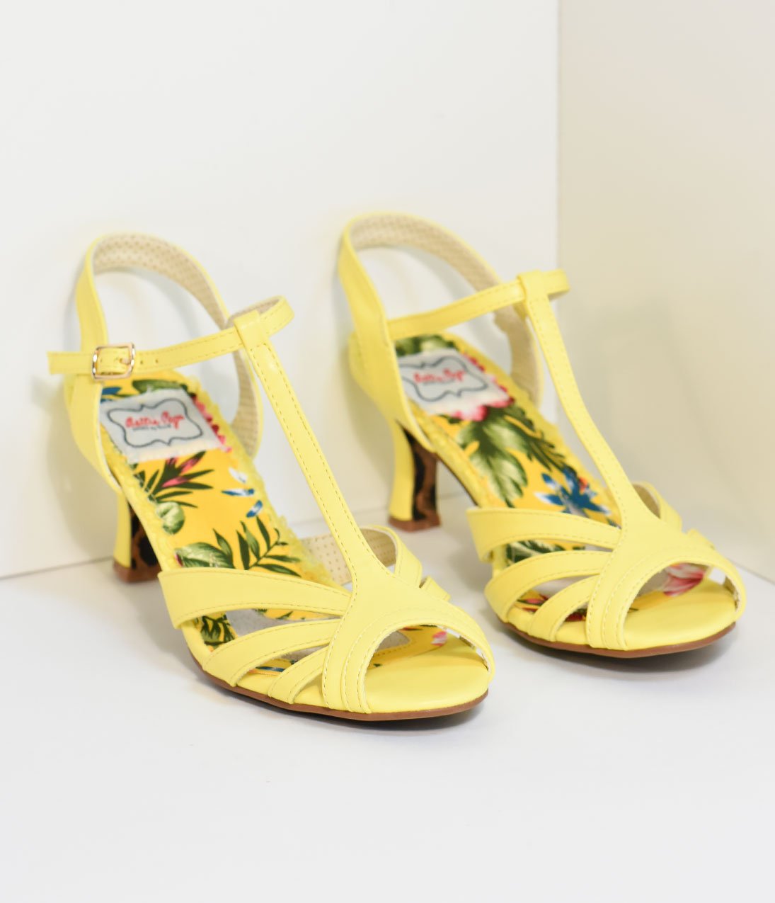 When life gives you lemons, slip on your yellow Layla heels! These Bettie Page 3" vintage- style heels are bringing color to your wardrobe. Crafted with yellow leatherette, tropical lining, and comfortable insoles the Layla T-Strap heels flaunt a flawless peep-toe cut out you can feel comfortable in. It's bold and beautiful darling!