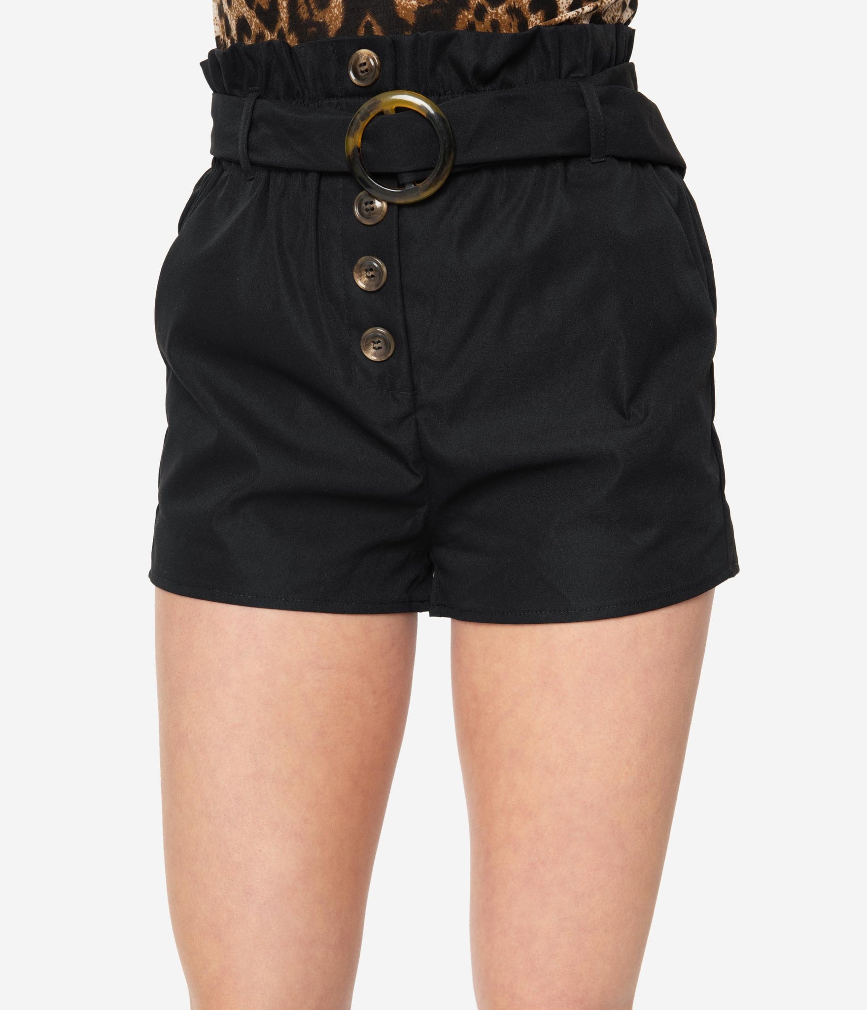 Wrapped and ready, babe! These cotton stretch shorts are cast in a rich black color. A button up front featuring tortoiseshell buttons accented by a self tie belt with matching tortoiseshell belt loop. A paper bag waist cinches in your figure on these shorts featuring side pockets. All aboard for spring, darling!
