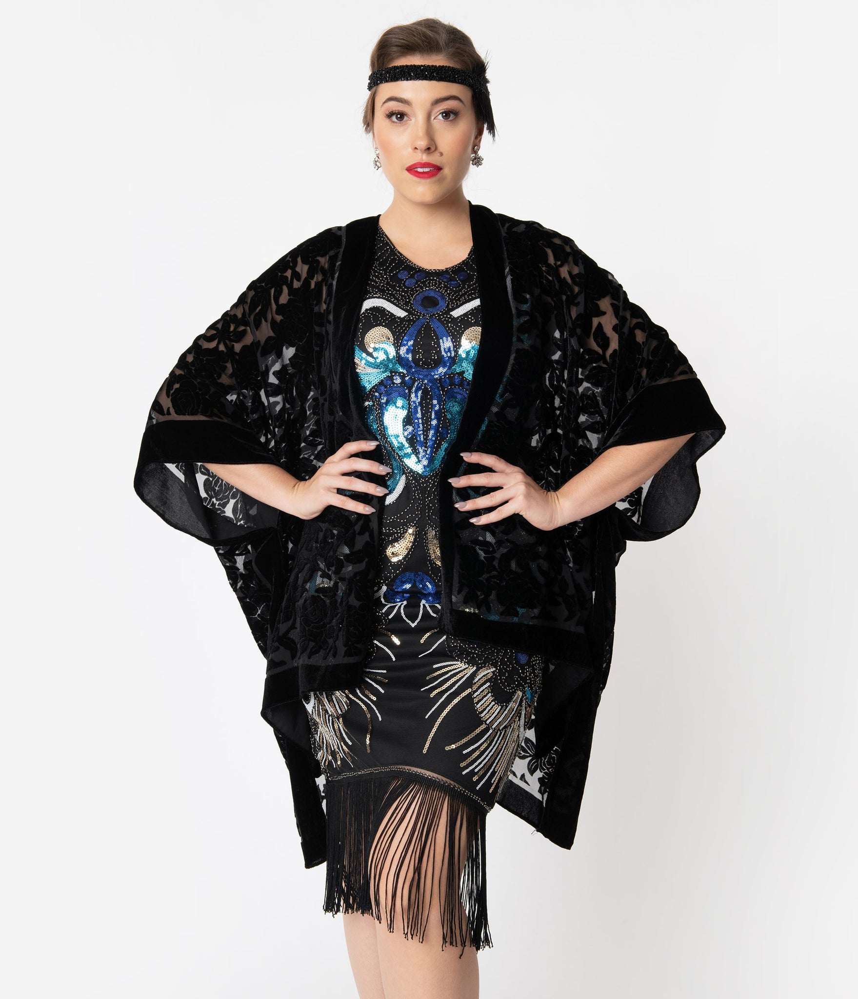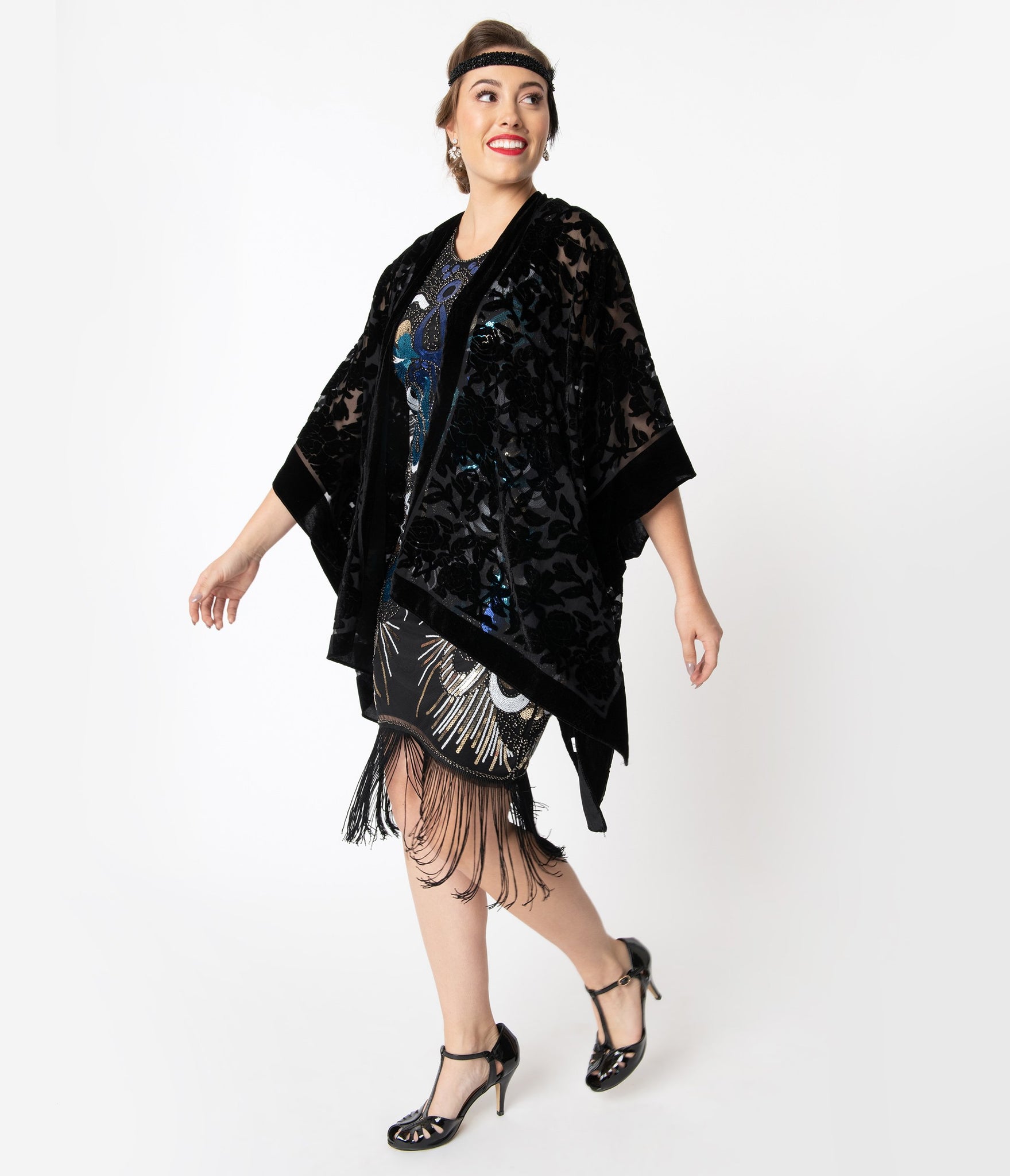 Sultry and sophisticated, this vintage style kimono is crafted in a rich sheer black with velvet burnout floral throughout and accented in thick velvet trims. The open front and flowing kimono sleeve provide an easy coverup to your jazz era ensemble! Available while supplies last.