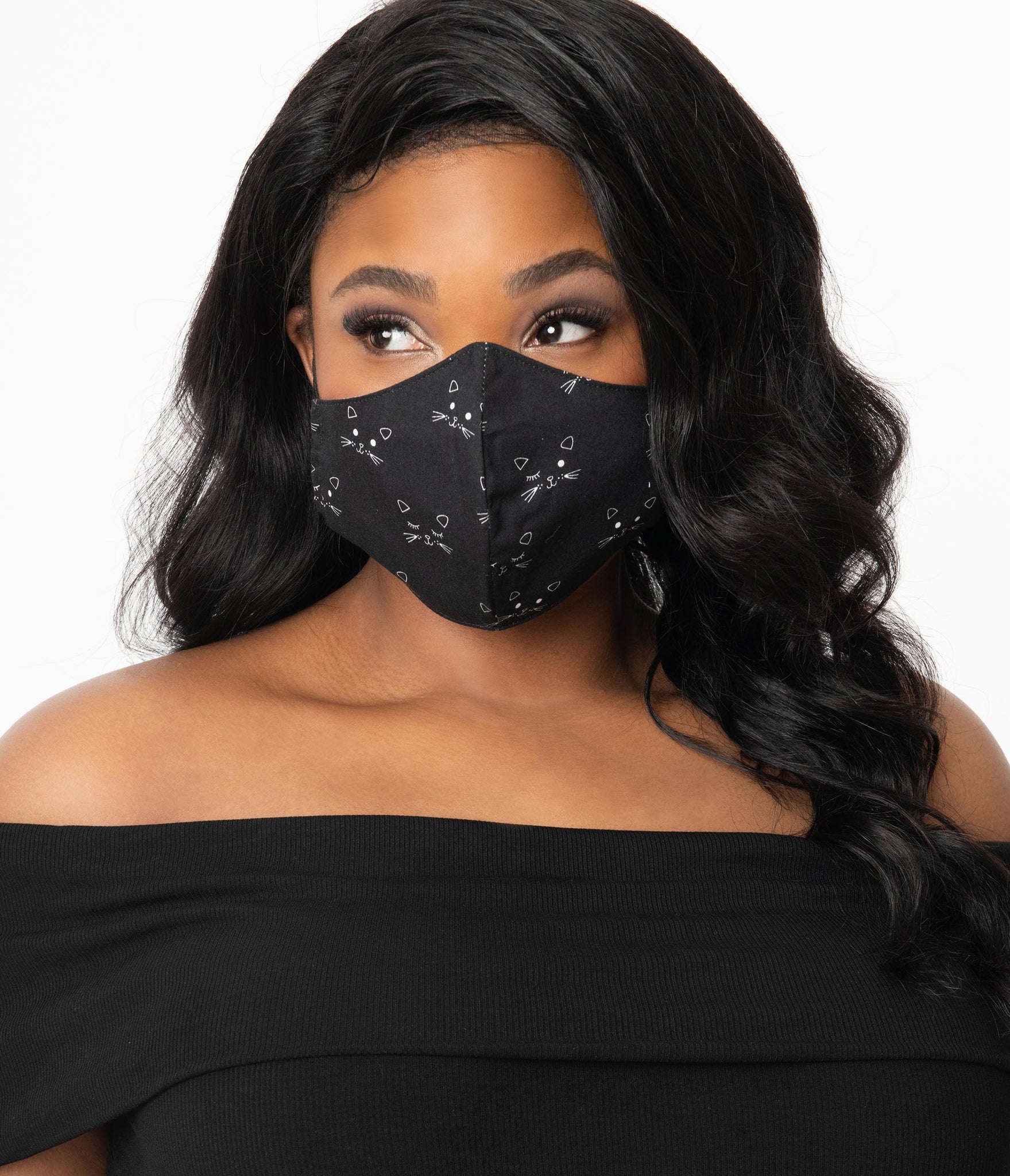 Stay stylish and safe! This purr-ific face covering features adorable ivory cat face pattern throughout a black cotton backdrop. Comfy and cute with elastic ear loops and an inner pocket for a filter, now’s the time to learn how to smize! Available while supplies last