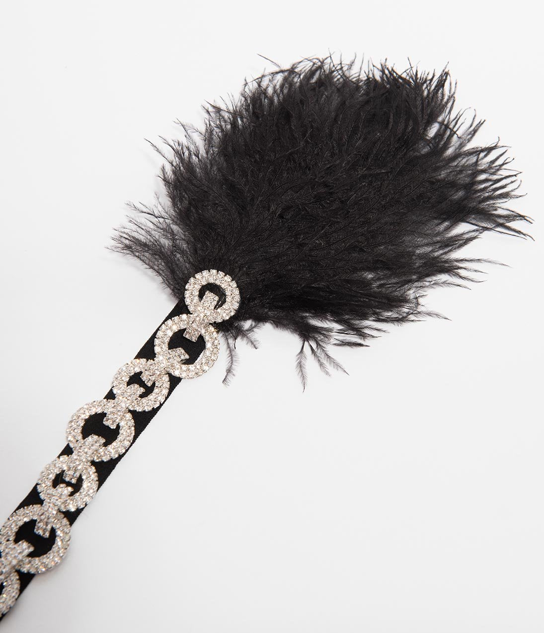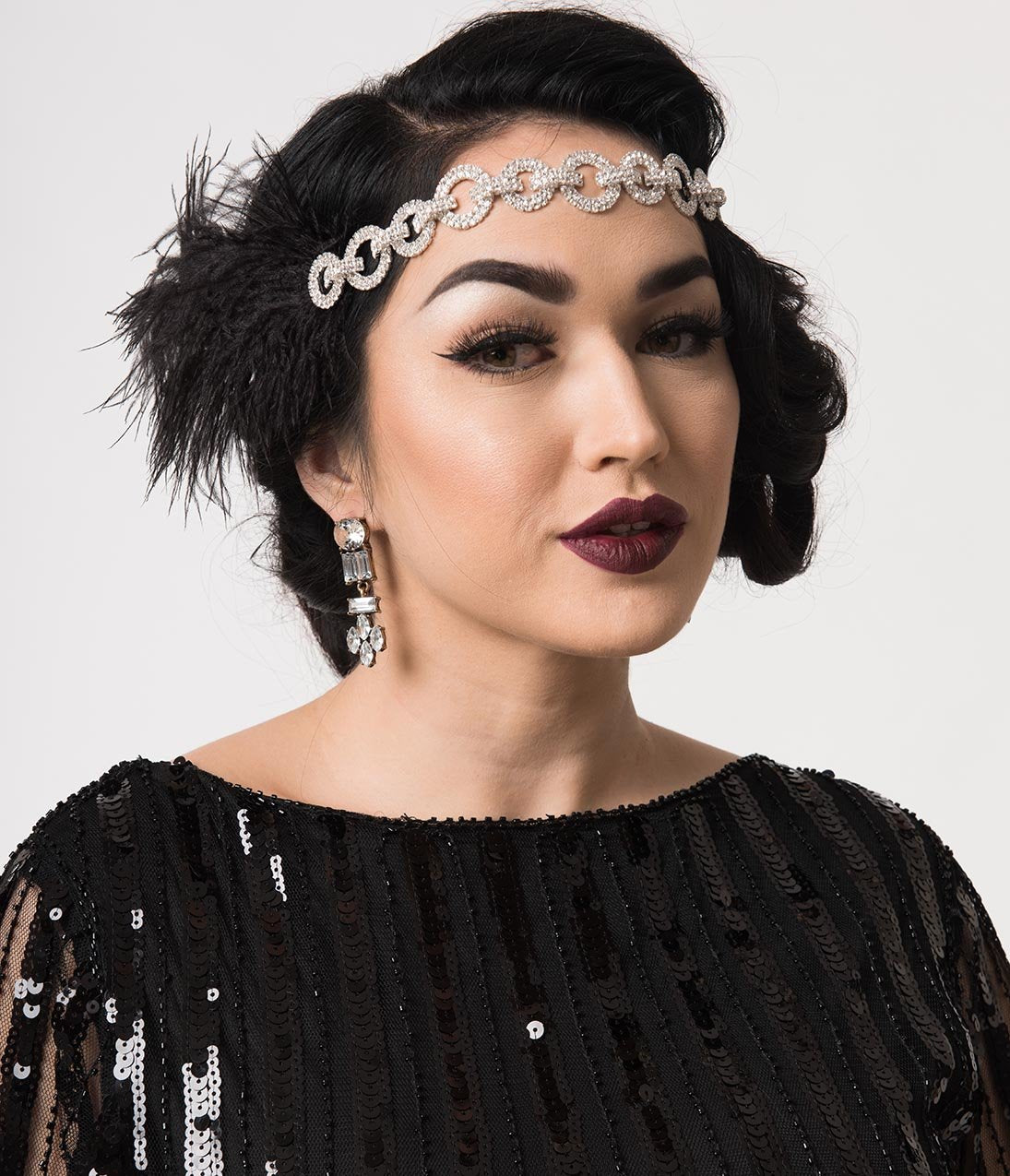 A little sparkle goes a long way! An elegant black elasticized headband secures a twinkling display of silver rhinestones on a flexible metal design in a glamorous geometric deco pattern. A glamorous black plume feather floats beautifully on the side in a fabulous vintage flapper design.