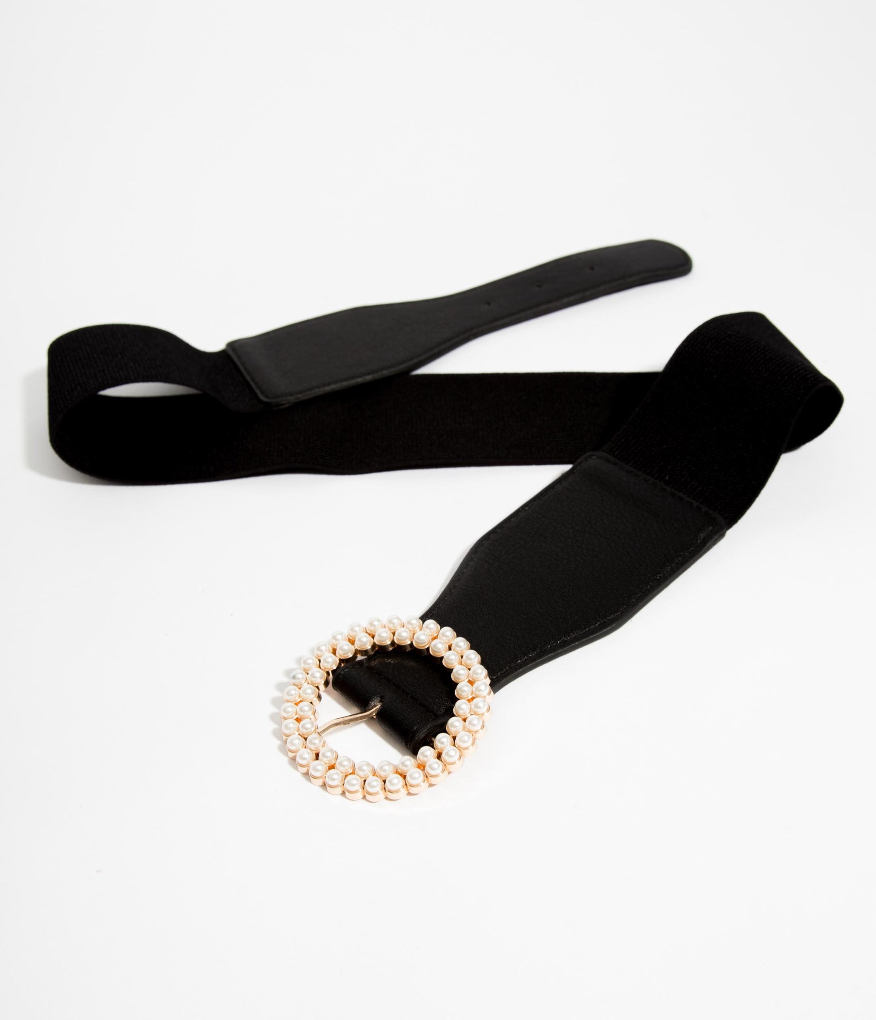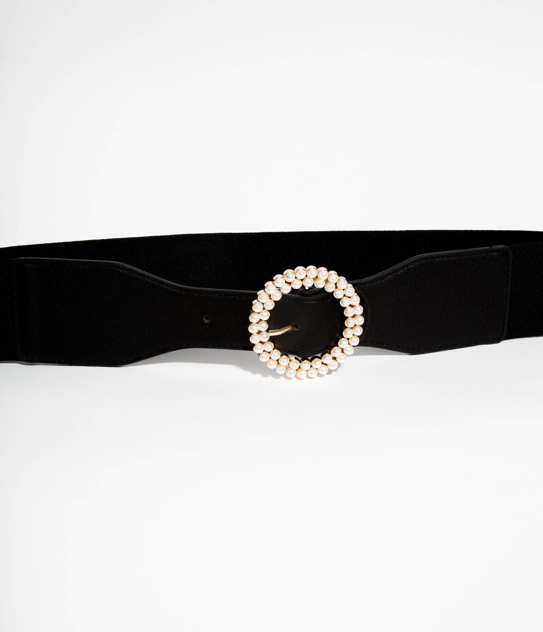 An easy charm for your silhouette! This fabulous black elastic belt features a brilliant faux pearl round buckle, set in golden hardware. Nip in your fatale curves for a jaw-dropping figure!