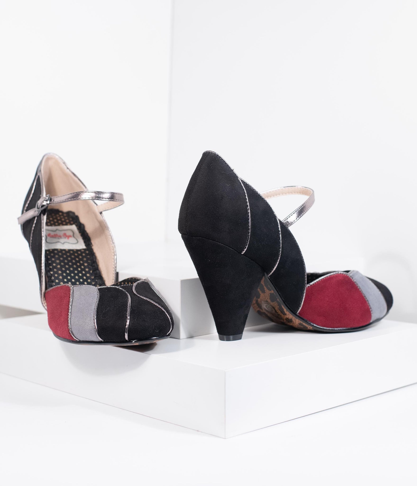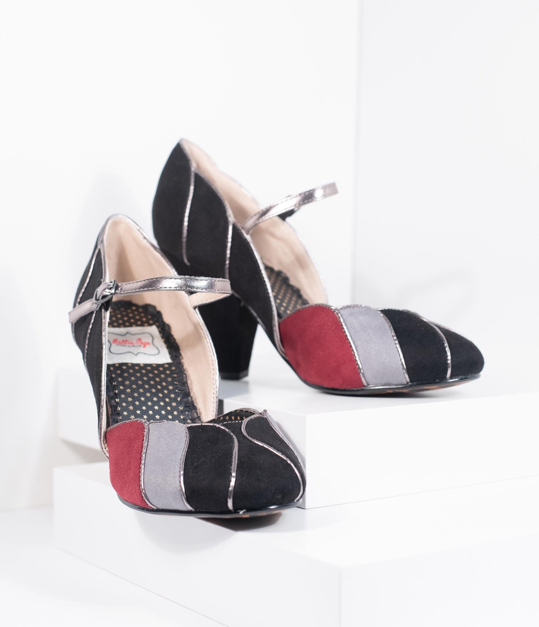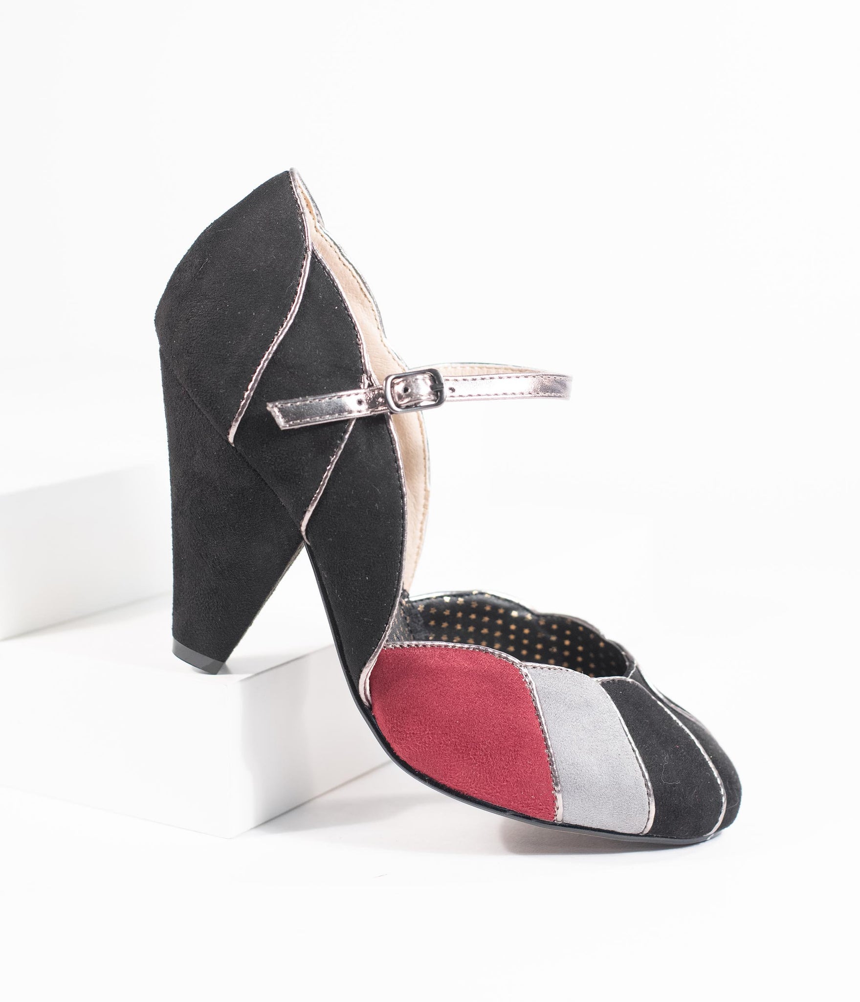 We've found the way to stand out, dames! A set of elegant black pumps from Bettie Page and crafted in a soft faux suede, featuring pops of grey and burgundy colors. The Mary Jane design boasts a scalloped vamp with gleaming piping while the 4” heel provides a stunning lift. The adjustable and gored ankle strap lends a secure fit for a pair of vivacious vintage-inspired stunners!