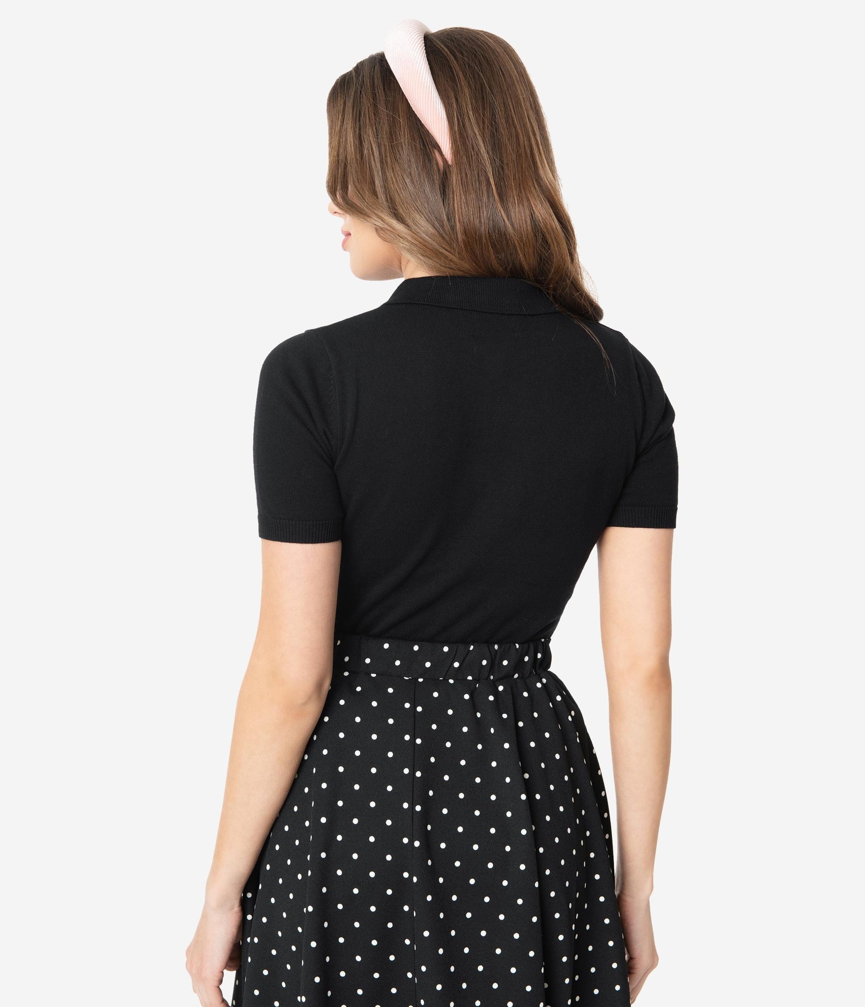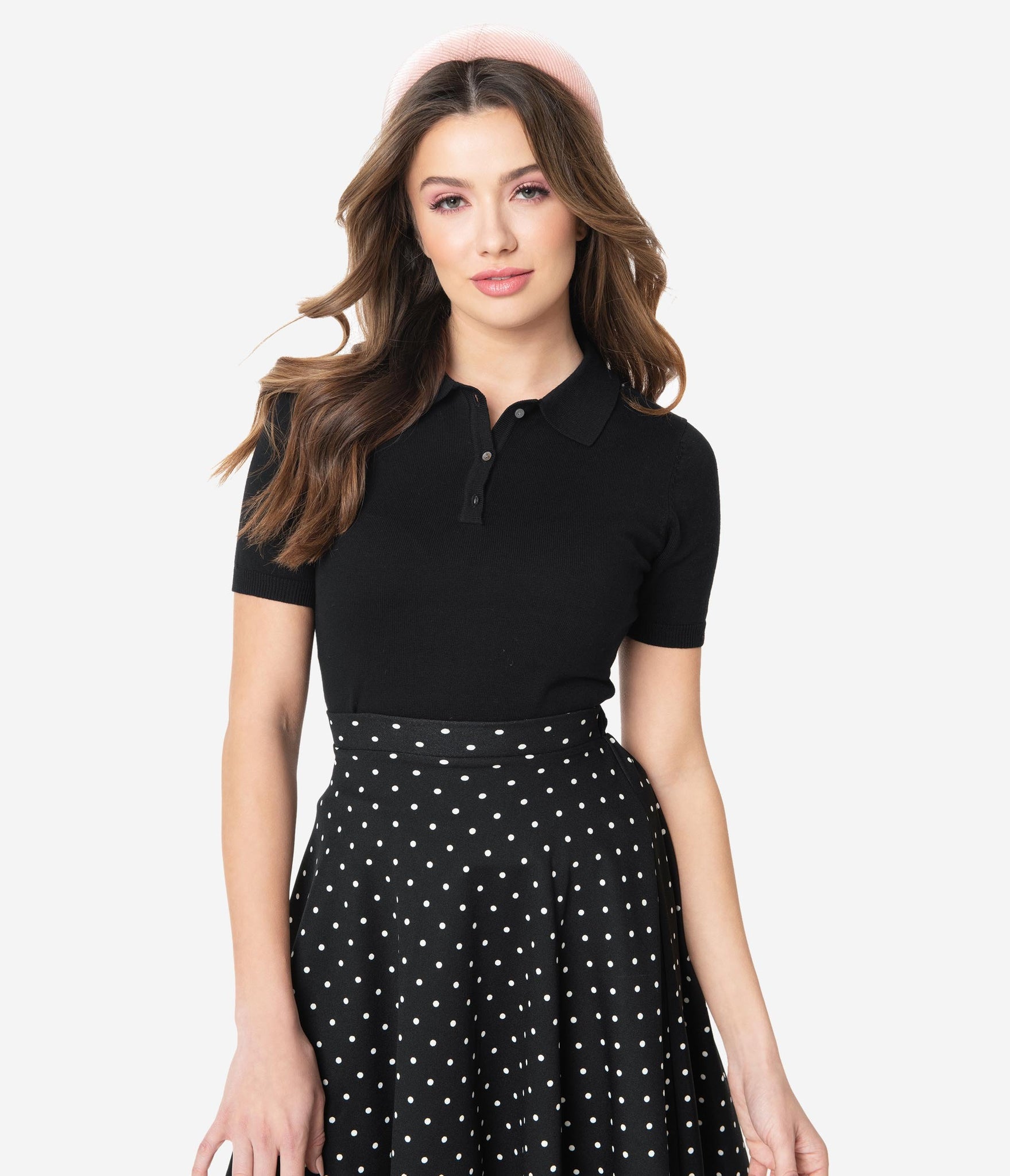 A classic polo look! This knit top is cast in a bold black and imitates a classic polo shirt. Three buttons lead to the collar, while banded cuffs and waist add the retro style to this classic top. A stretchy cotton knit allows you to feel comfortable and look classic!