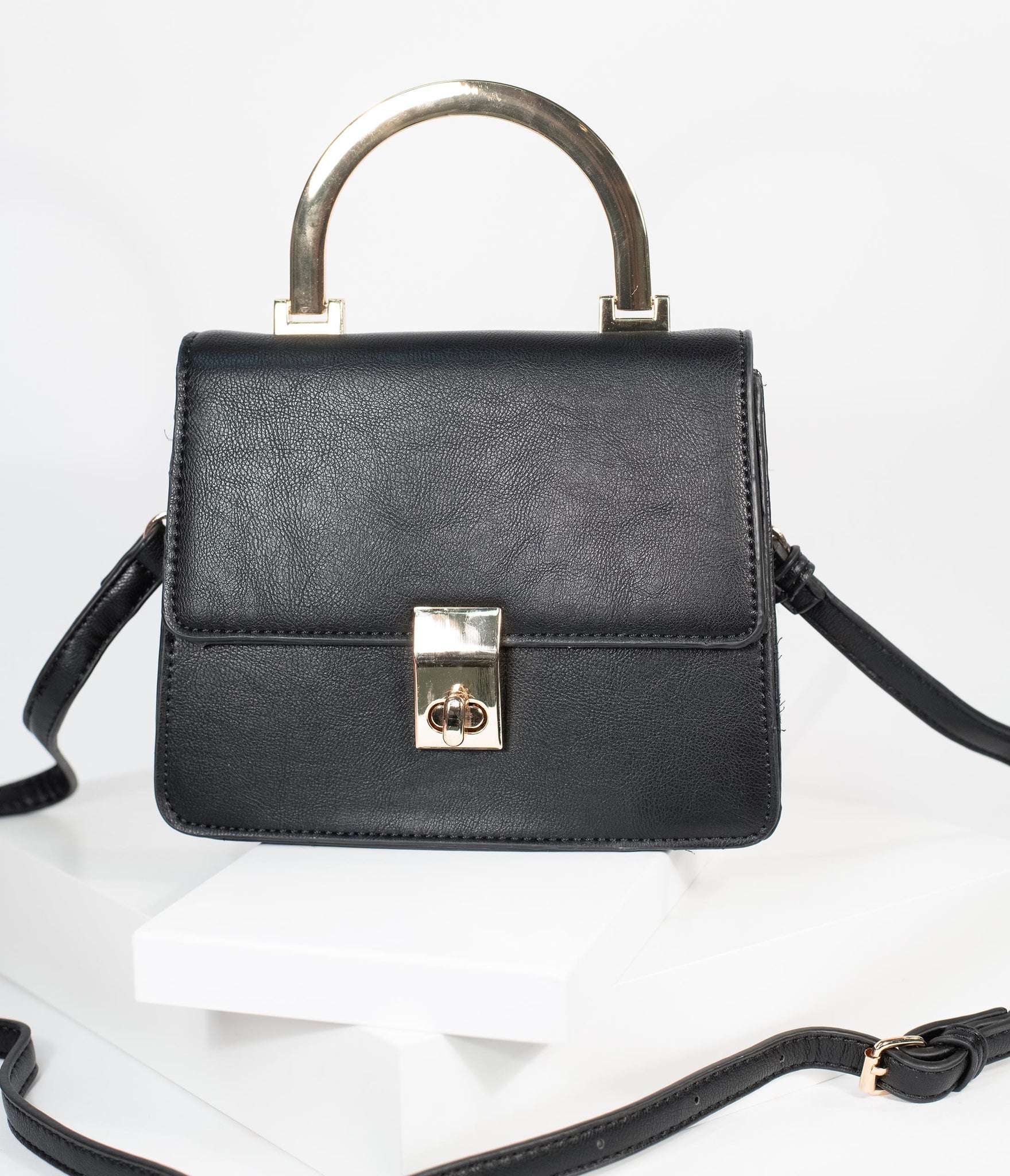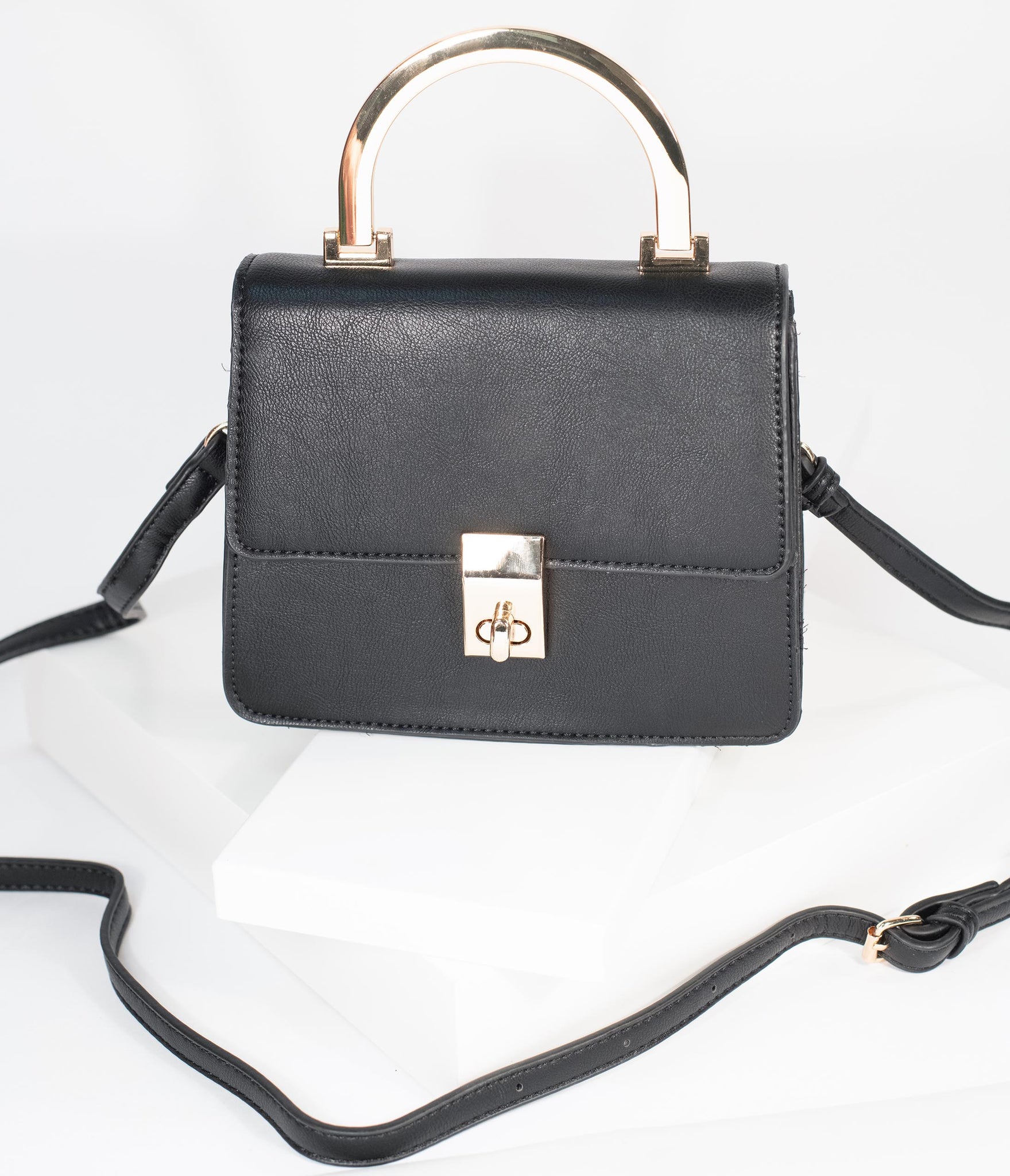 Leave them in the dust, dears! A chic and classy purse for a leading dame, this black leatherette accessory boasts golden hardware in a curved top handle and a turn lock not he front of the fold over style. An adjustable and removable shoulder strap allows for versatile wear while the fabric interior leaves room for our essentials!