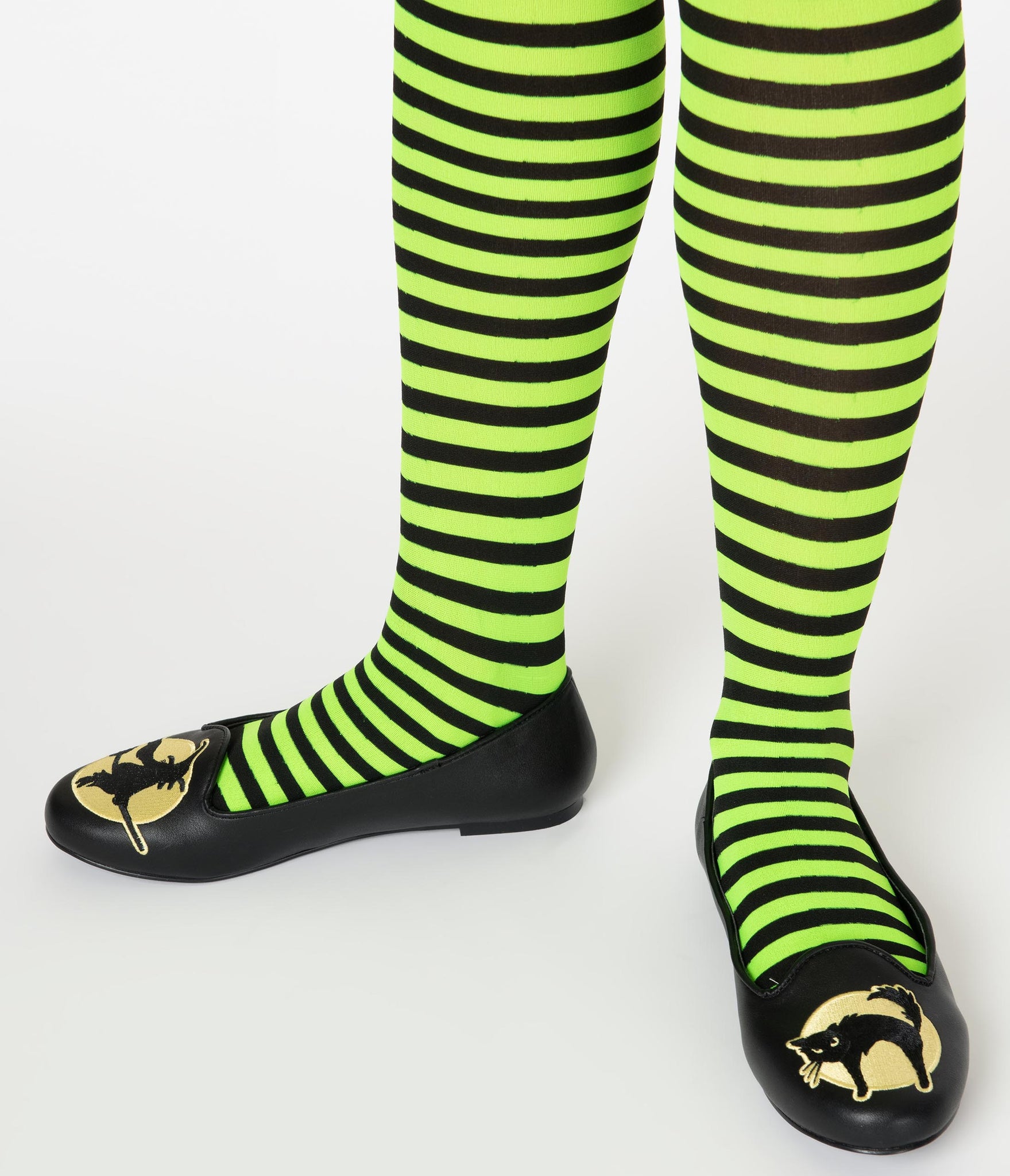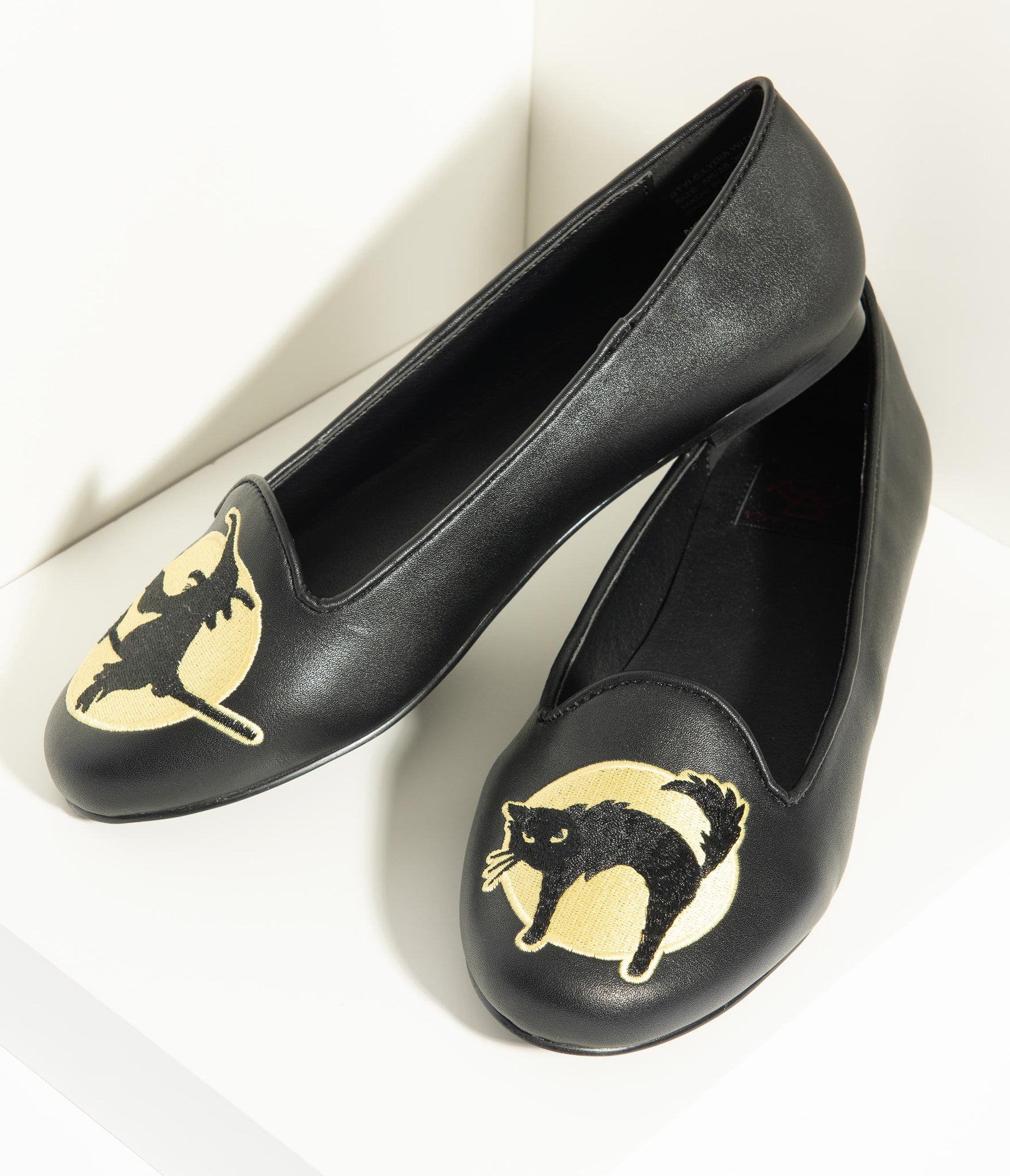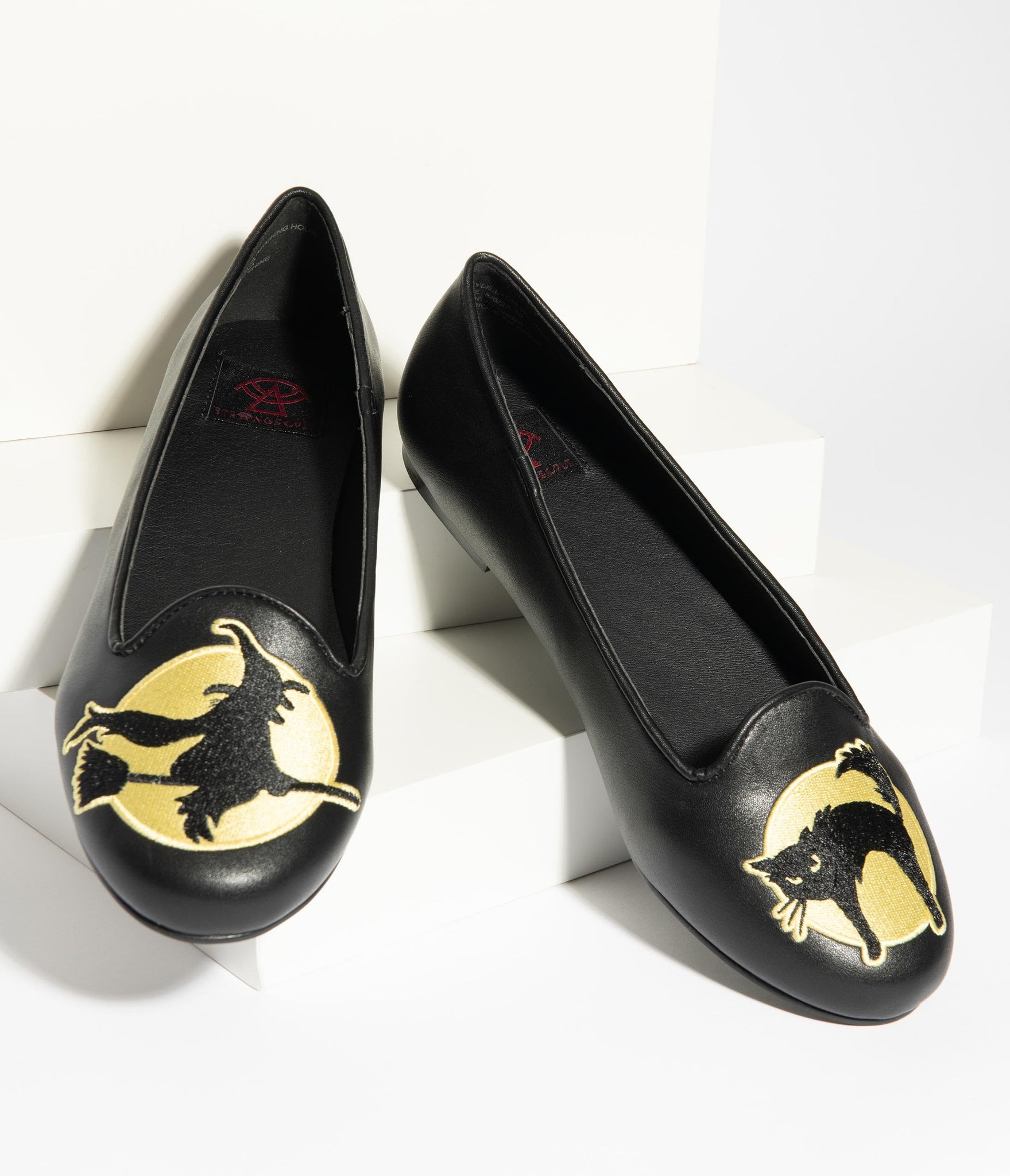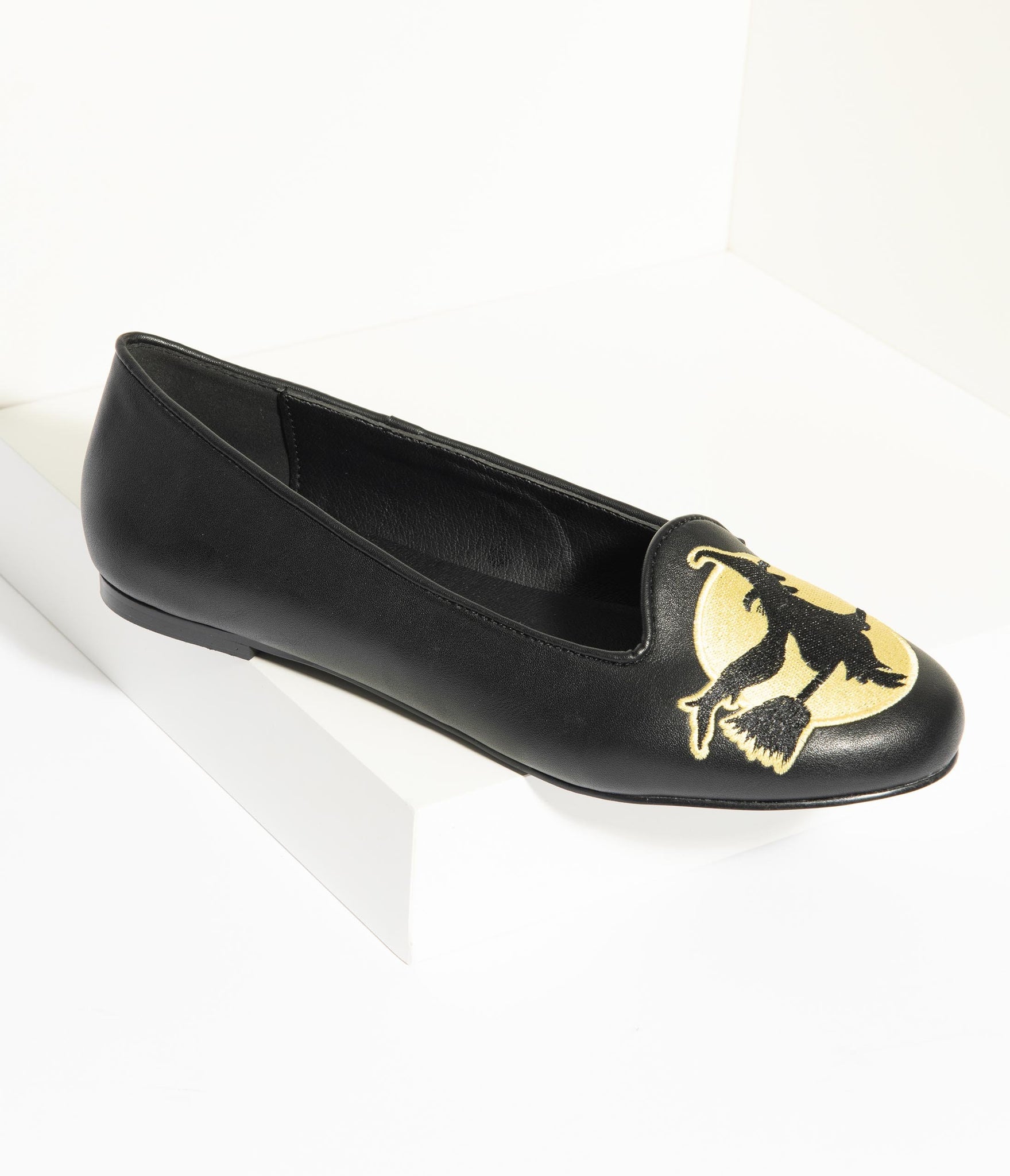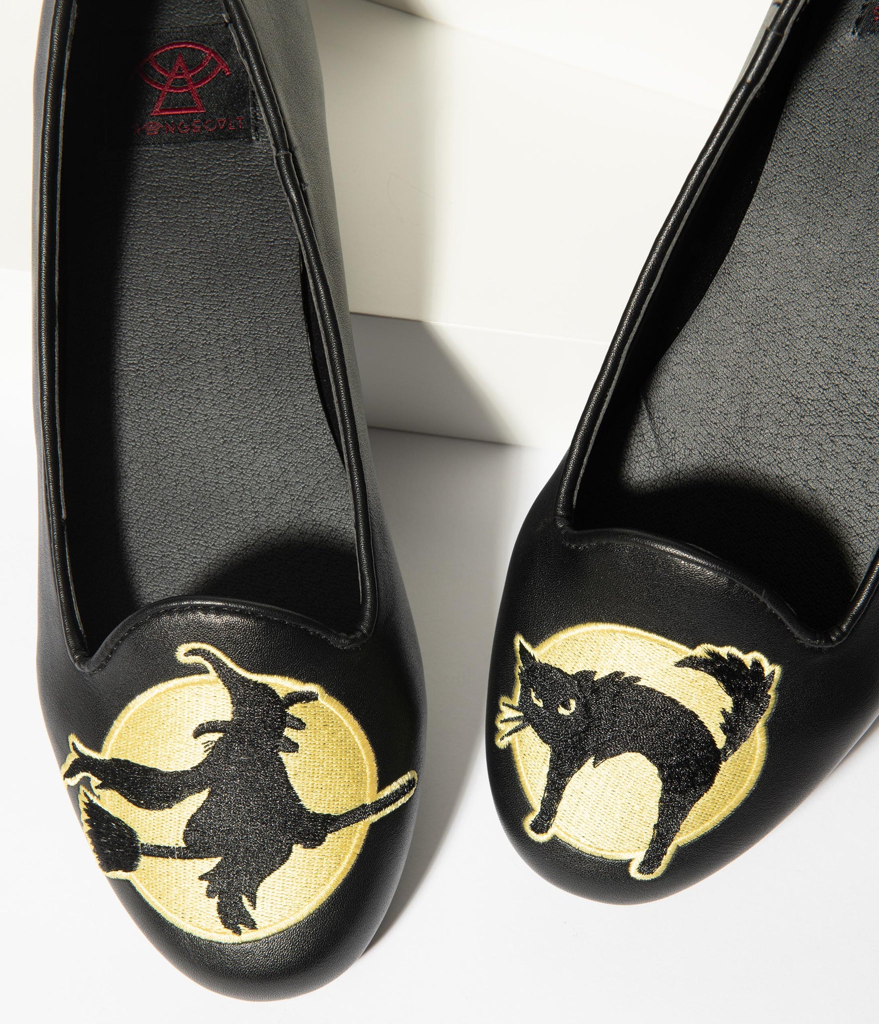 Grab your hat and broom! This frightening pair are crafted in a soft black leatherette that features thrilling patches on the vamp with a black cat and moonlit witch. Complete with a cushion insole!
