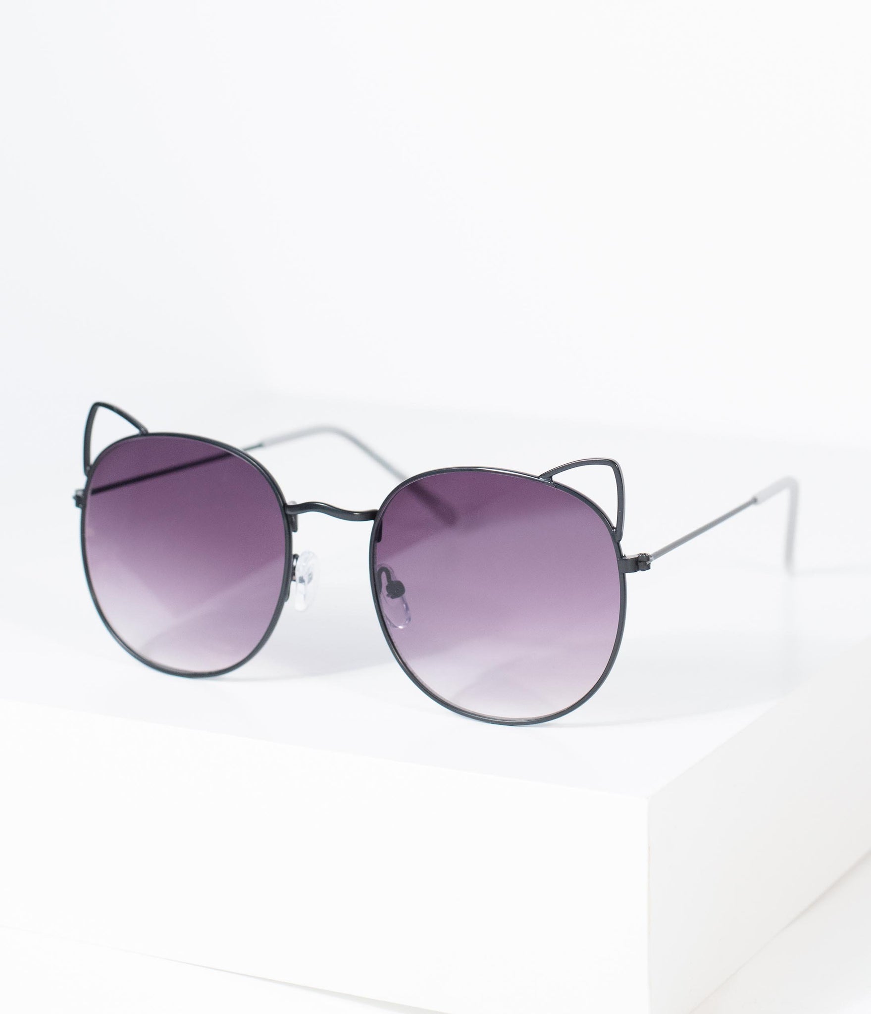 We’re all ears! These cute sunglasses are set in a black metal frame, boasting adorable cat ears atop the purple tinted, rounded lens. Outfitted with silicone nose pads and curved arm for a comfortable fit.