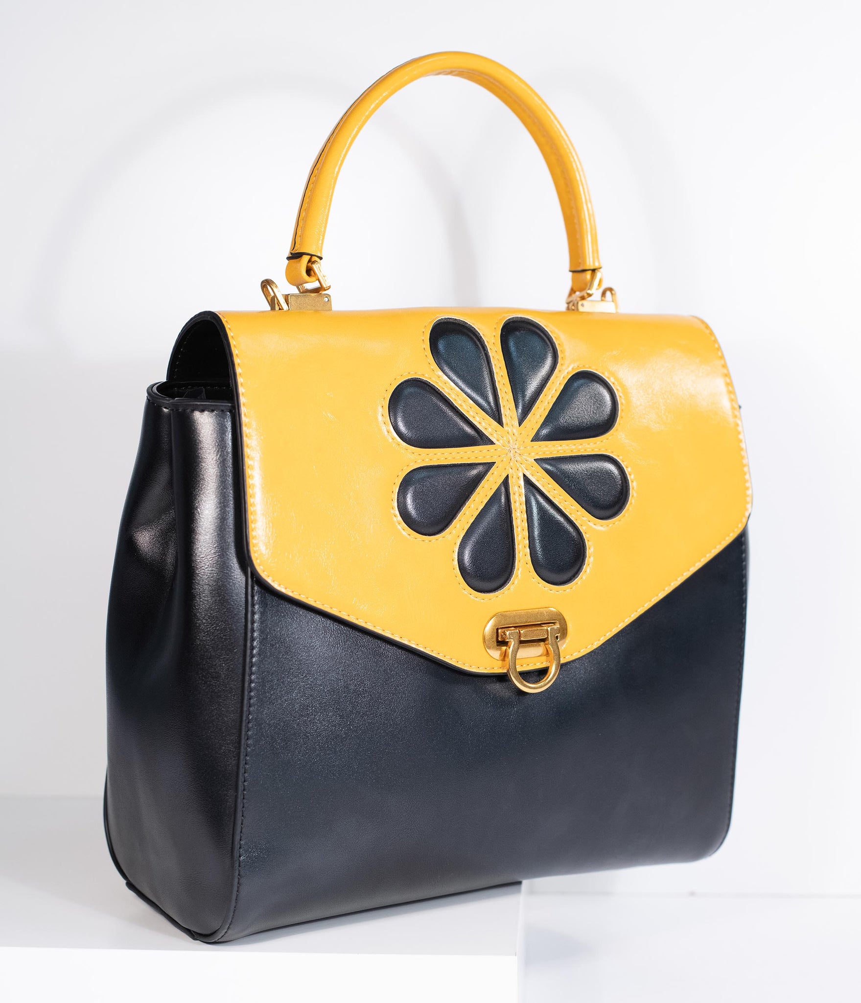 To beautiful and beyond, darling! Cast in a black and mustard yellow leatherette with fabric lining, the Waterlily purse features a mustard yellow fold over that’s secured with a burnished golden fold over lock and embellished with a lovely floral accent. The top handle and removable/adjustable shoulder strap allows for versatile carry as the outer zipper pocket keeps your favorite pieces close at hand. The polka dot interior boasts two inner slip pockets and an inner zipper pocket to take any ensemble to elegant and practical. It's a retro must have!