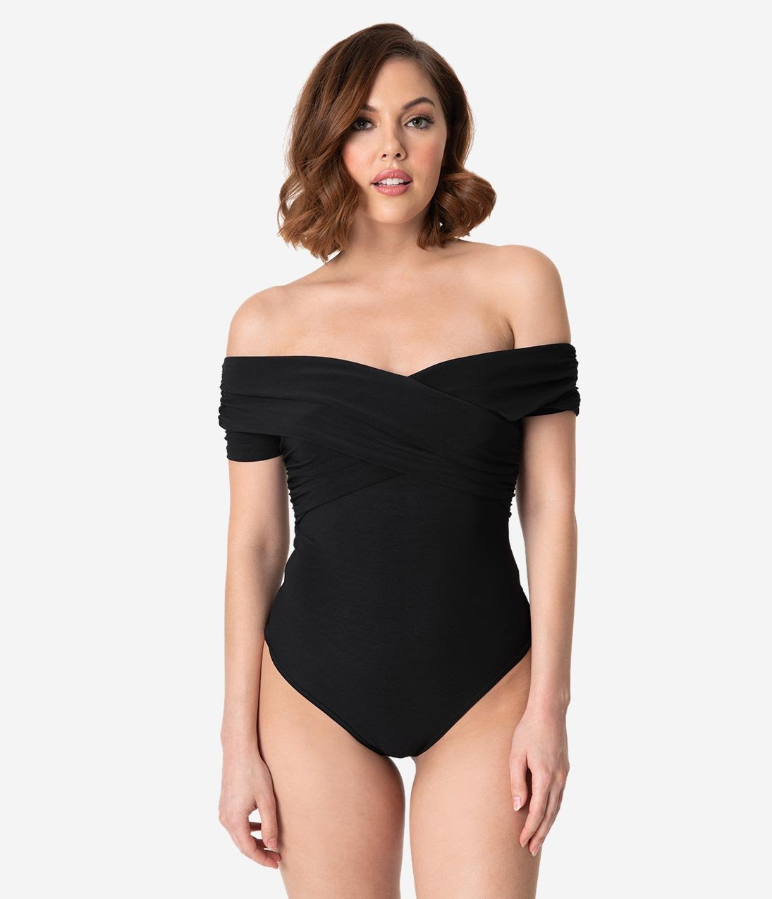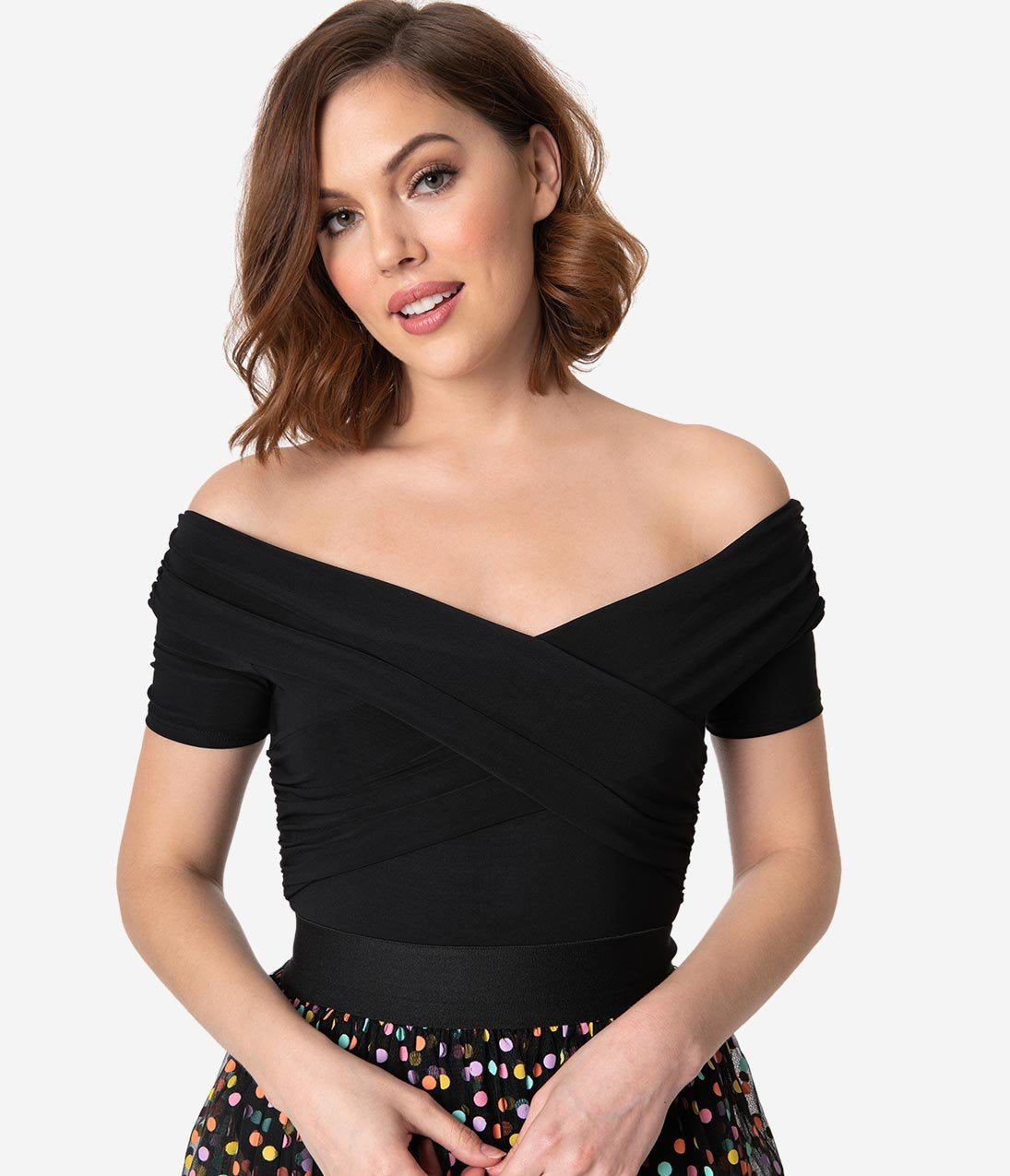Are you ready for a little allure, darling? This superbly structured black bodysuit is crafted from a soft stretch knit fabric. The gorgeous retro style boasts a gorgeous off-shoulder surplice neckline, which is framed by sweet short sleeves and subtle gathers along the bust. This striking black off-the-shoulder bodysuit drops into a double snap button closure for a slimming silhouette. Step in this stirring vintage bodysuit and prepare for praise!