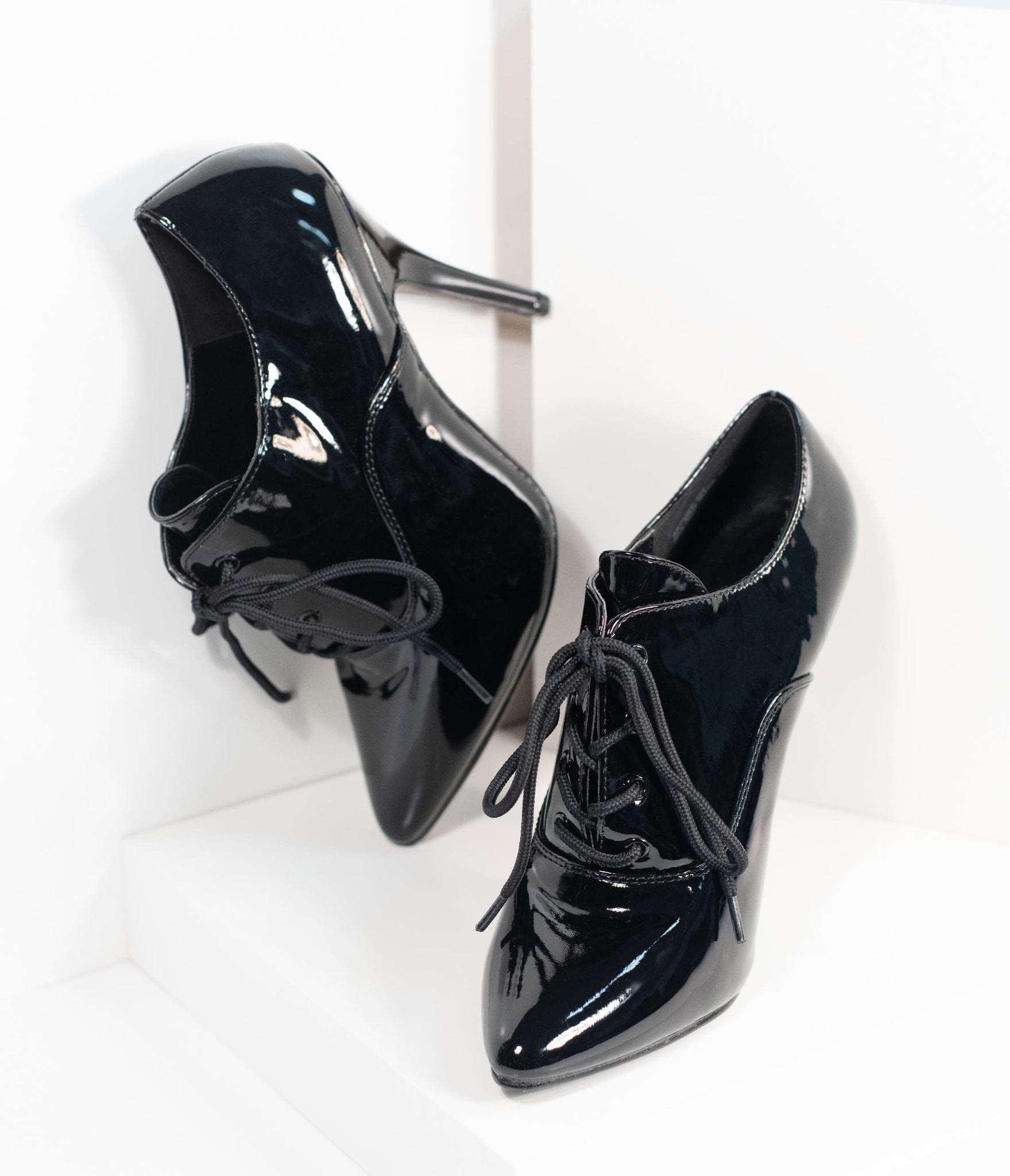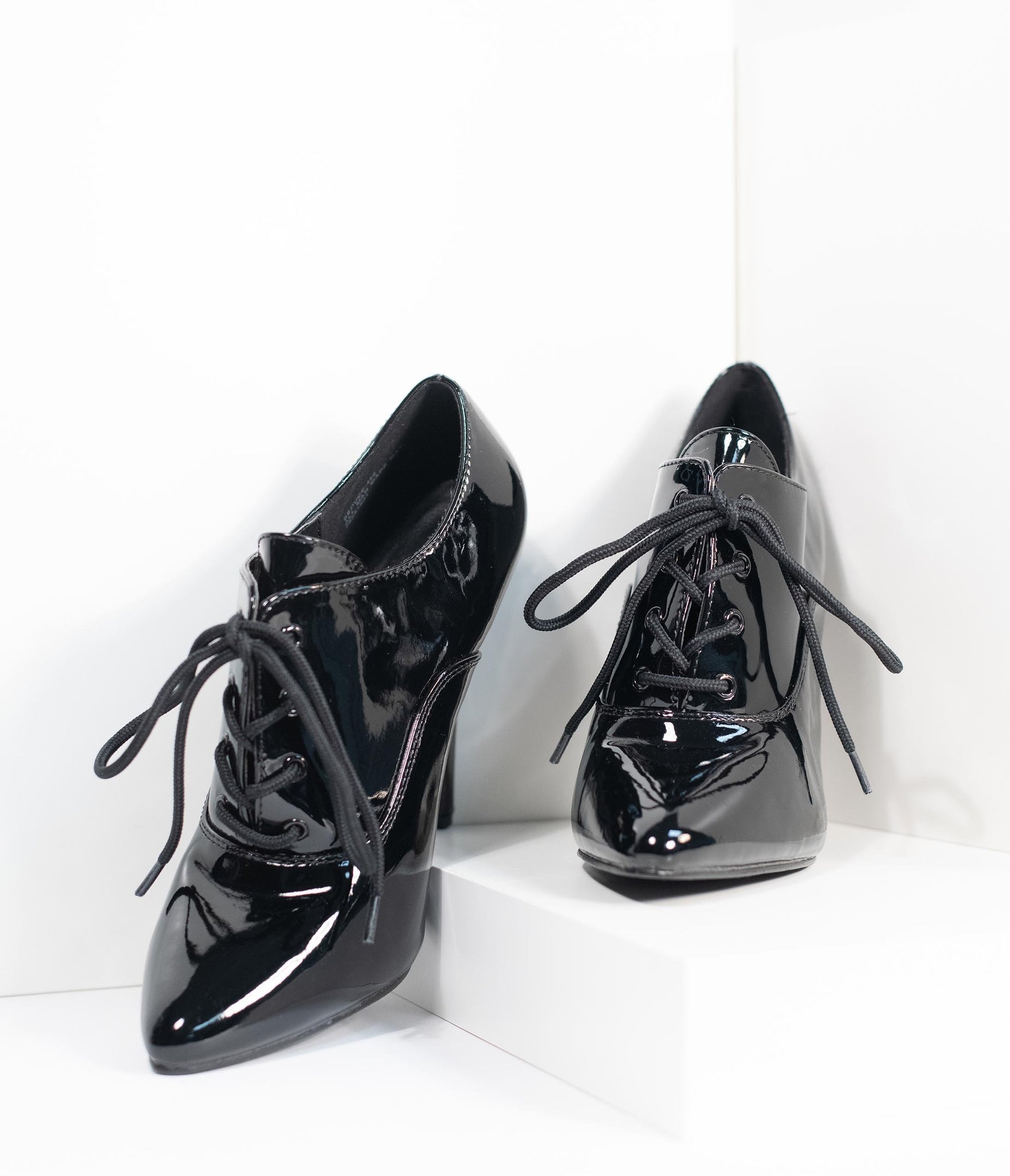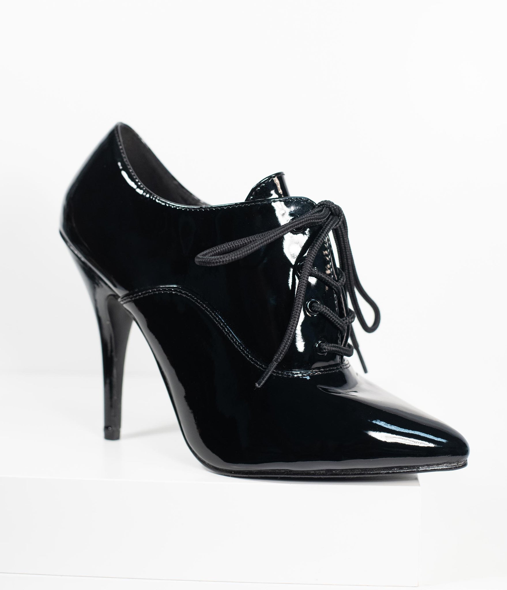 Put a spell on them, gals! These pin-up perfect pair of pumps feature a bewitching 5 inch stiletto lift, crafted in a marvelous black patent leatherette. Oxford detail and a classic lace up front keep you coming back to these retro shoes, complete with minimal tread and a cushion insole for an alluring style.