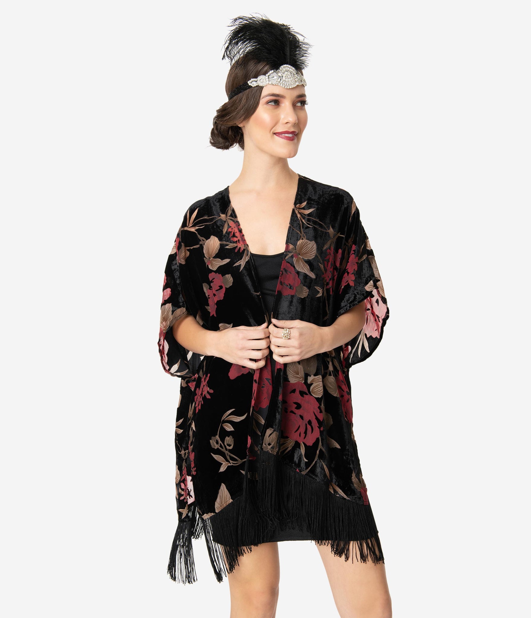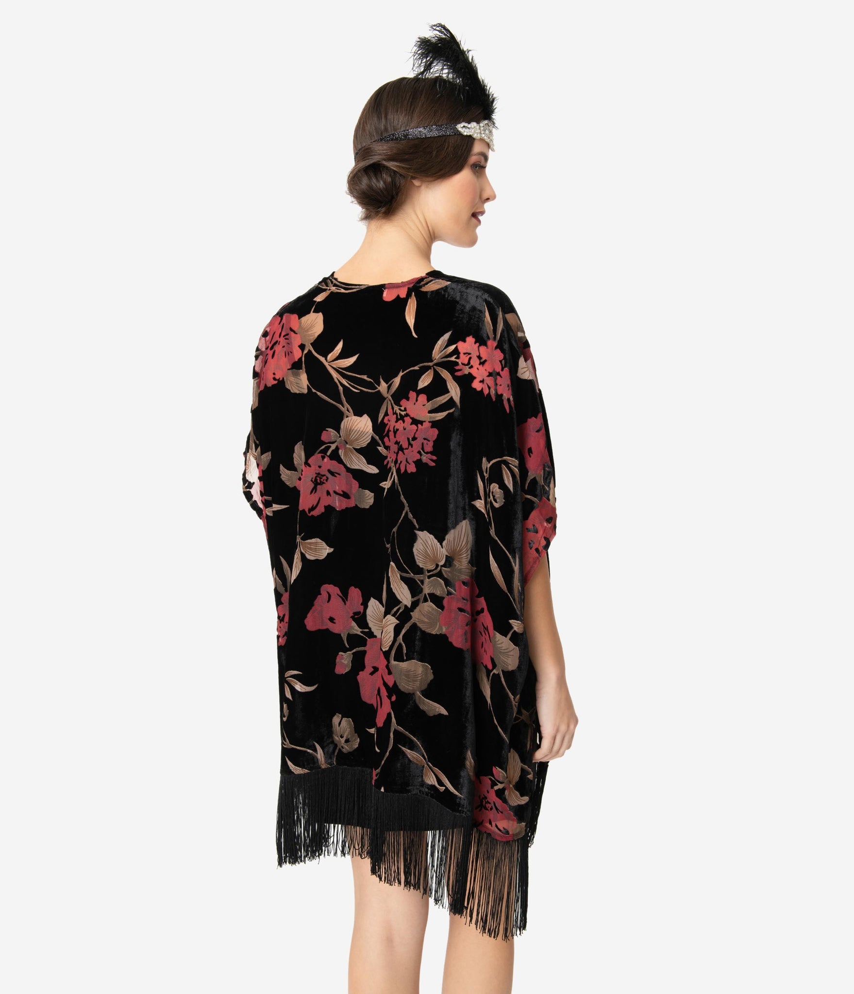 Show some deco divinity, darling! This fabulous vintage inspired robe features a beautiful open silhouette and fringe hemline for a delightful 1920s style. The black Devore velvet boasts a lovely red floral design while the dolman sleeves keep you comfortable. It's velvet va-va-voom!