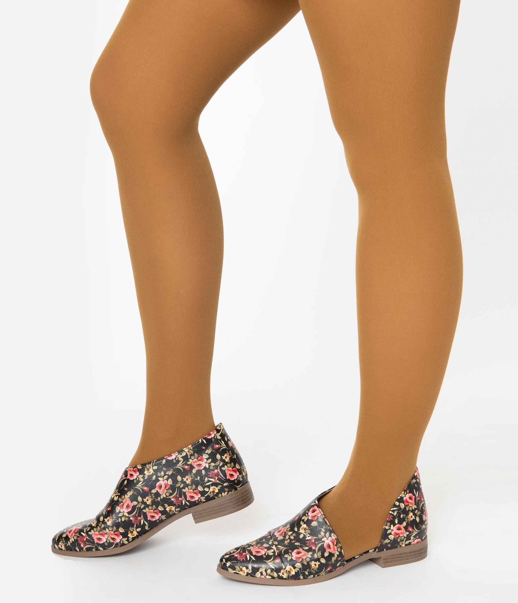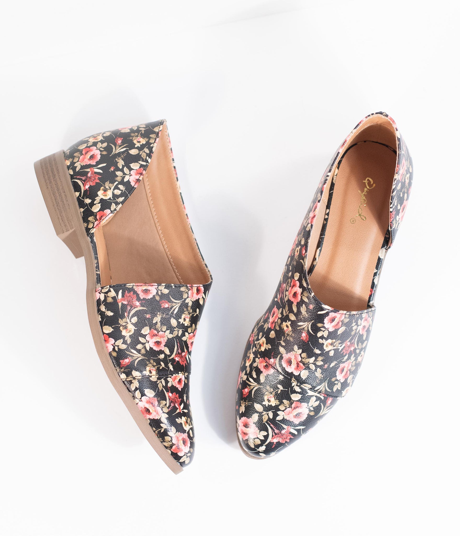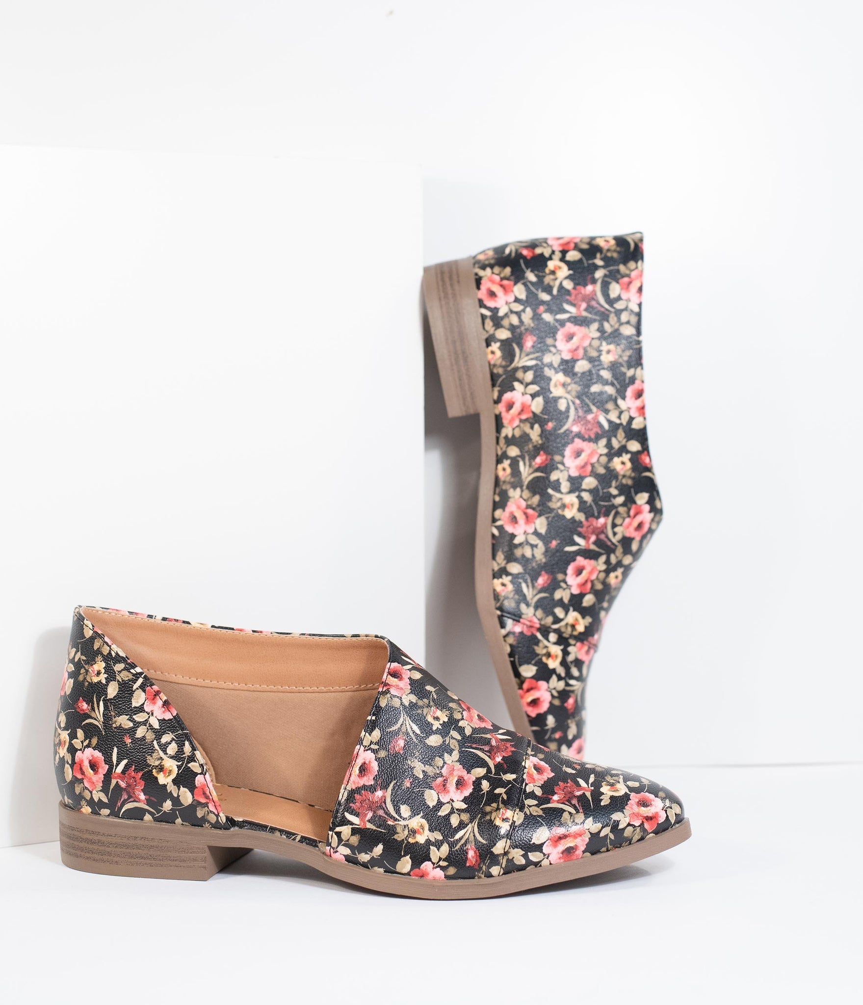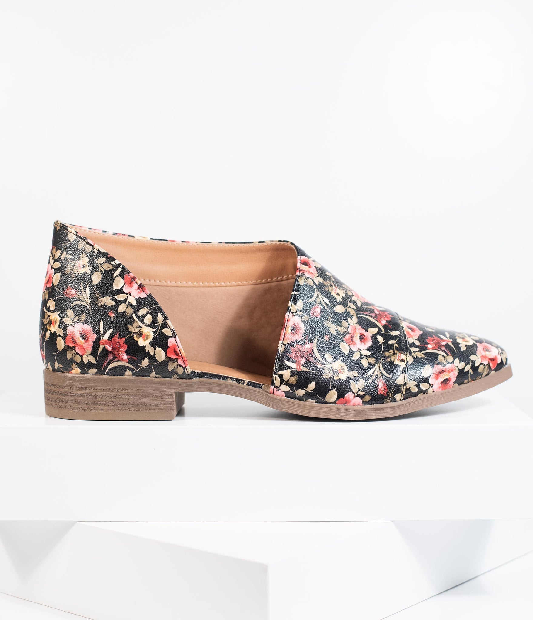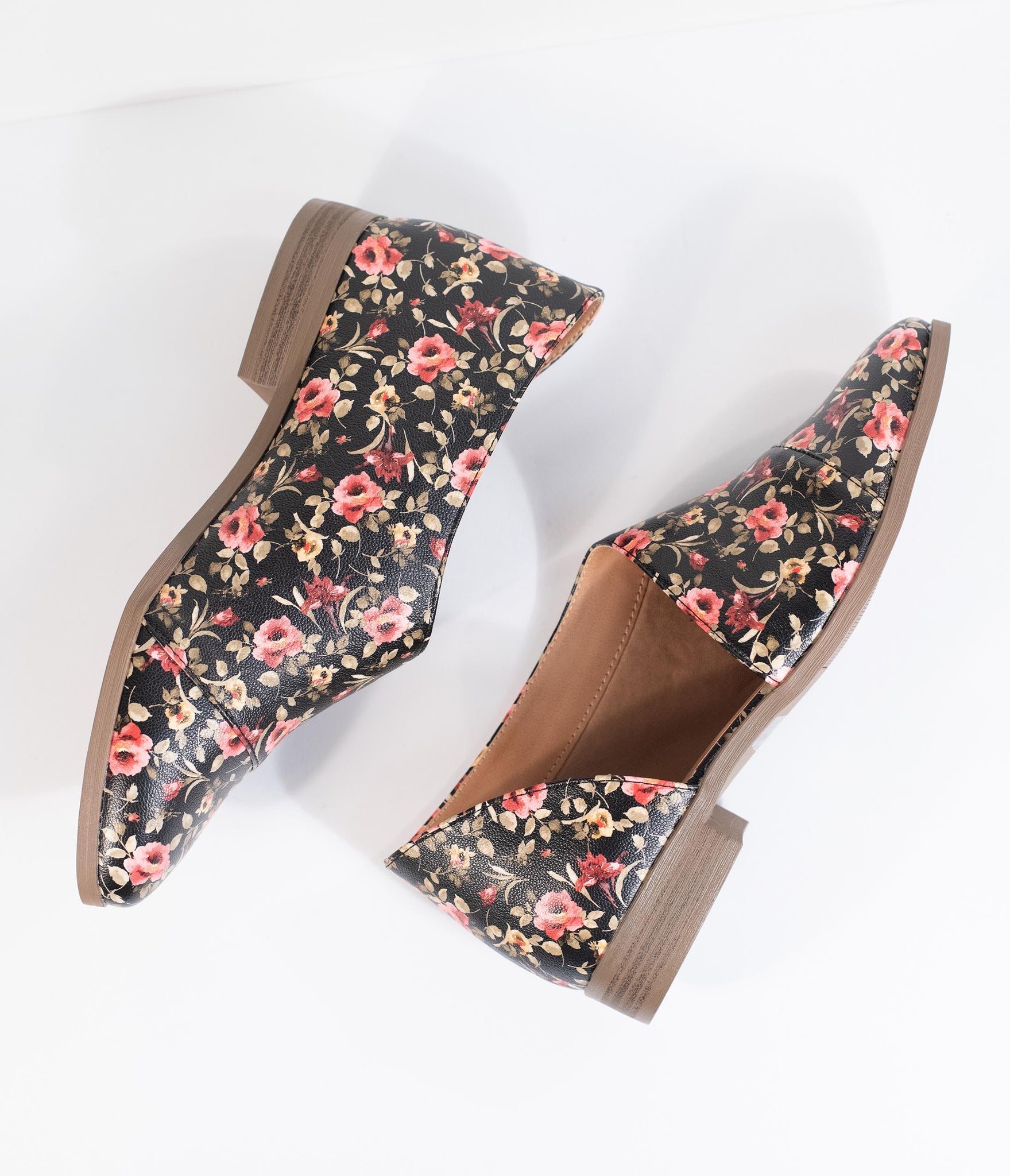 Bold and dashing, dames! A fabulous pair of leatherette flats, perfect for taking your fondness for dapper to the next level with red florals cascading through the black background. Outfitted with a 1 inch heel, these classy kicks are complete with outer opening for easy slip on convenience. We hope you don't mind attention, darling.