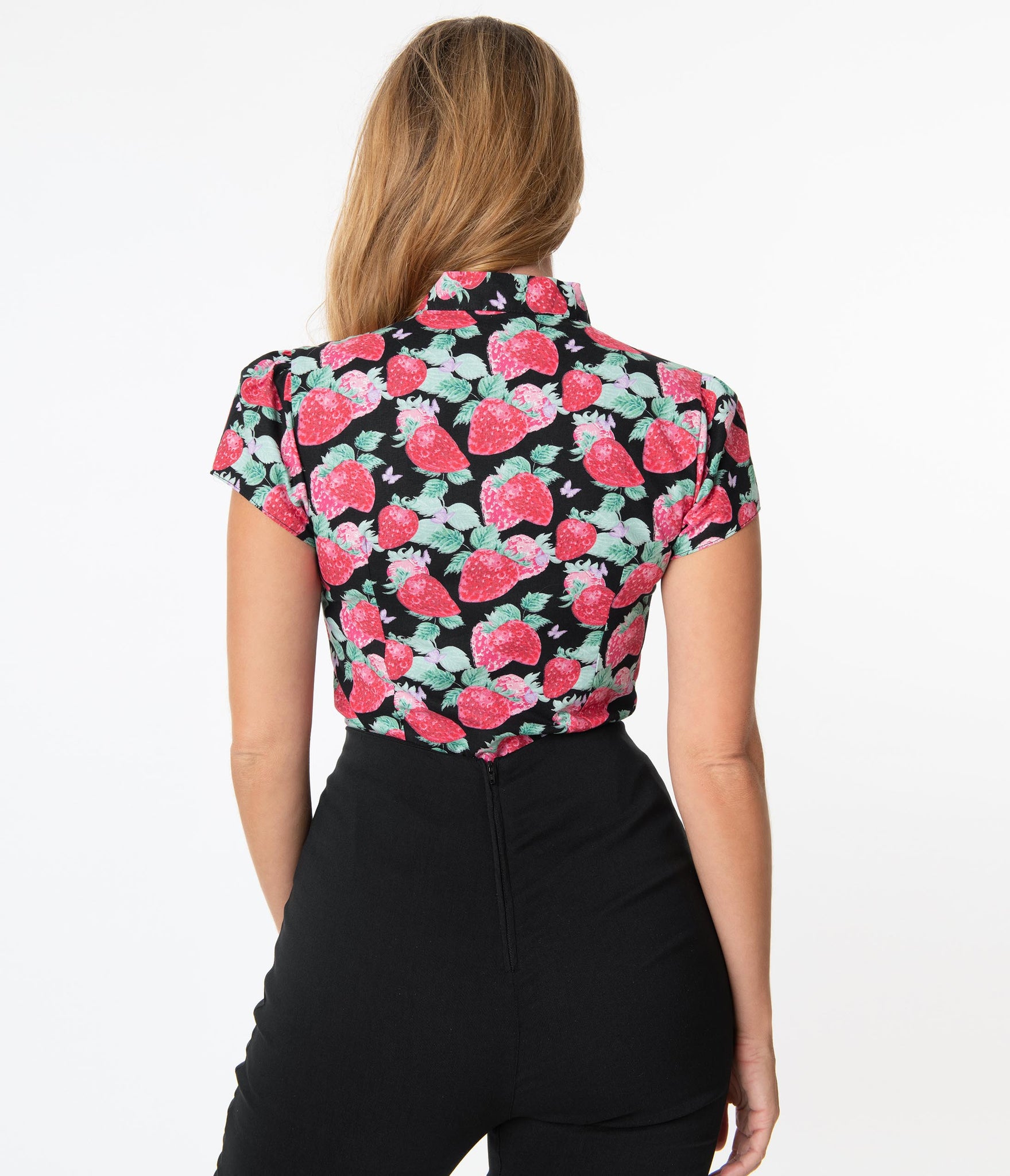 Get your bow on, dolls! This sweet blouse is crafted in marvelous cotton and features a retro print of red strawberries cascading through a black background. The button up front leads to an attached self tie bow for add feminine grace while the sweet short sleeves, darted waist, and gathered shoulder yoke brings the cute!