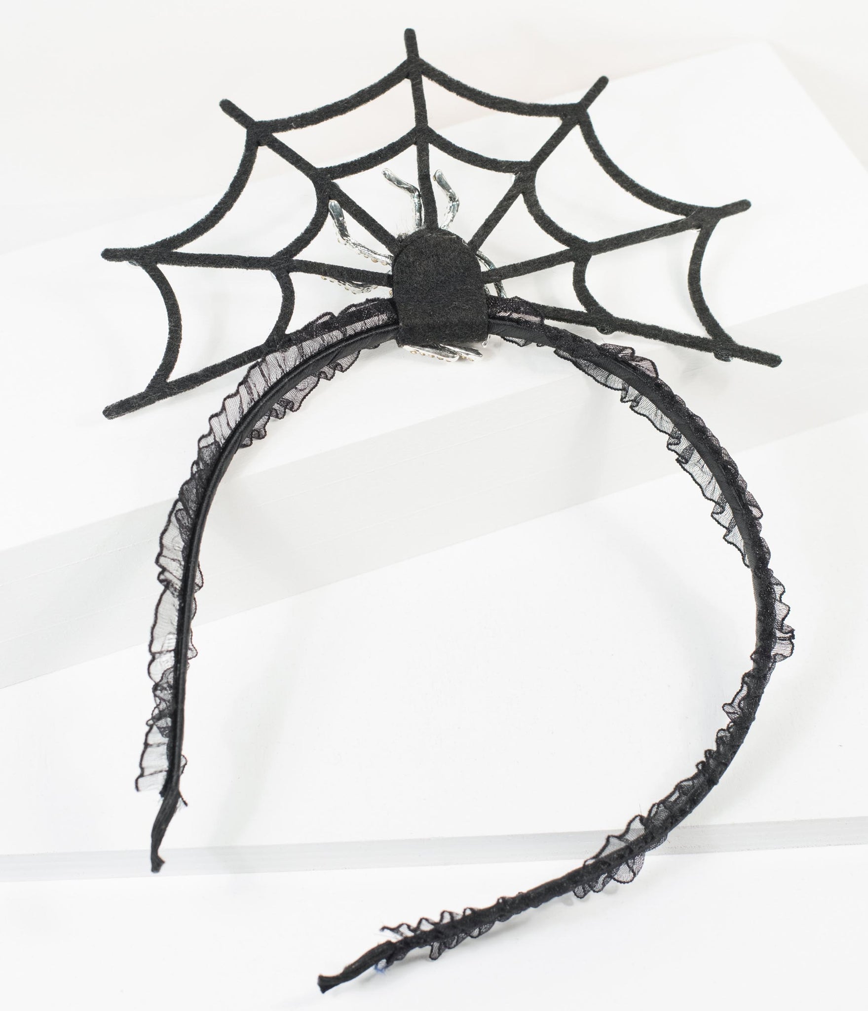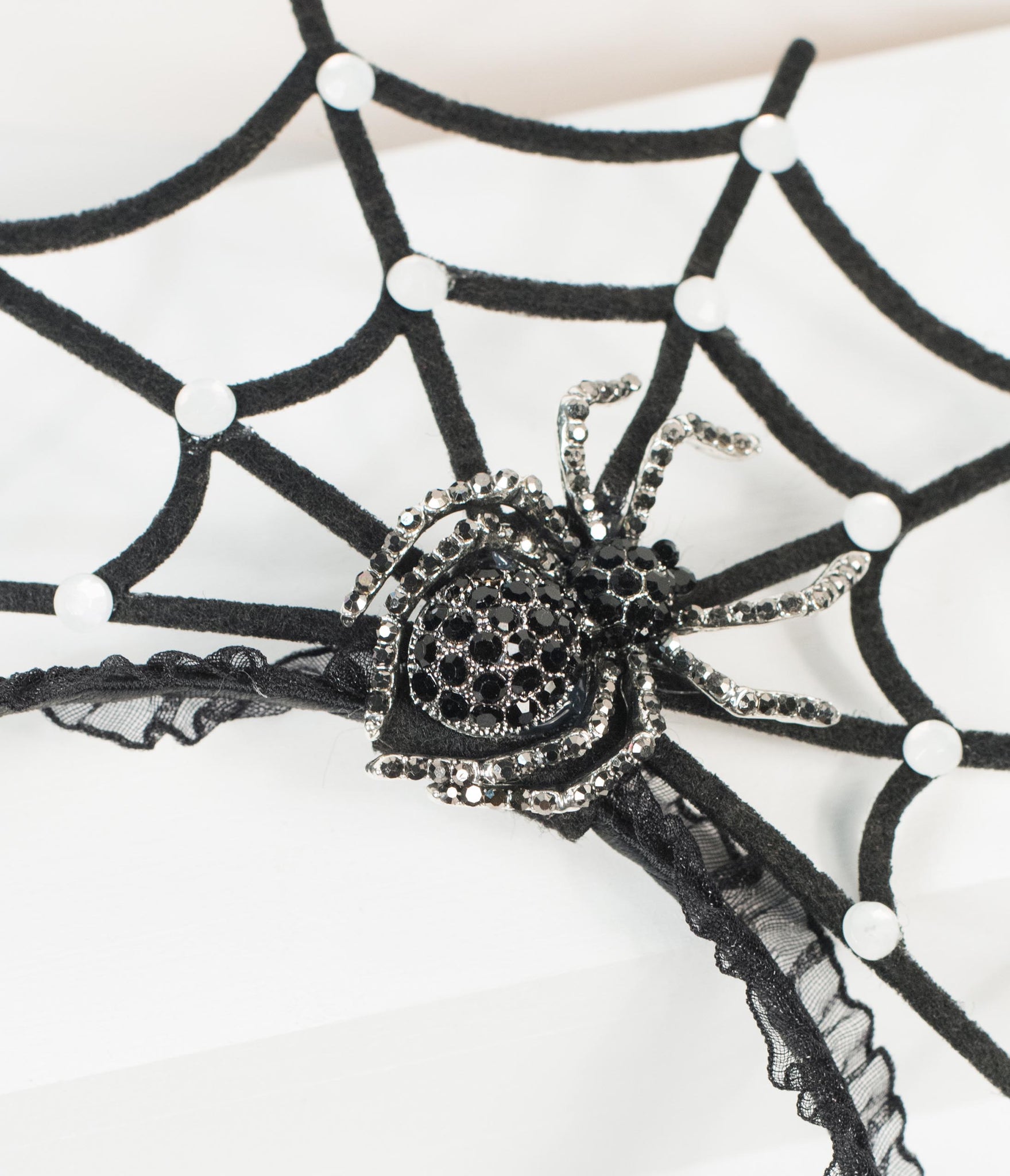 For the Spider Queen! This fabulous black headband is a thrilling feature for your bewitching ensemble. The flexible headband features ruffled sheer mesh while the beautiful web is cast in sturdy black felt and shimmers with pearlescent stones. A deadly black spider creeps along in sparkling black rhinestones!