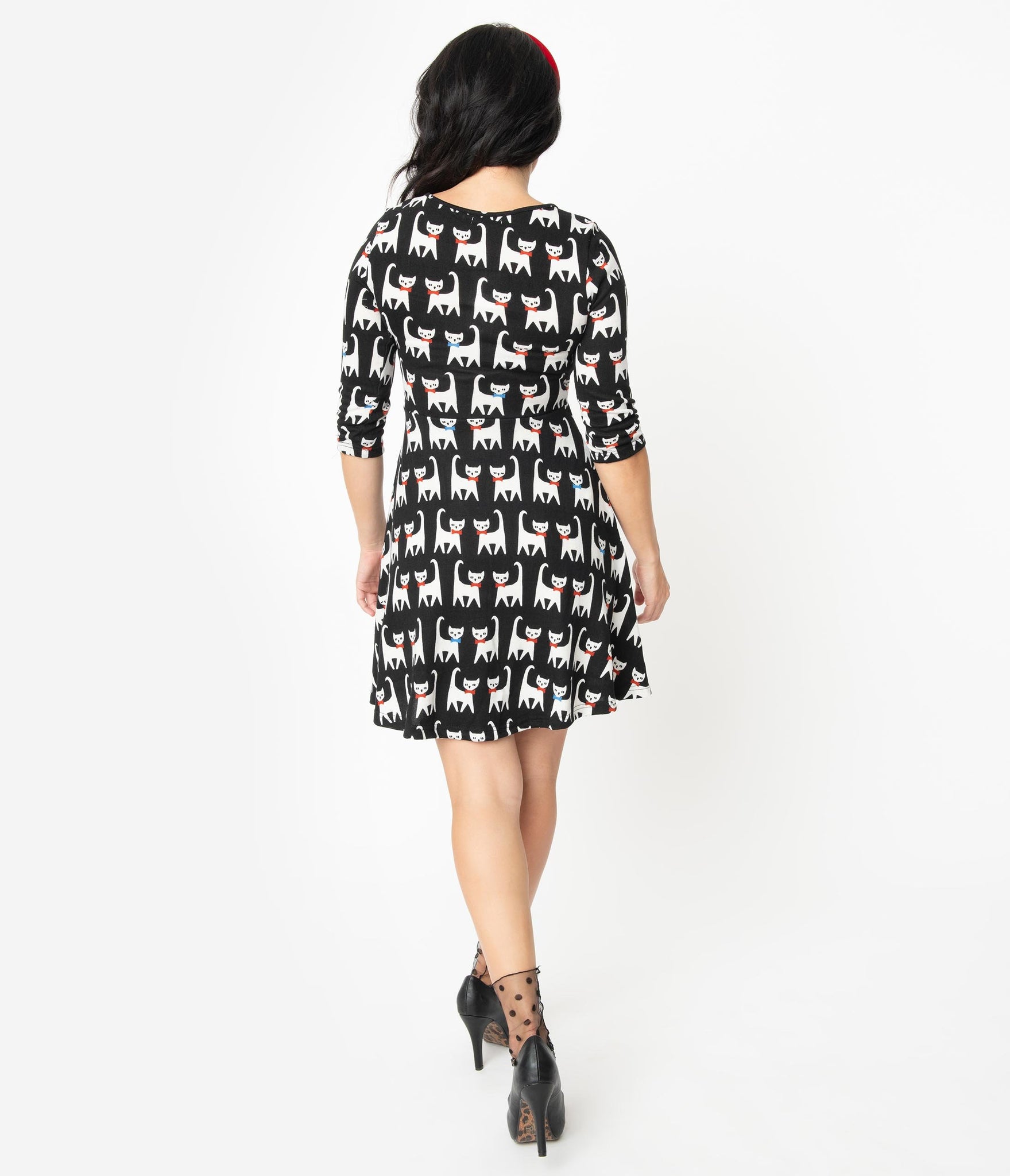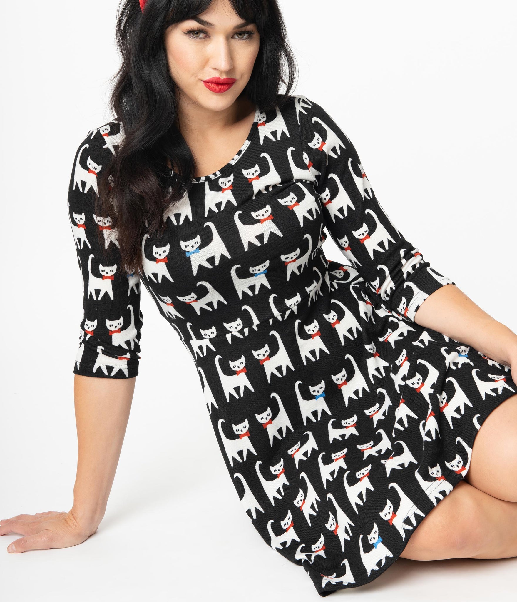 What a clever cat-ch, gals! A purrfectly delightful retro sweater dress, this lovable piece is crafted in a soft knit blend with a lovely print of white cats with colorful bows on a black background. Designed with a modest scoop neckline and framed by slim three-quarter length sleeves, this casual silhouette features a seamed waist and a flirtatious skater skirt, outfitted with side pockets for modern function. Paw-sitively delightful!