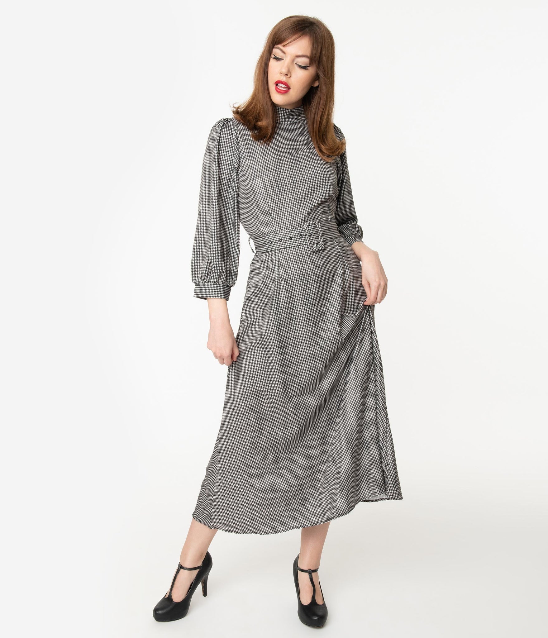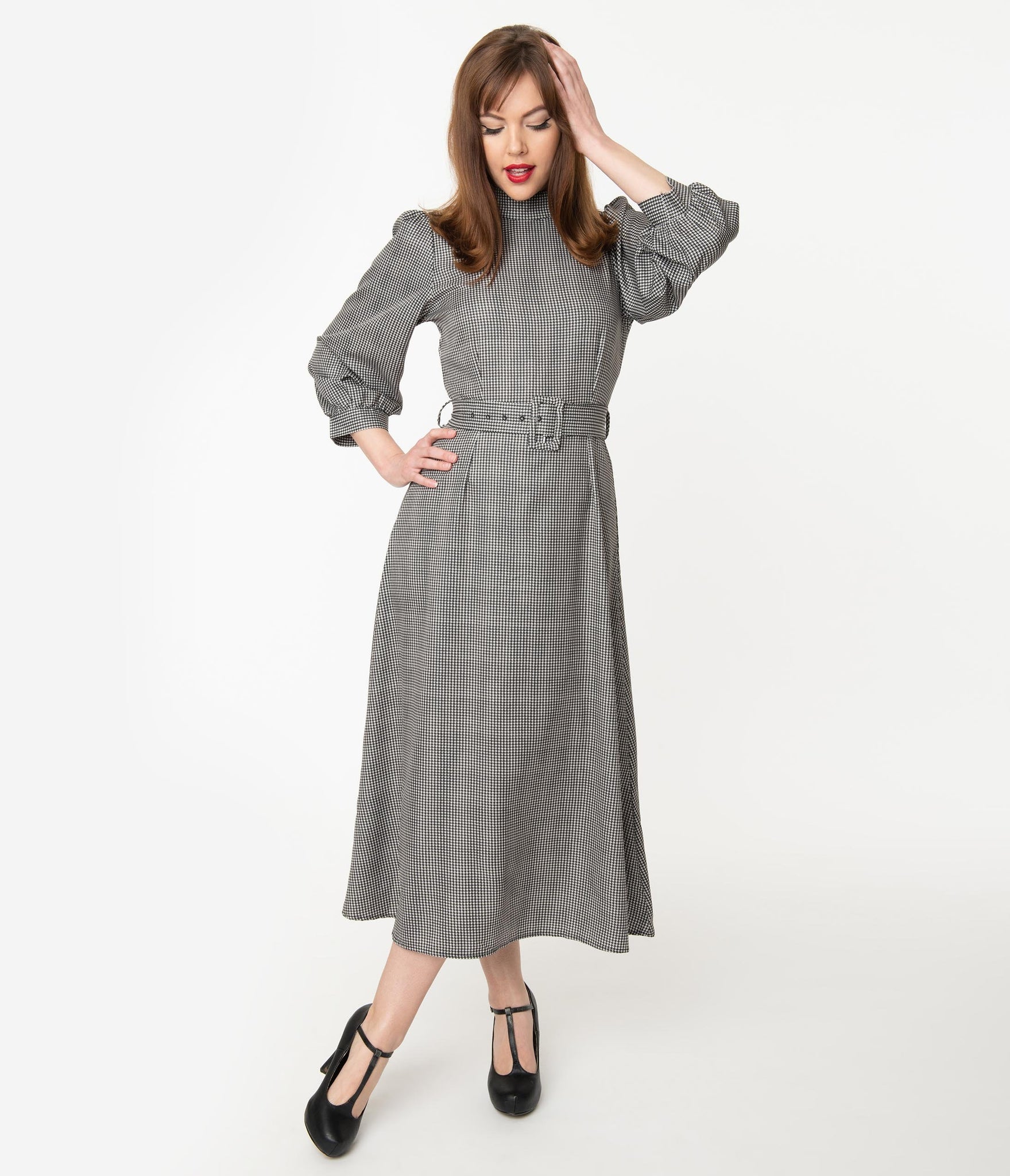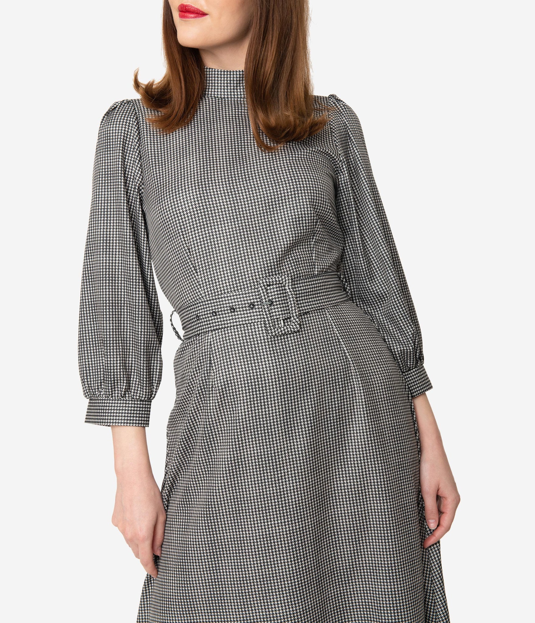 You're a sophisticated gal! This long sleeve houndstooth dress is the perfect addition to your vintage inspired wardrobe. Wide long sleeves are cinched at the wrist and a high neck accents the midi length for a full coverage look. A belt at the waist can be removed and adjusted to highlight your figure, along with darts for extra tapering at the waist and bust. A zipper in the back allows for ease of use on this fun houndstooth printed dress. Simply fabulous, darling!