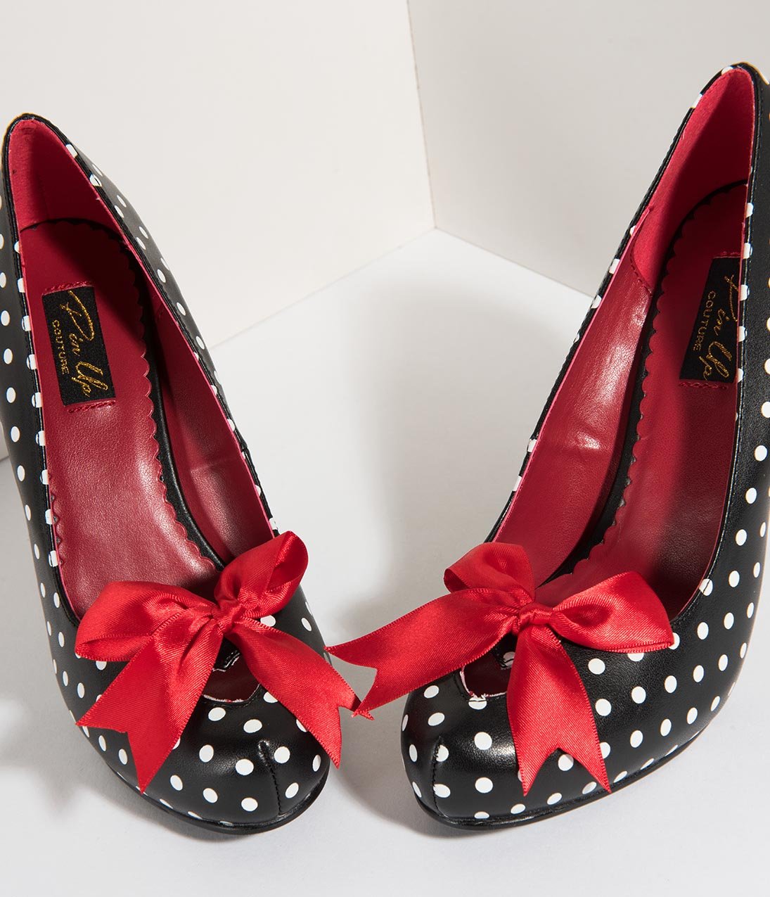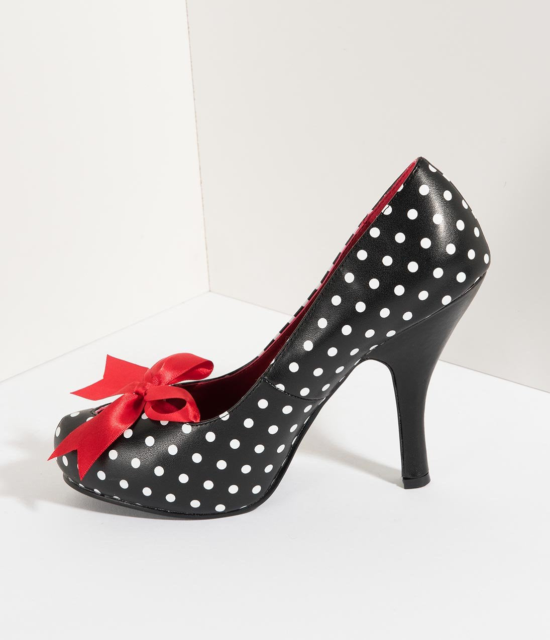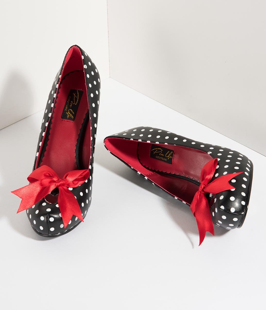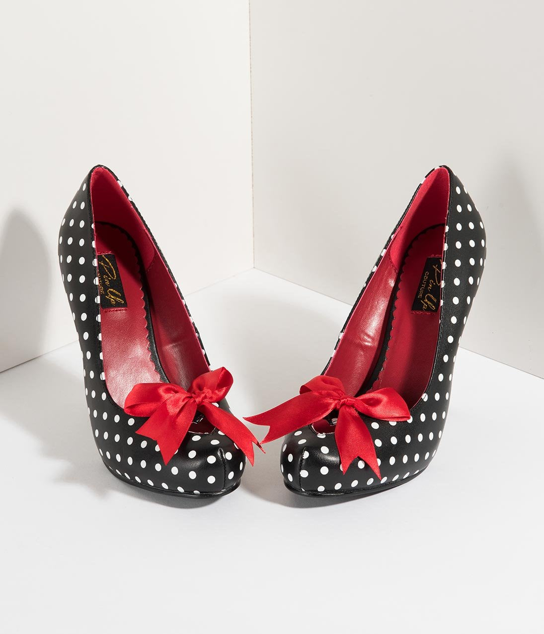 The talk of the town! Fall in love with these black leatherette pumps, dotted with white polka dots throughout while a 4.5” heel raises the stakes. A cute heart cutout on the vamp is topped by a cheerful red ribbon bow while the cushioned insole and tread keep you comfortable as you strut your stuff!