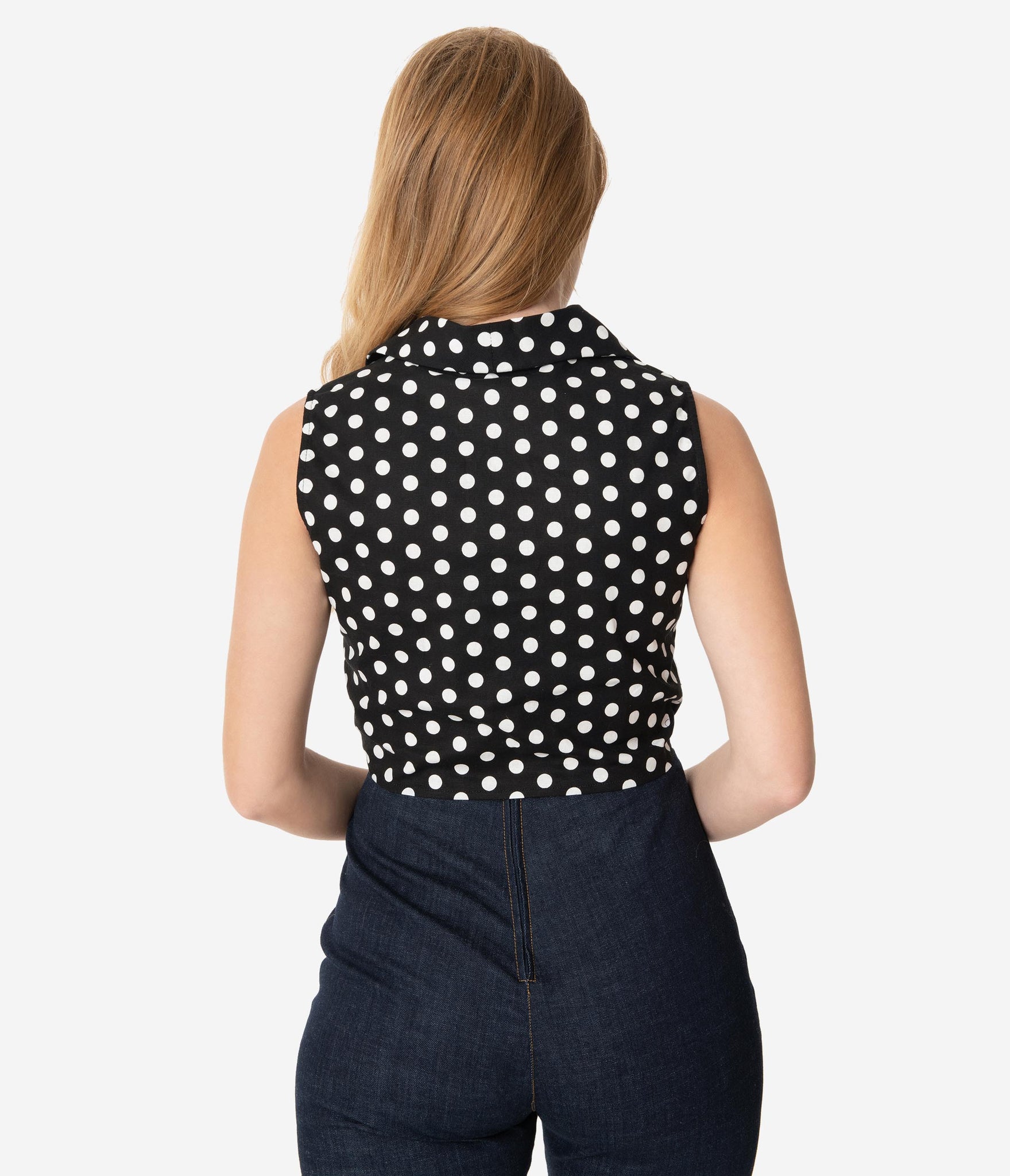 Spotted for spring, babe! This spunky black blouse is sprinkled in white polka dots across a stretch cotton knit fabric. The button up front leads to a bold collar. Bust darts add structure while a self tie at the end of the buttons allows for cinching at the waist. This sleeveless style is perfect for spring, throw on your favorite cardigan to make it season-less.